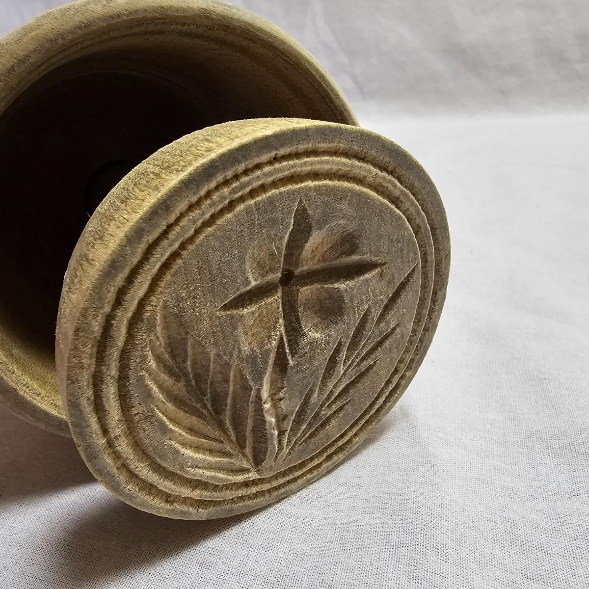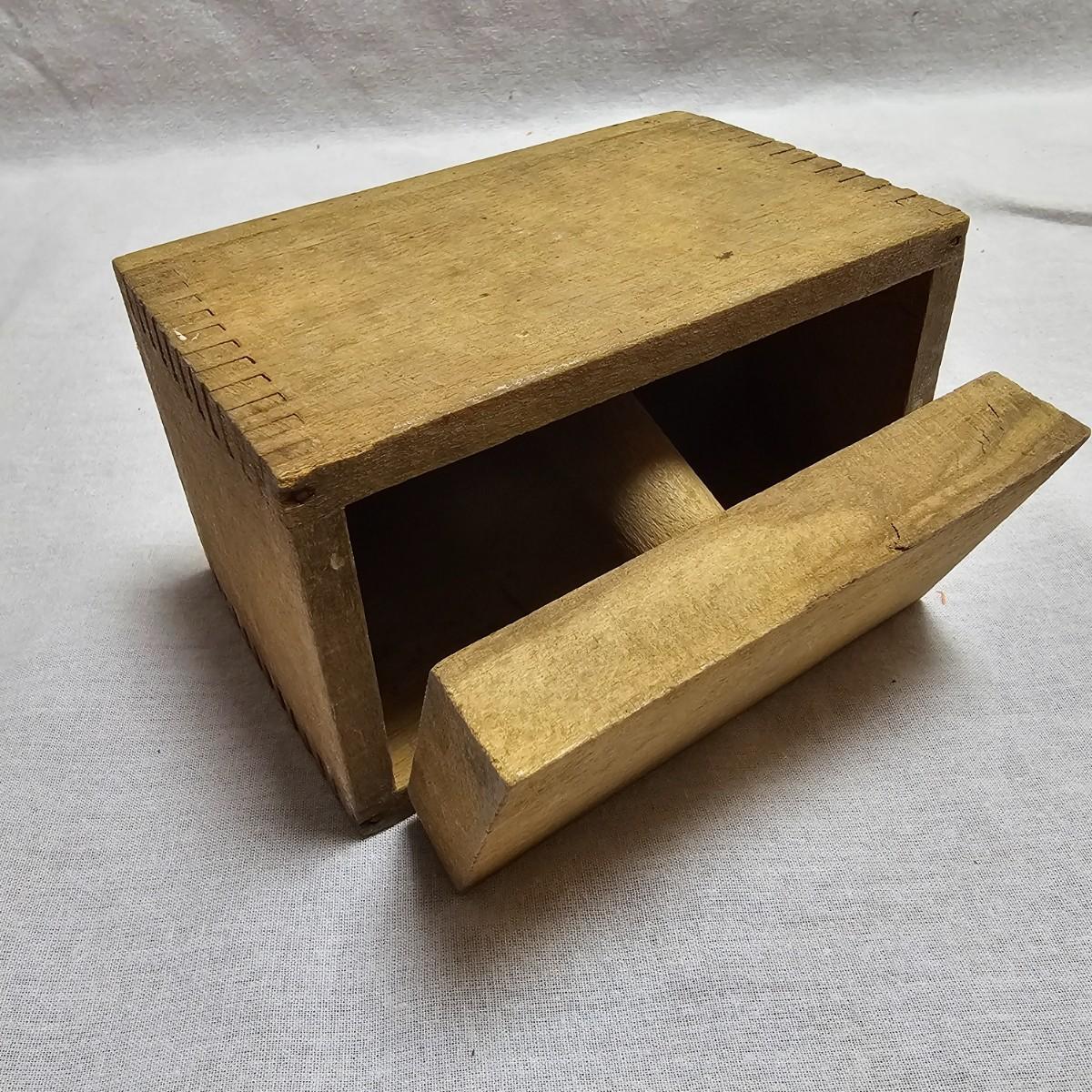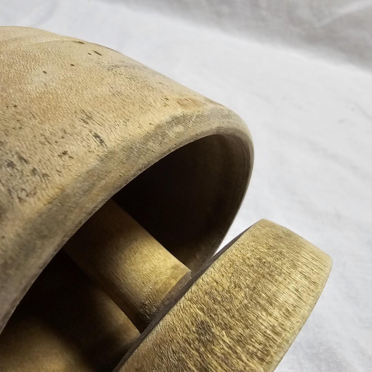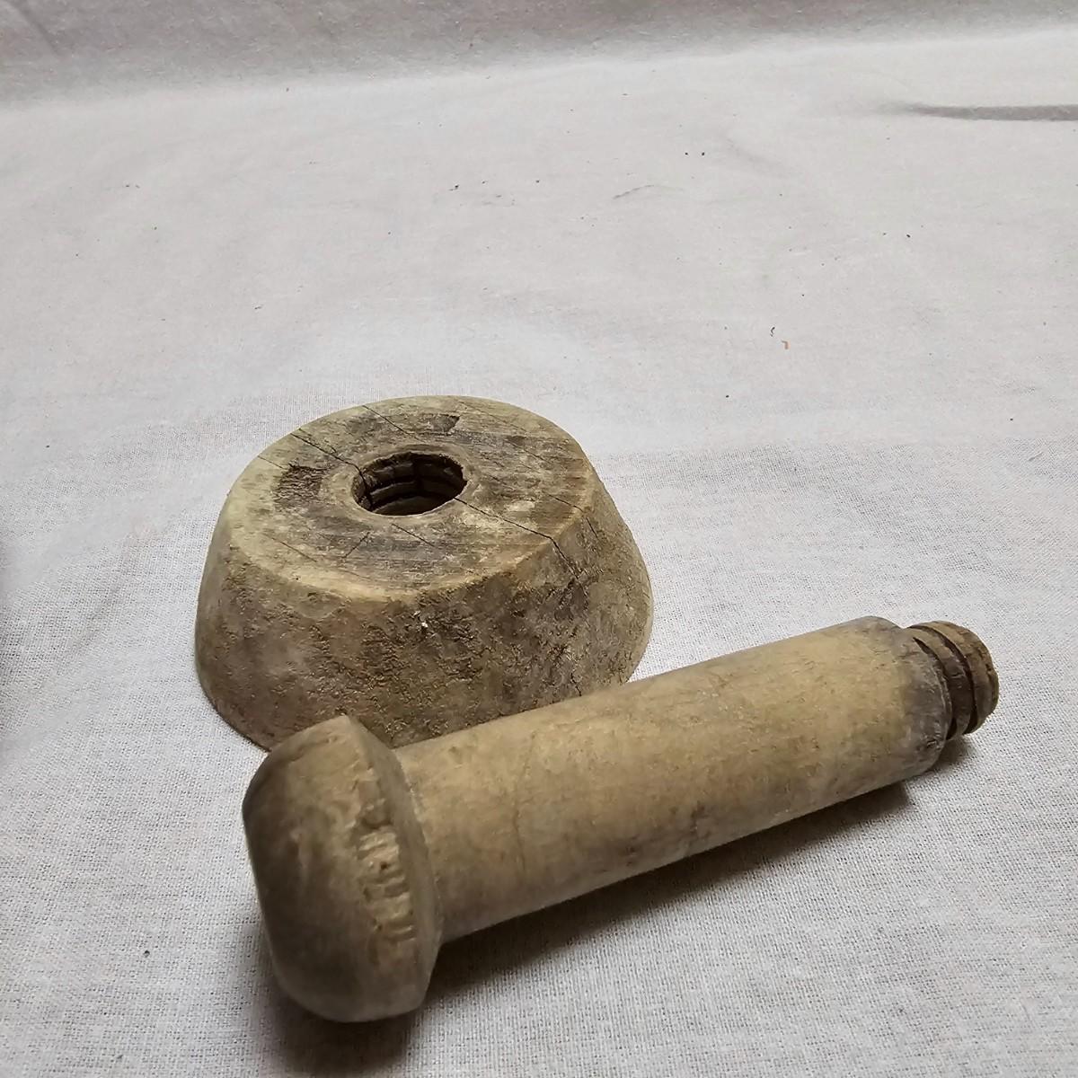 Three wooden butter molds and three canning jars. Two jars by Ball, one clear, one blue. One jar by Root, 4.5" D x 9"H. Two round butter molds, 4"D x 4"H. Carved imprint in bottom of mold piece; one mold has loose handle. Rectangular mold has lapped joints, is 3.5" x 3.25" x 3.5"H. Plain bottom, no design. Some cracks in the wood; see photos for details. Shipping available.