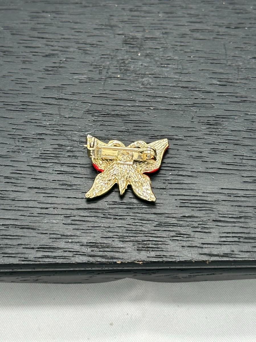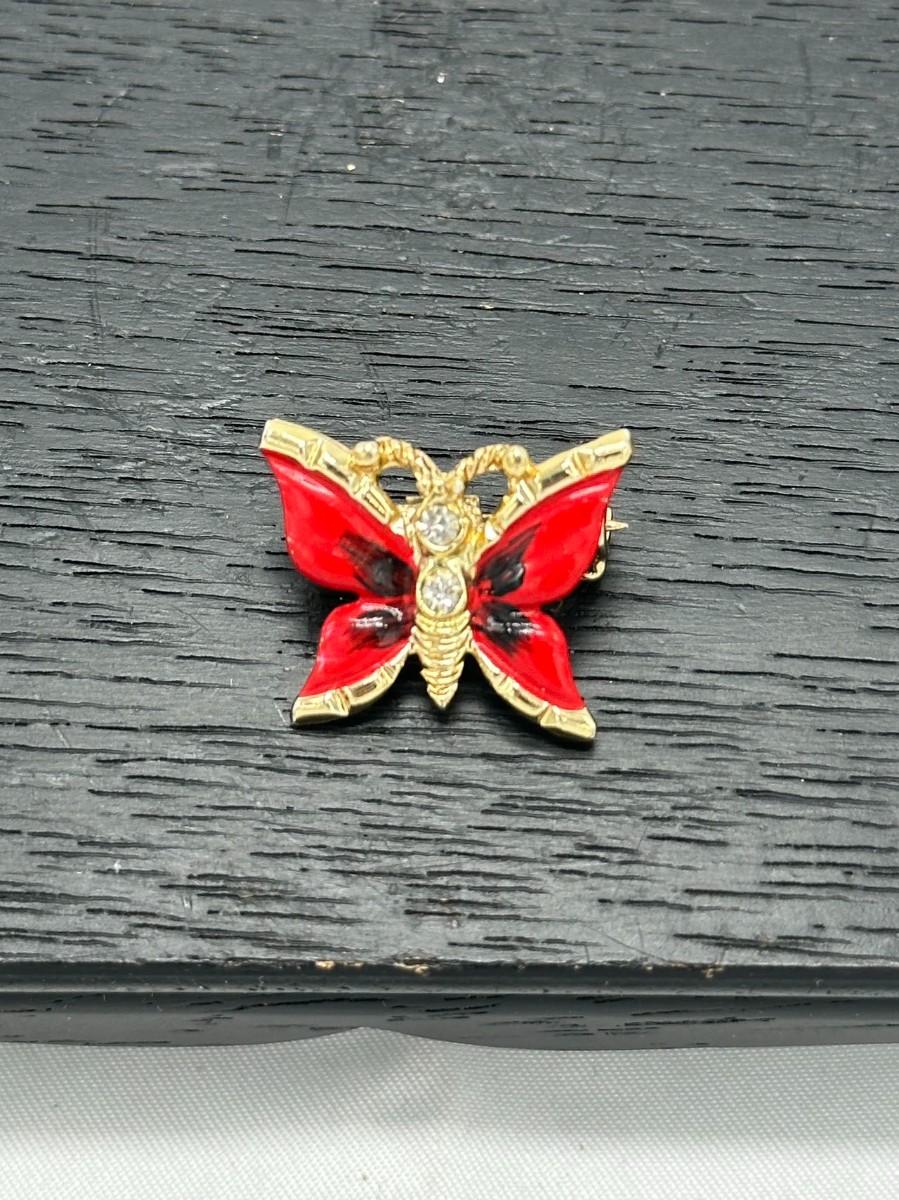 Vintage Butterfly Pin Red Hand Painted Enamel Clear Stones Pendant Brooch 1"