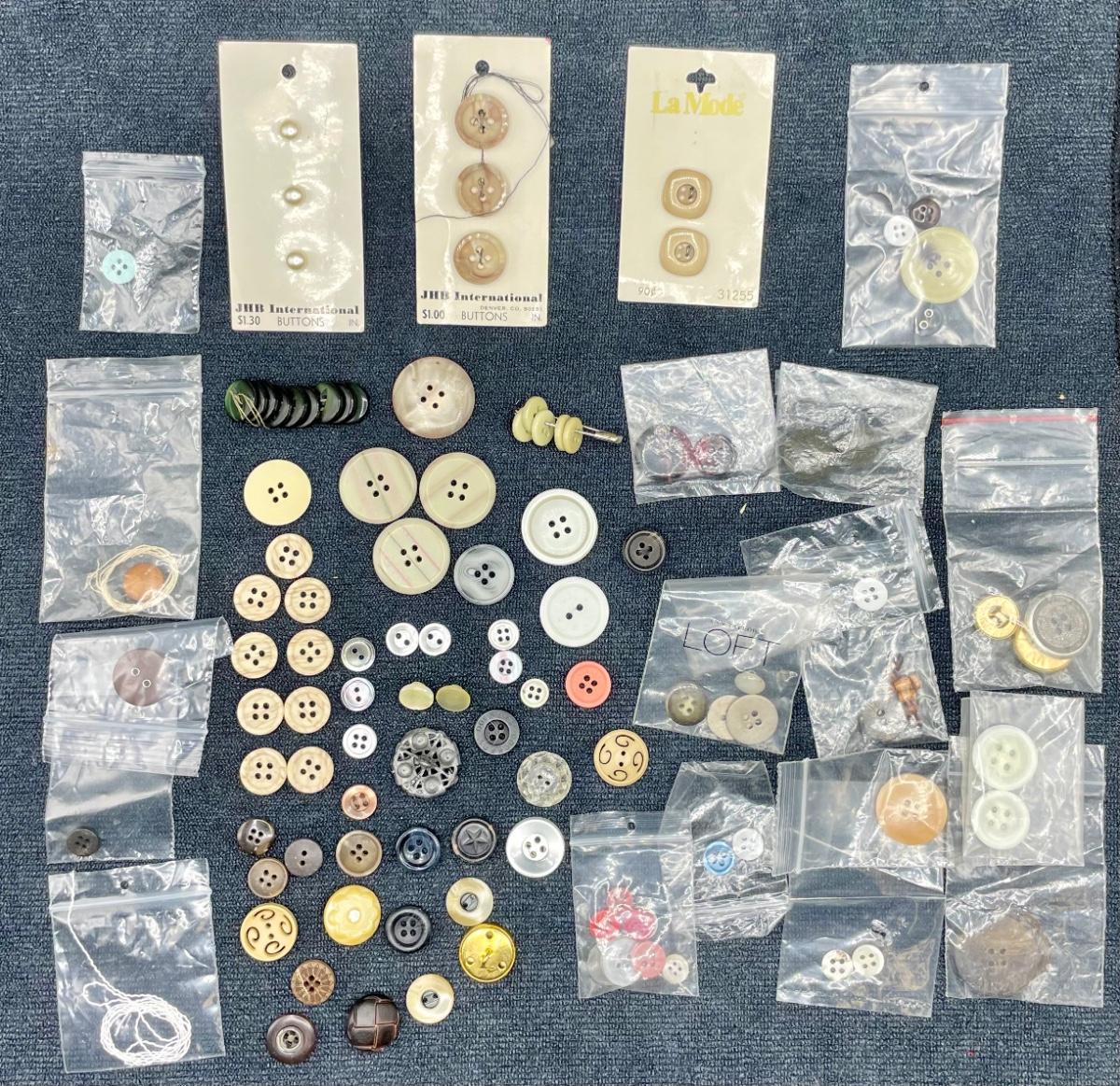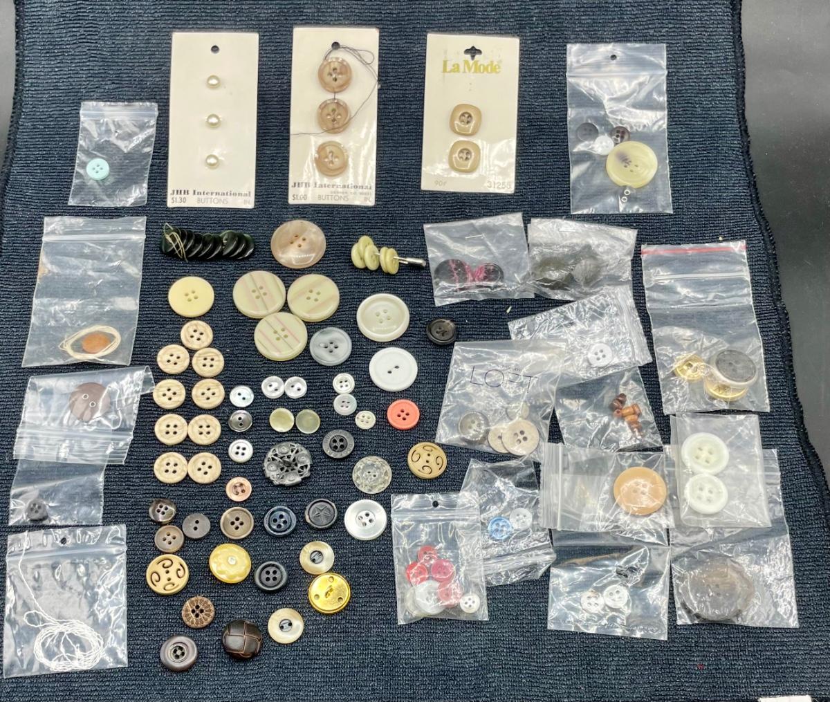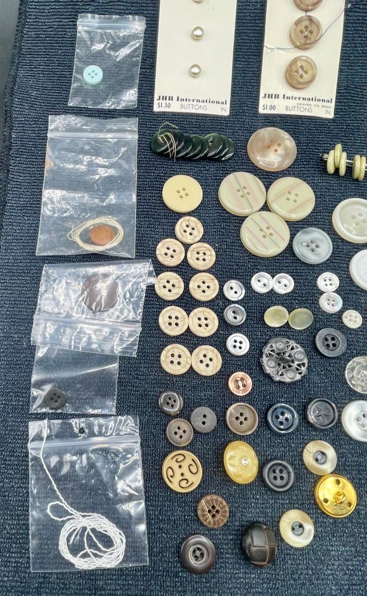 At least 100 assorted vintage buttons. Some in plastic or attached to cards.