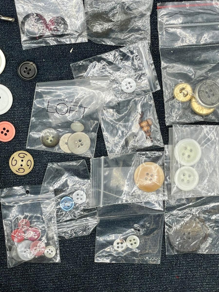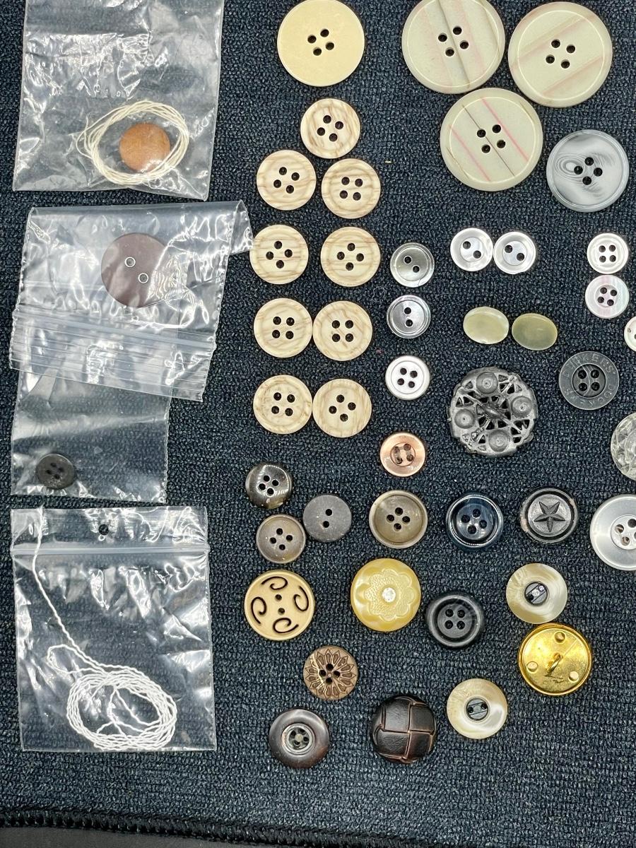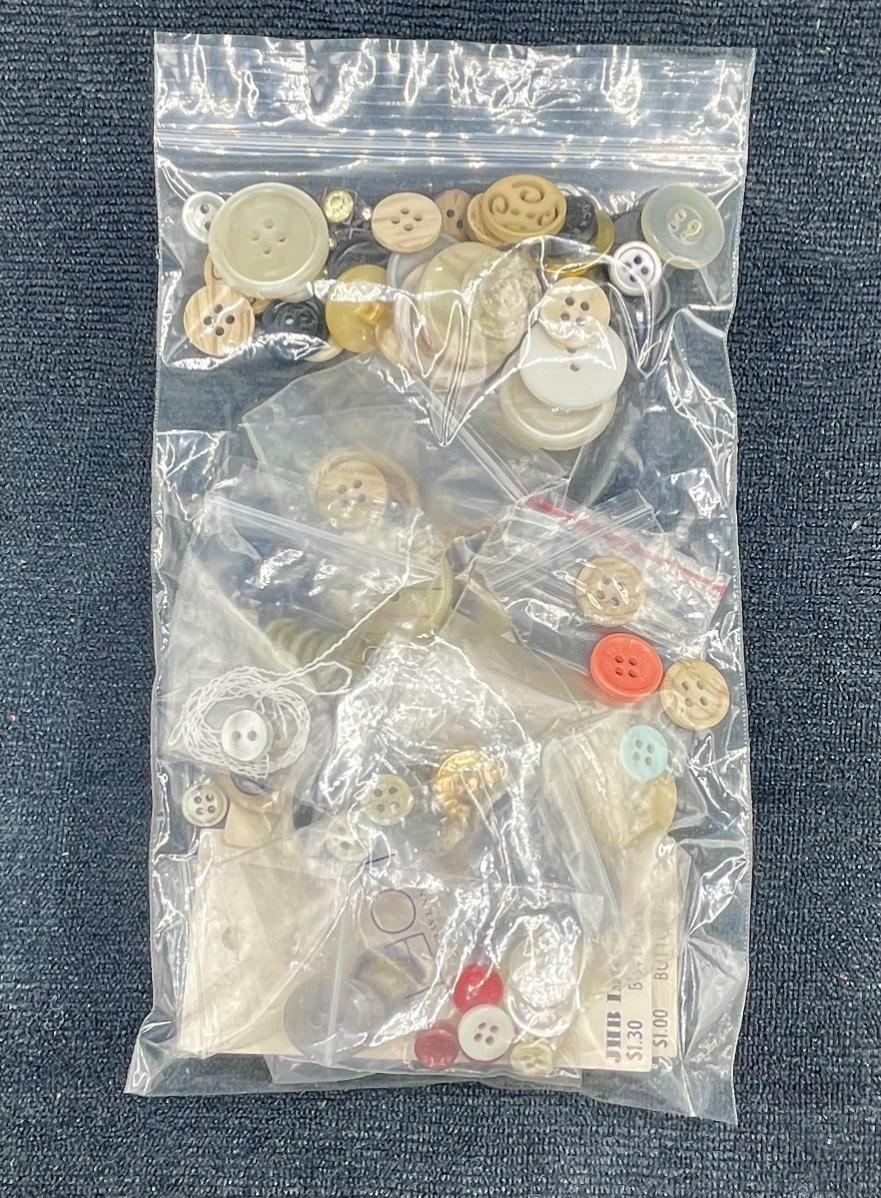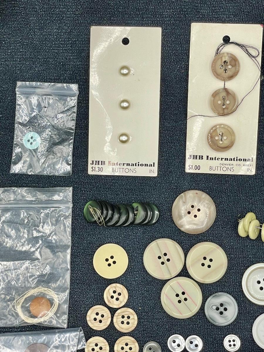 At least 100 assorted vintage buttons. Some in plastic or attached to cards.