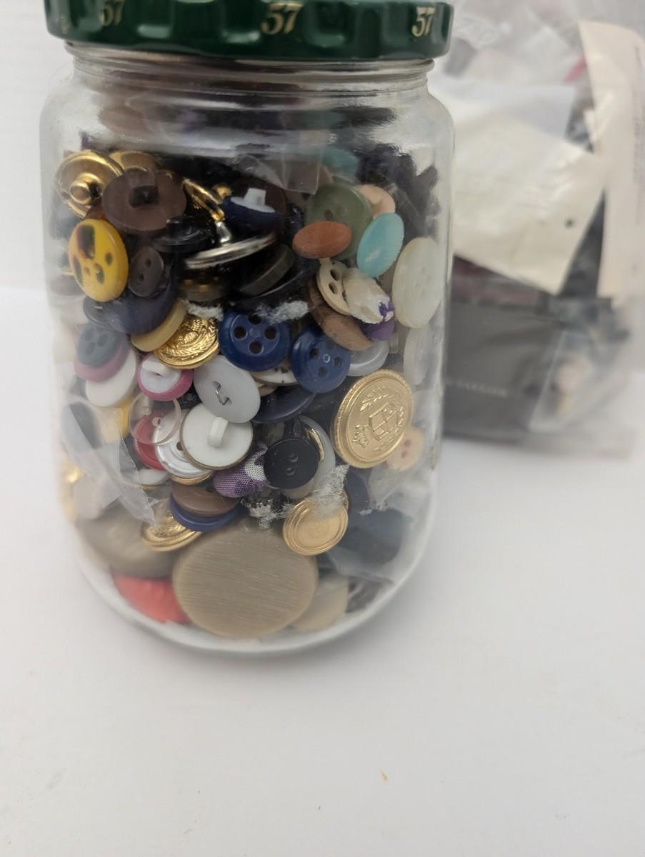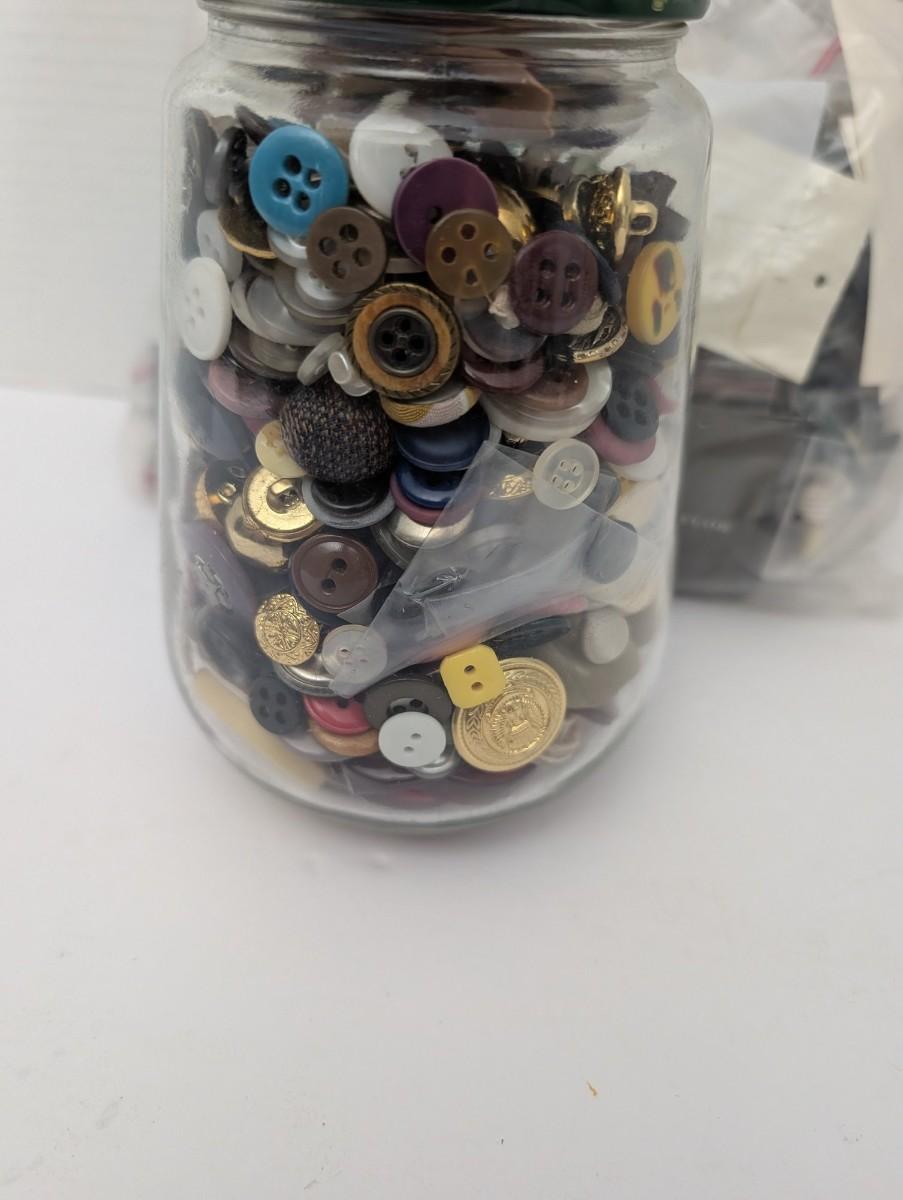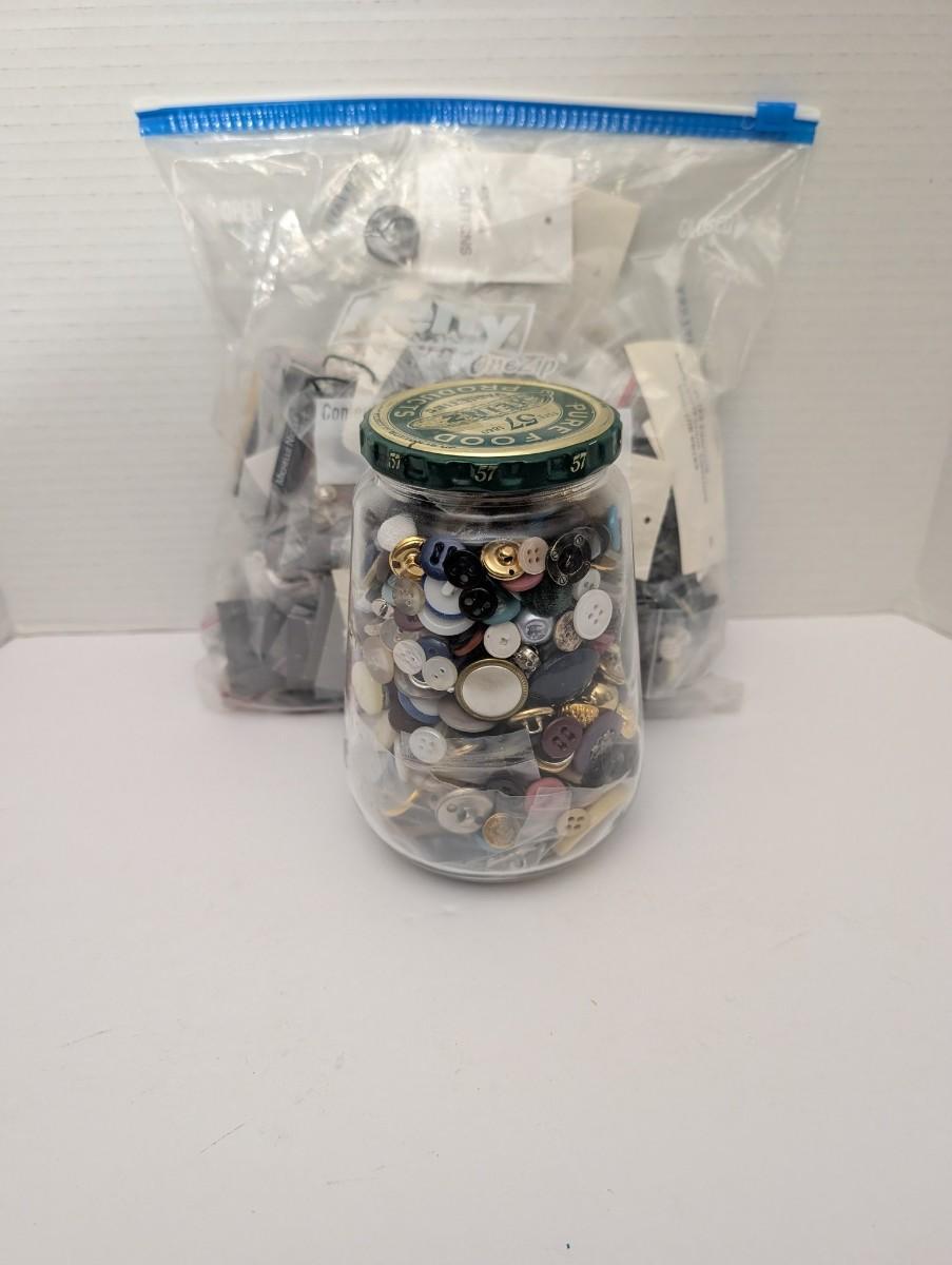 Large mixed lot of vintage and modern sewing buttons including a full jar of assorted styles and a gallon bag of extras with original spare button packets from brands such as Ann Taylor and more. Variety of colors, sizes, and materials, great for sewing, crafts, or button collecting.