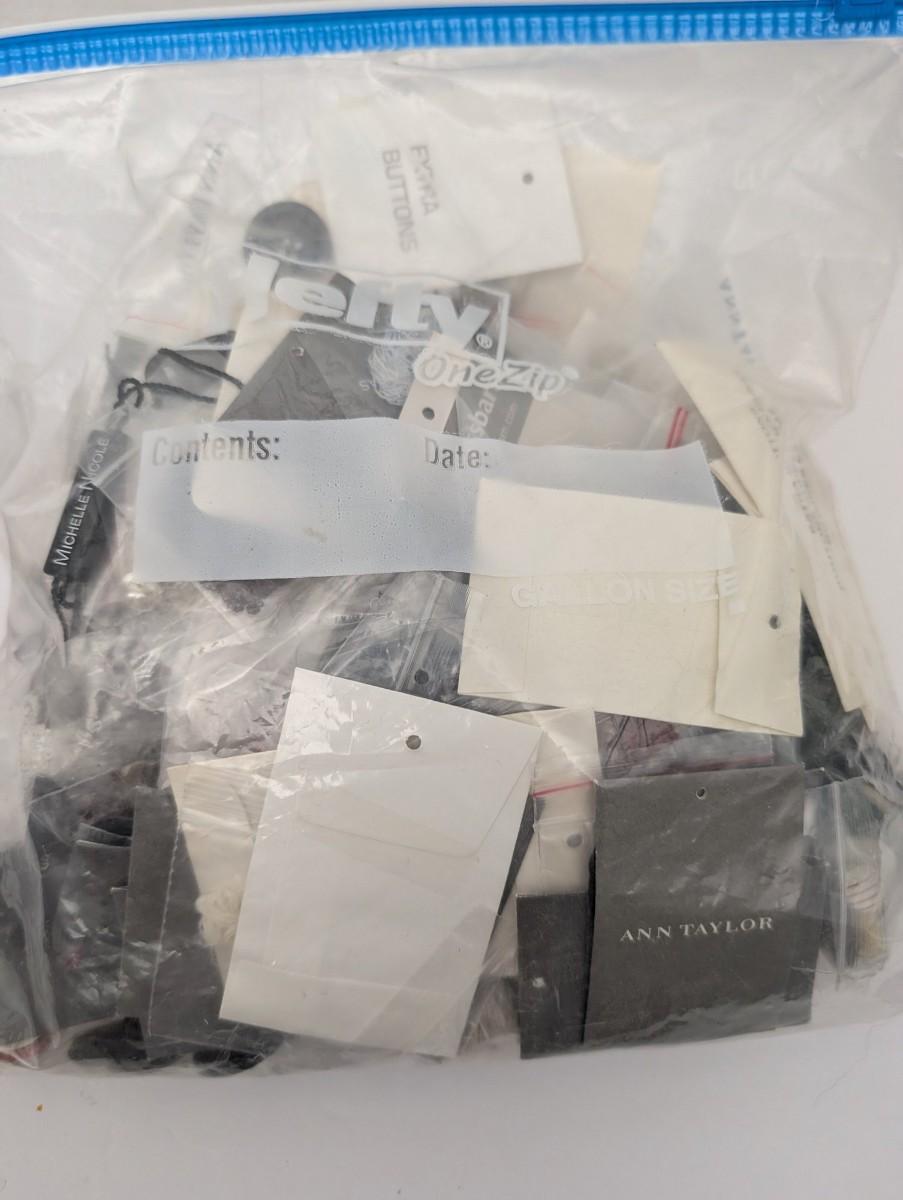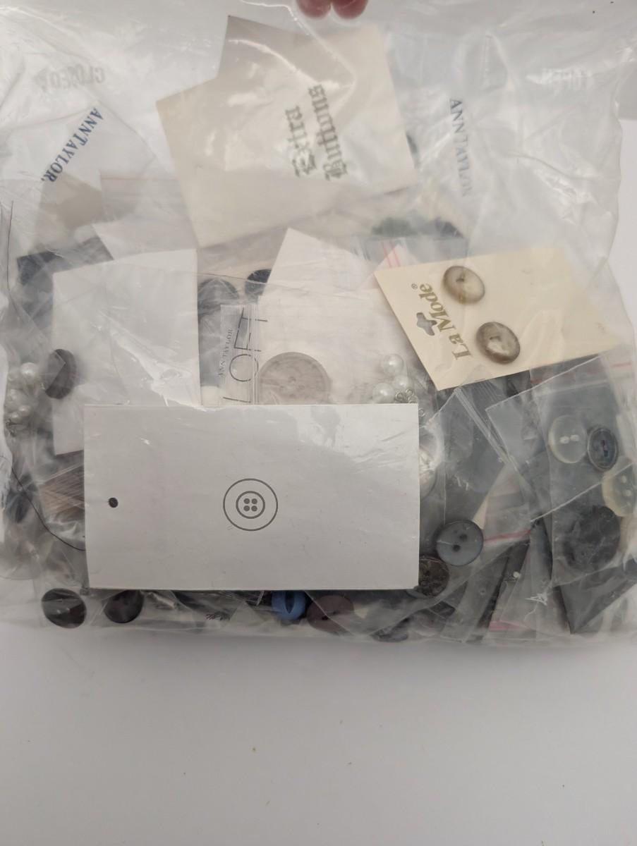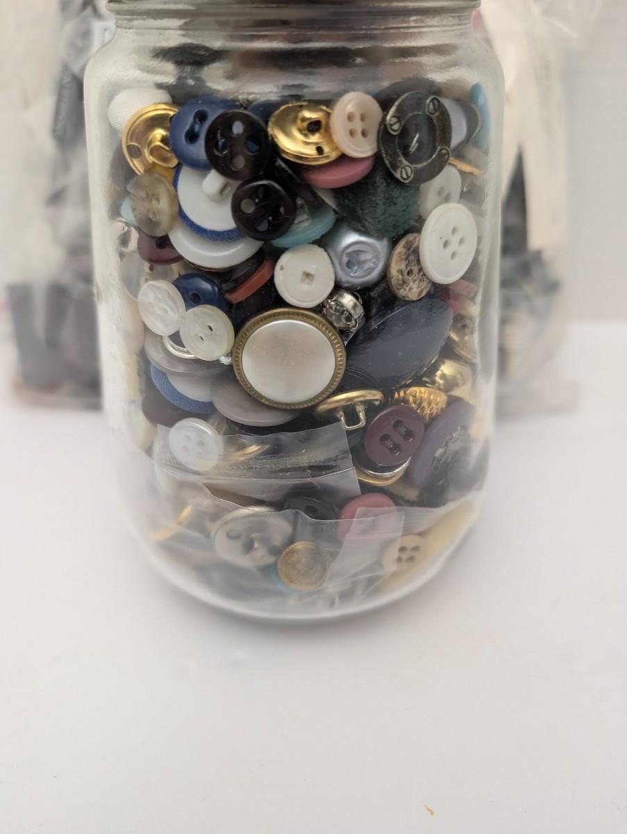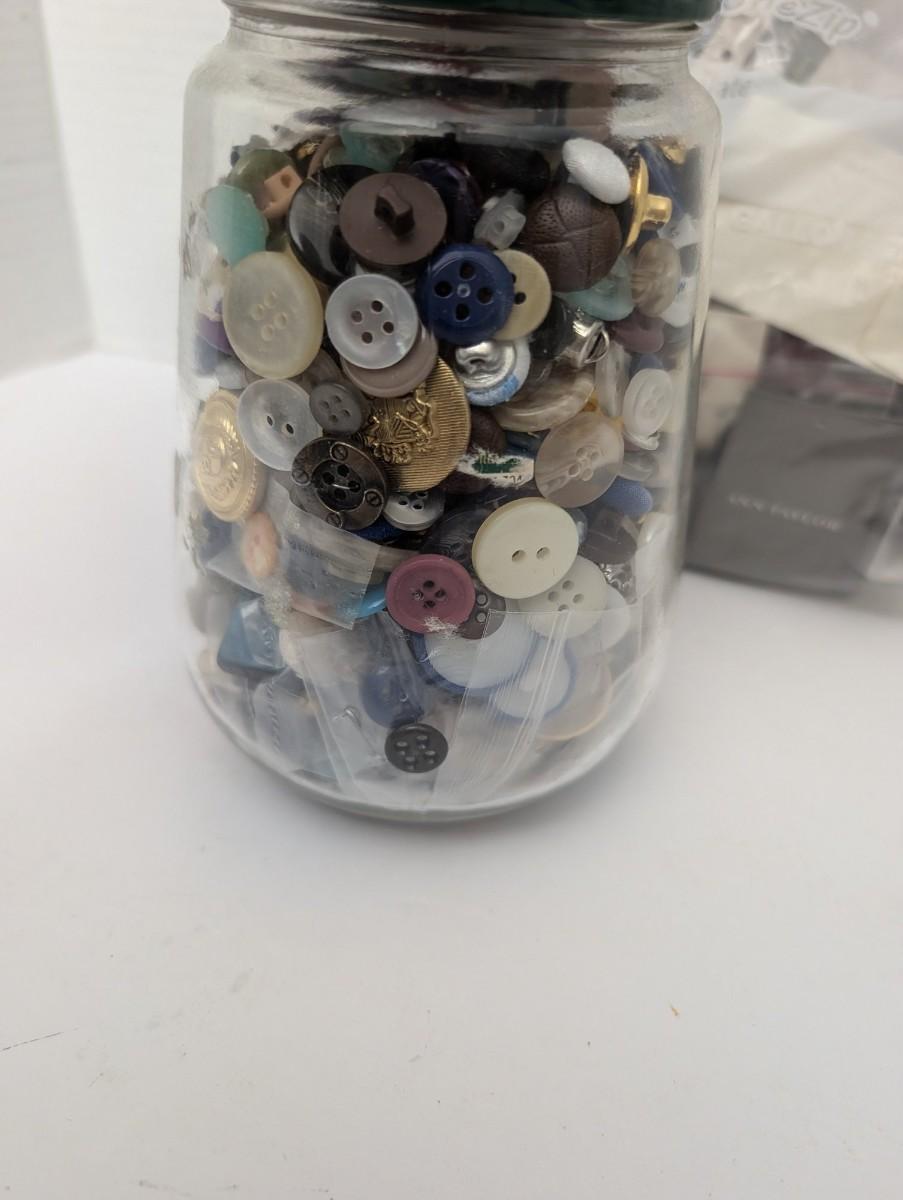 Large mixed lot of vintage and modern sewing buttons including a full jar of assorted styles and a gallon bag of extras with original spare button packets from brands such as Ann Taylor and more. Variety of colors, sizes, and materials, great for sewing, crafts, or button collecting.