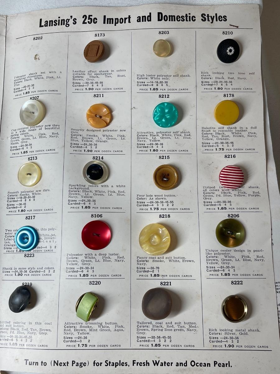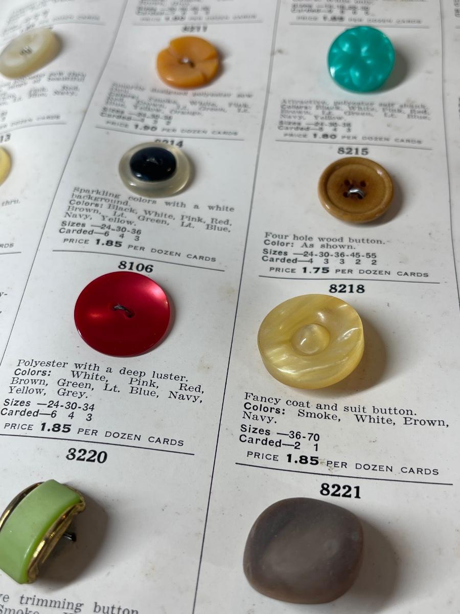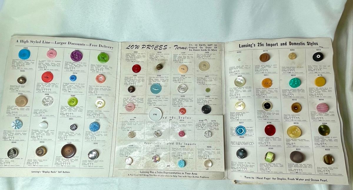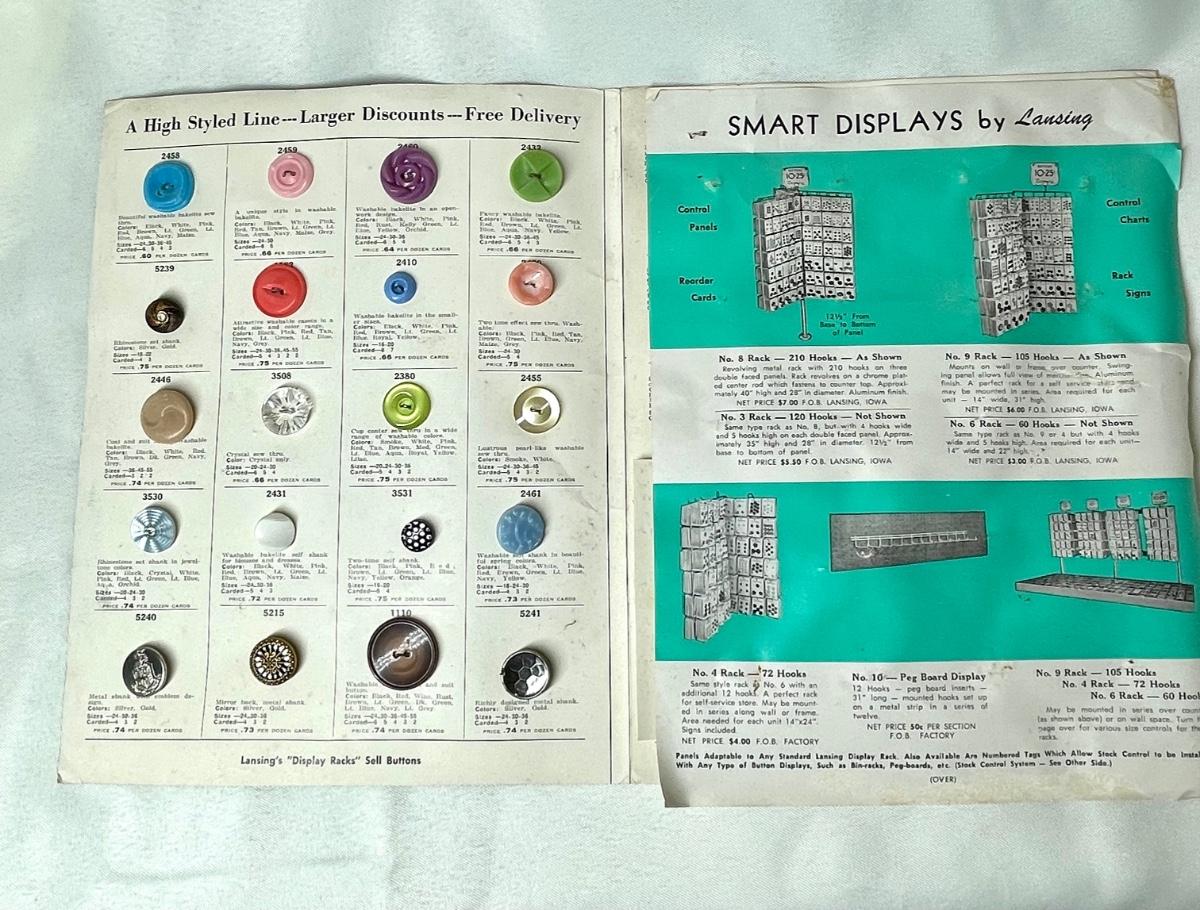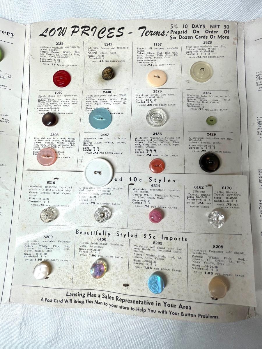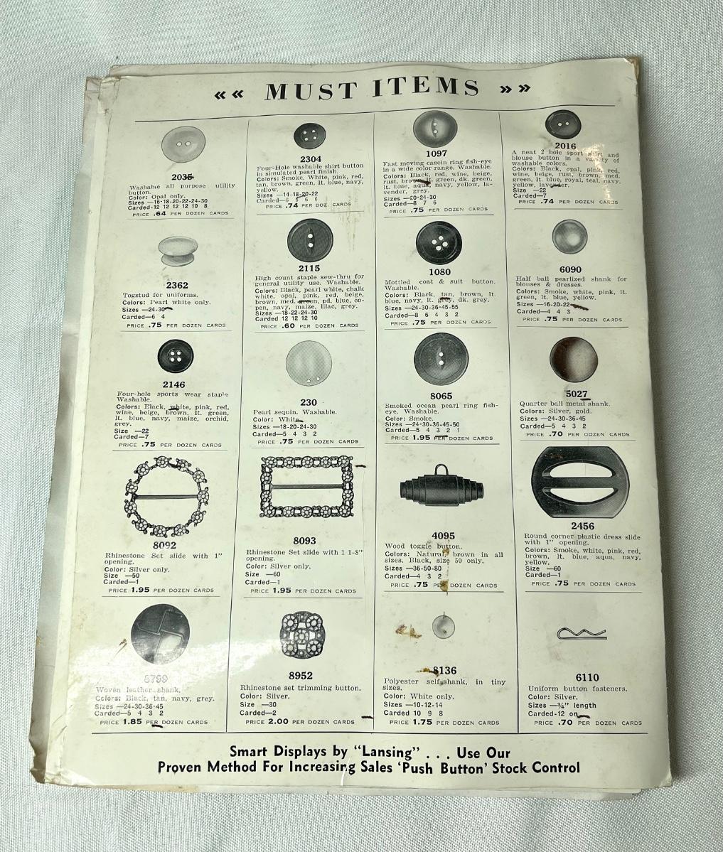 What a cool piece for a button collector! This shows a myriad of buttons you could Oder during the 1950s. Any button collector would love this. There is discoloration and some dirt and dust covering the pages. This has been in storage for a long time. I’m sure you could clean it up some. I’ll leave that to the buyer. Cool vintage item for sure!