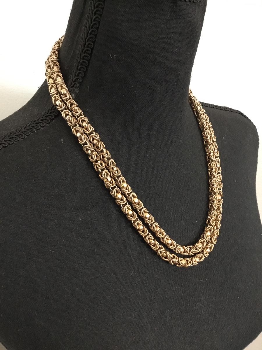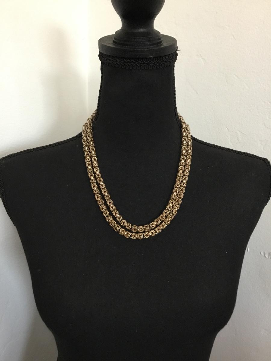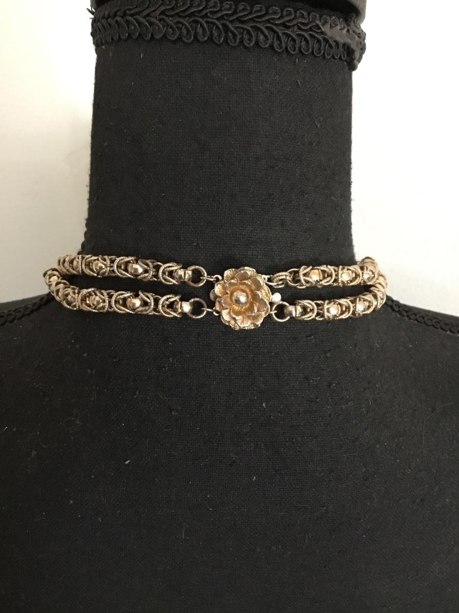 Vintage Byzantine Gold, toned, chain, double strand necklace with flower clasp has, wear due to age