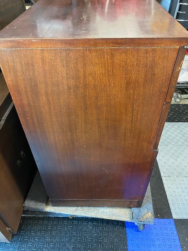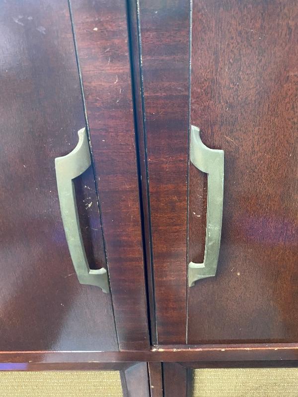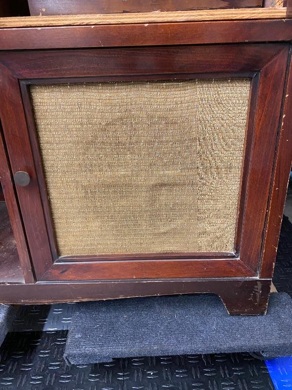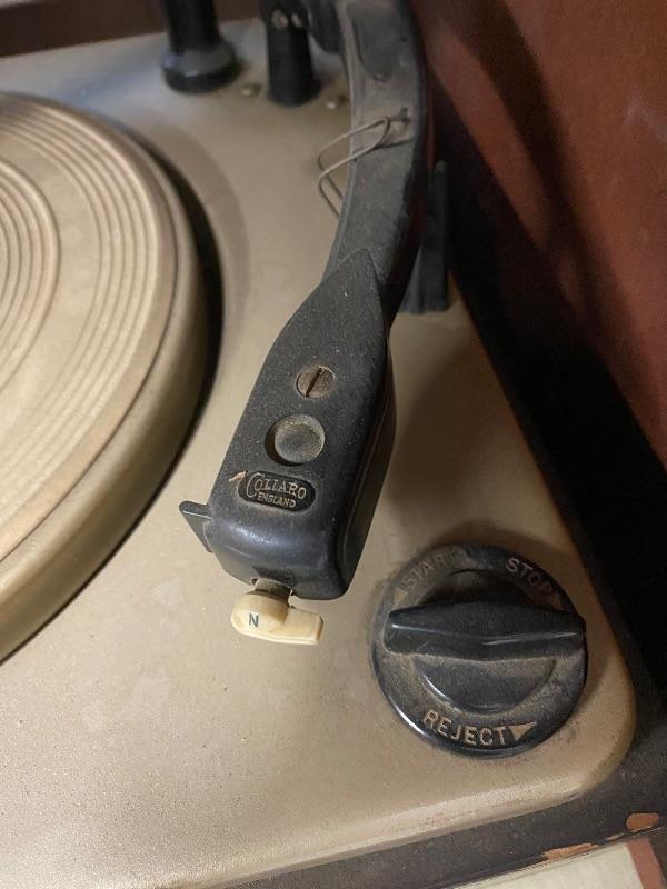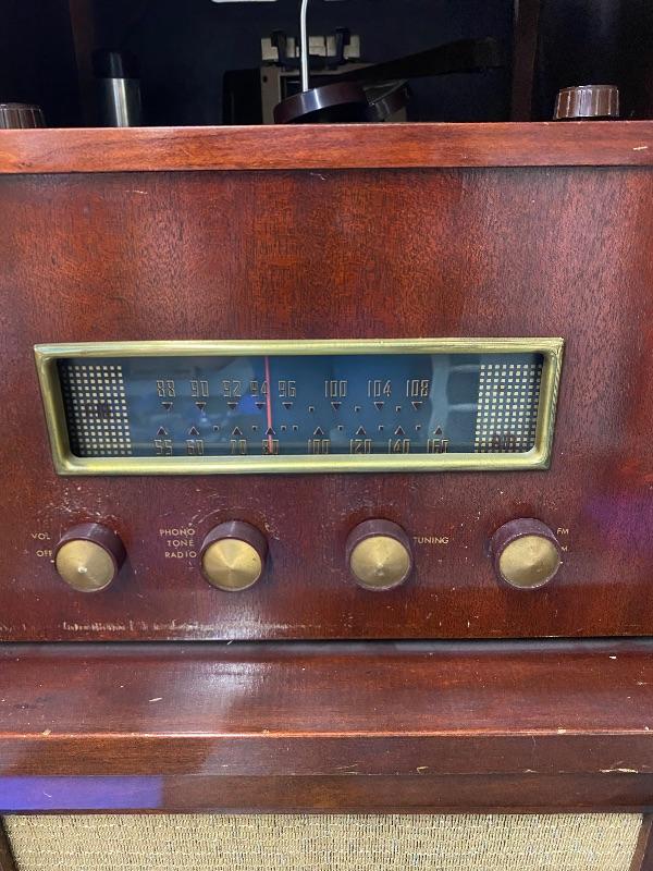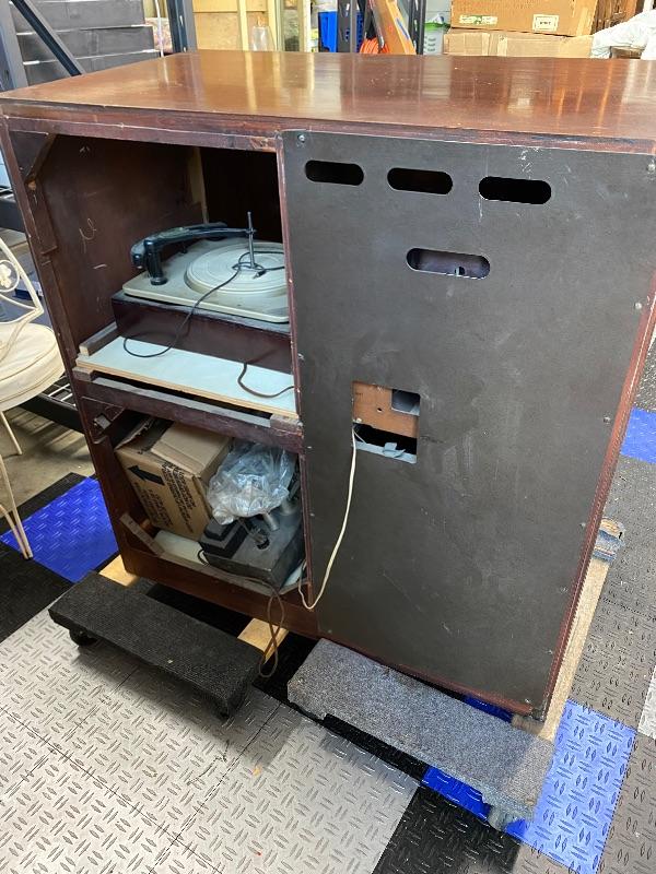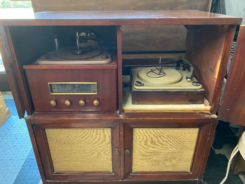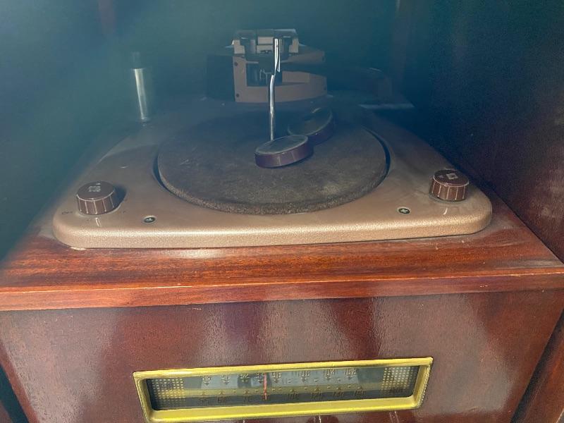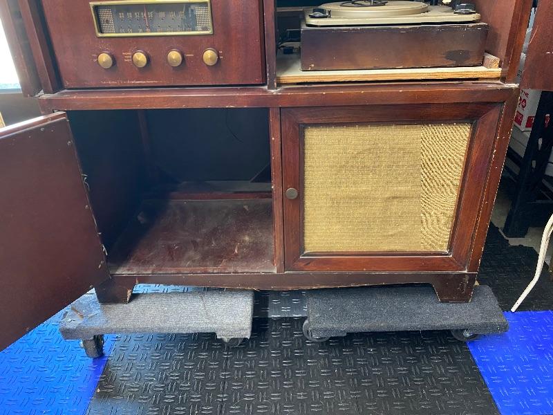 Vintage cabinet radio with two turntable record players. Unsure of working condition. Nice cabinet. One of the record players has the name "Collaro" on the arm. Measures 36x21x38.