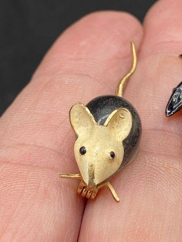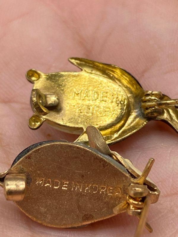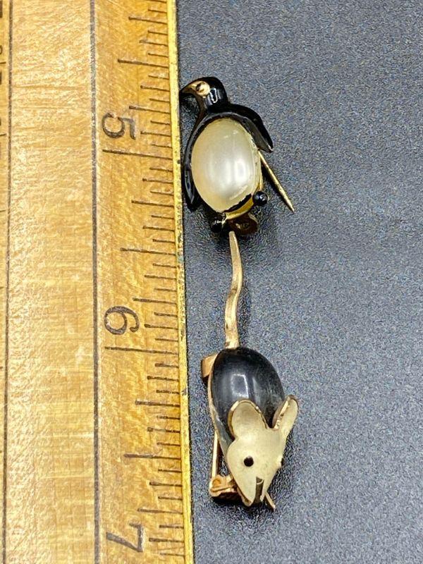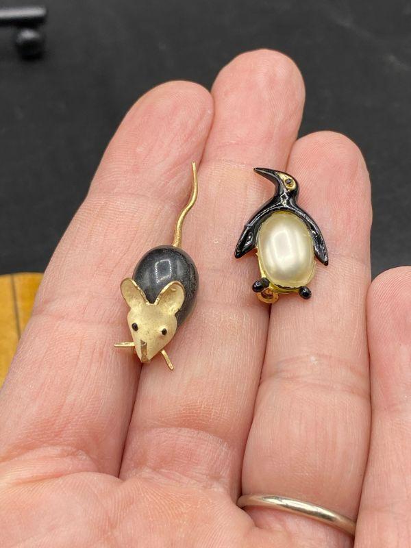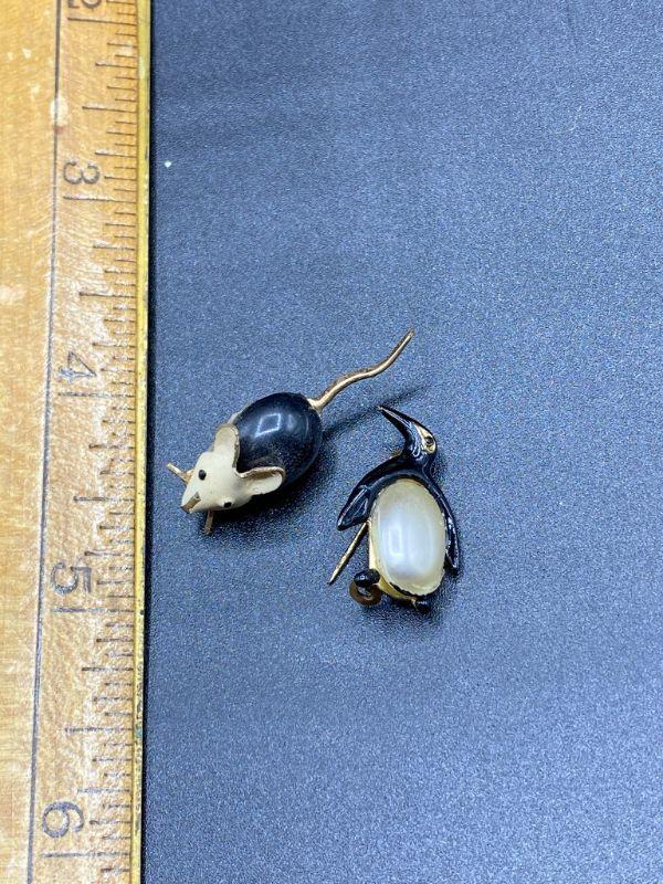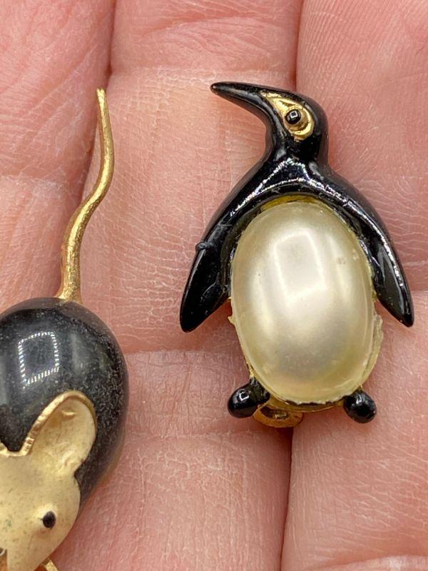 Pair of vintage animal pins, a mouse and a penguin. Pearlized cabochon bodies in gold tone settings. Made in Korea. About 1" to 1.5" in size.