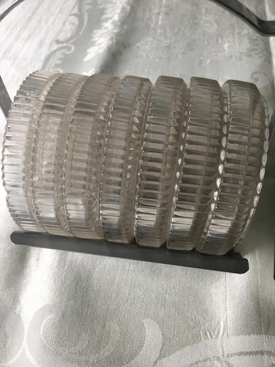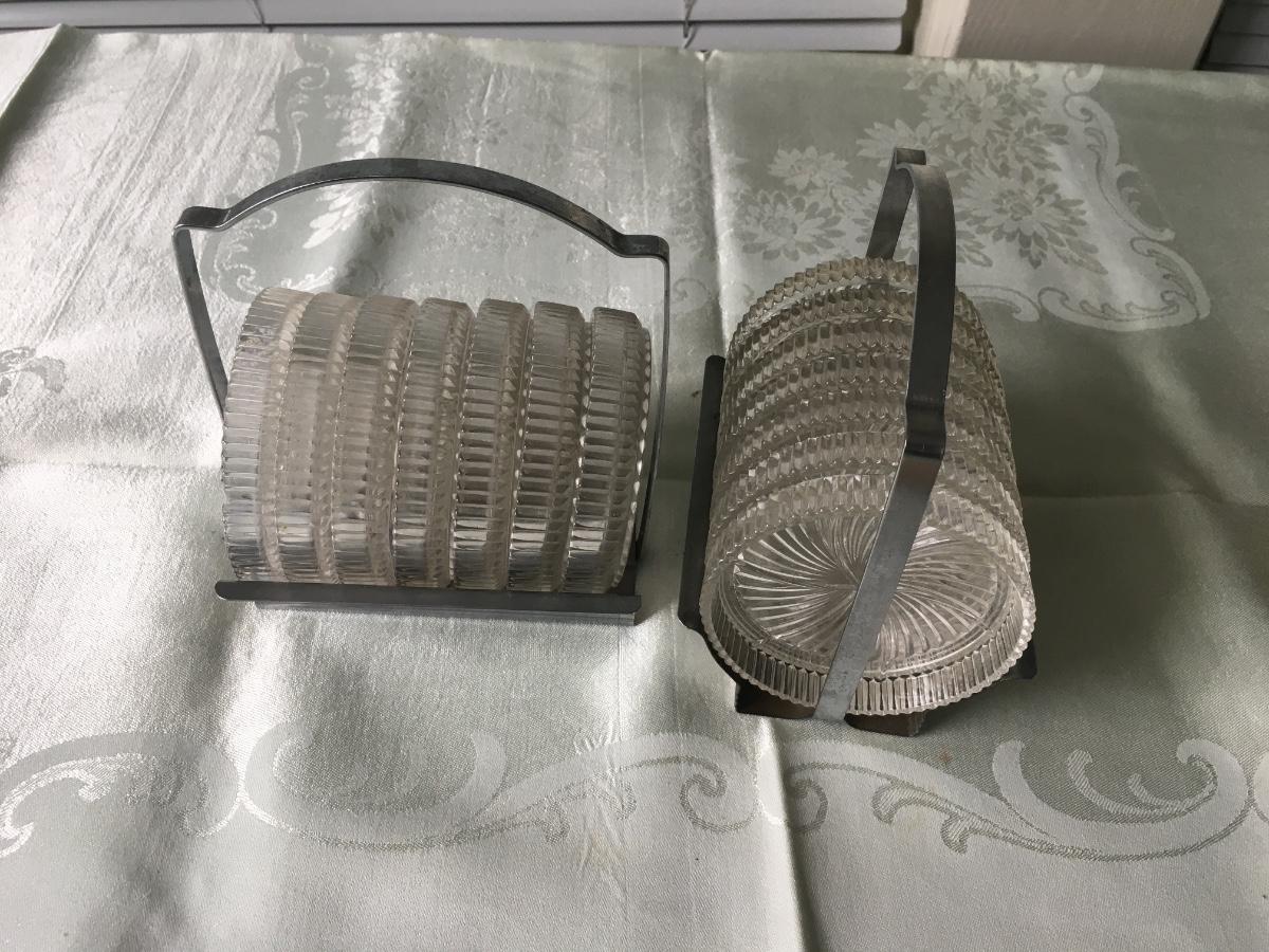 2 metal caddies, each holding 7 heavyweight glass coasters.