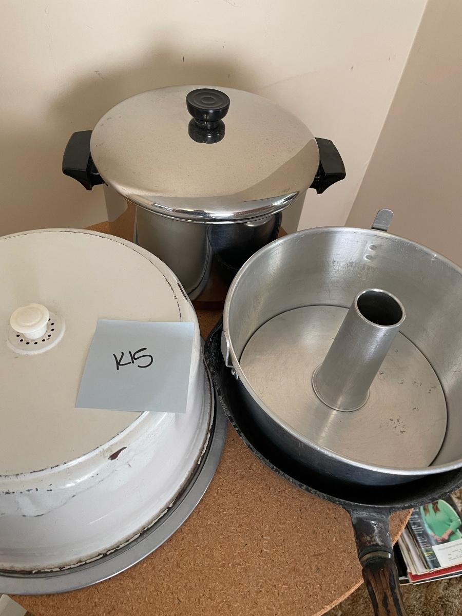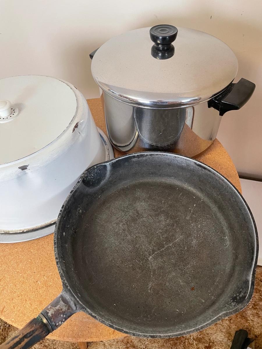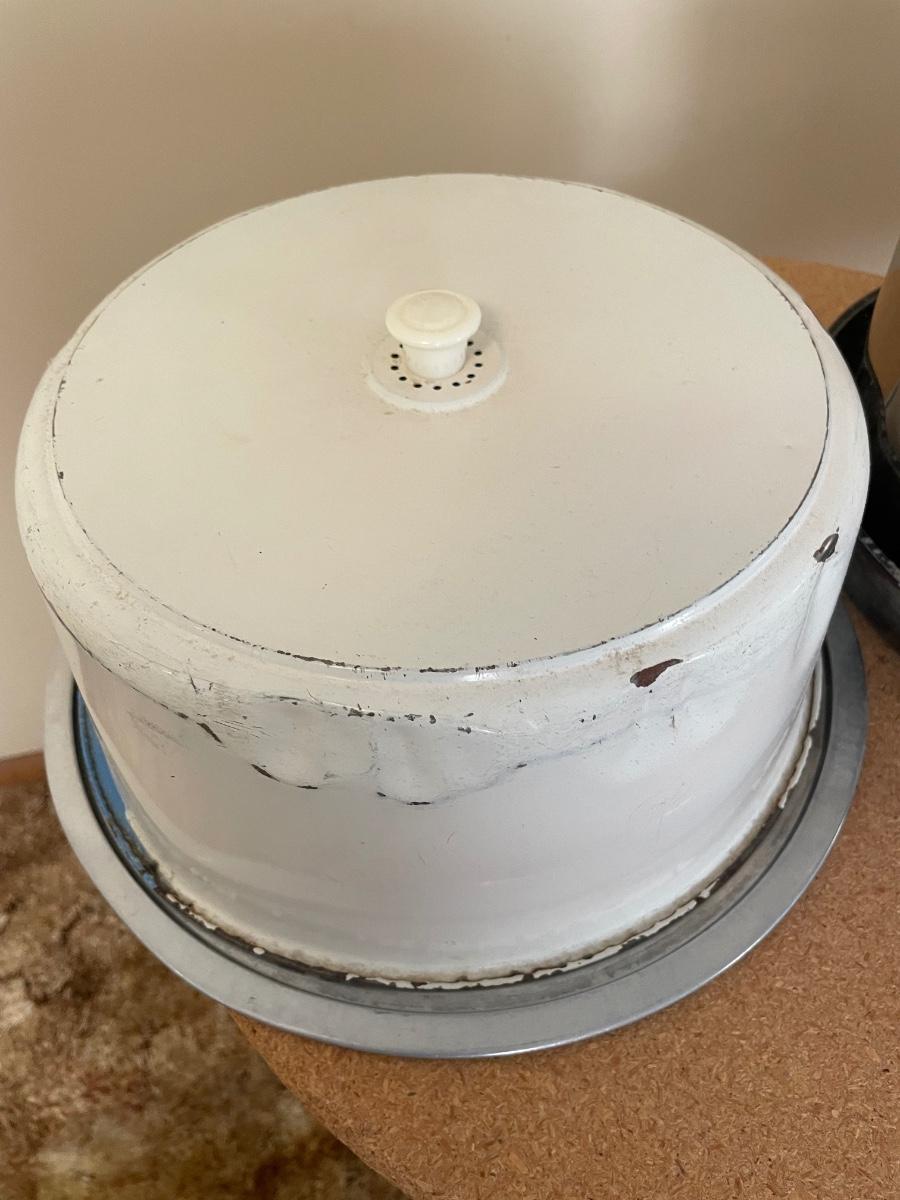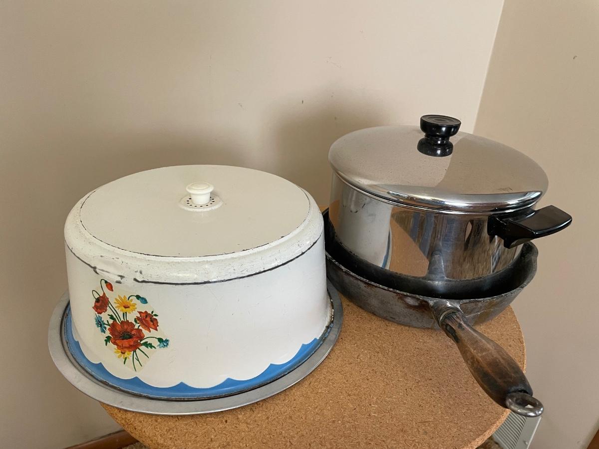 Vintage cake holder, cast iron pan, pot and cake