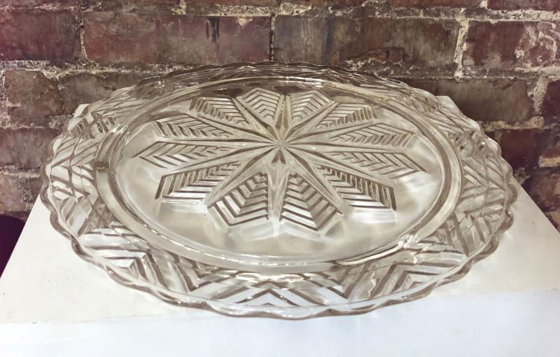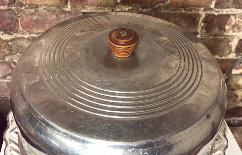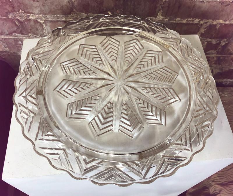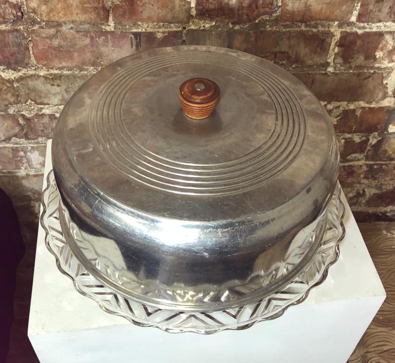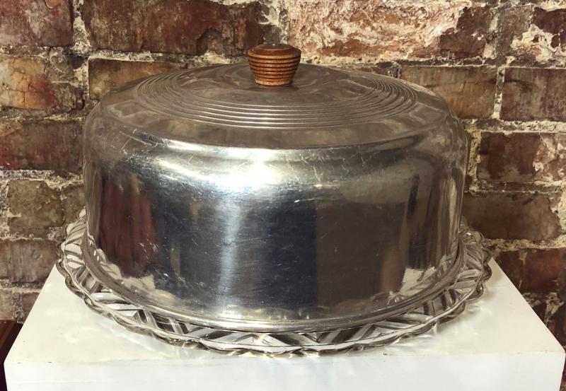 Here is a lightly used vintage footed glass cake plate with an aluminum and wooden handle cake cover..circa 1940's-50's...Diameter is 11 1/2"...