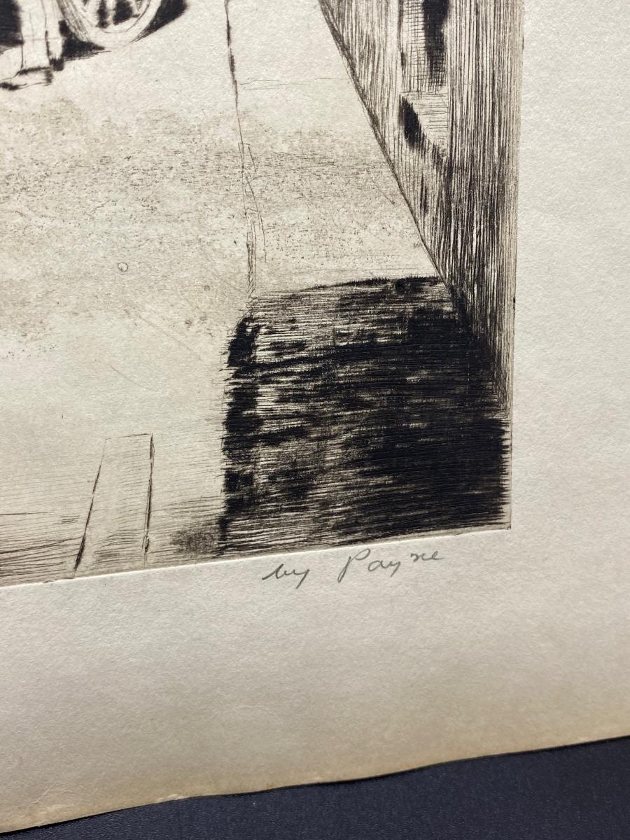Vintage etching wall art by California artist Raymond Payne. Titled "Old Panama". In good aged condition, there is some discolor to the paper from age. Unframed about 12"x13" size. The title and signature are not in the artist's handwriting, they are from the previous owner who previously owned a custom framing studio that collected and sold art through the years.