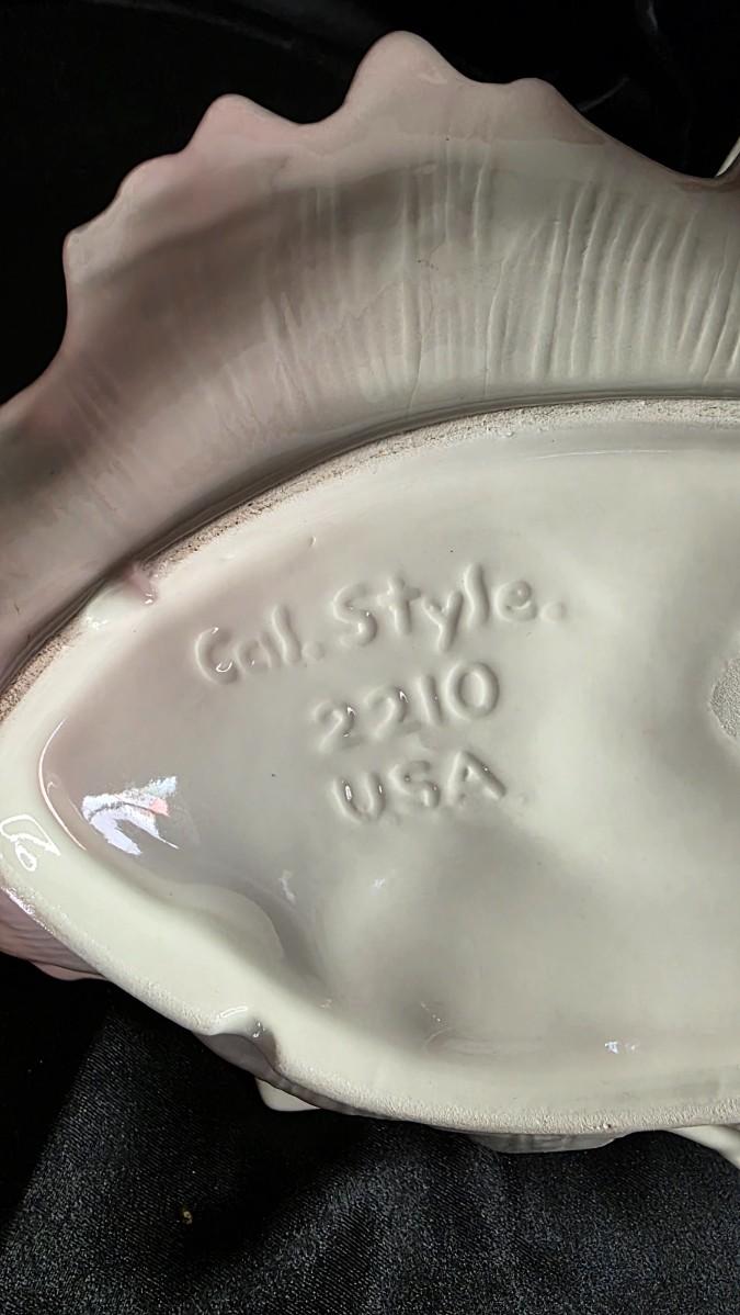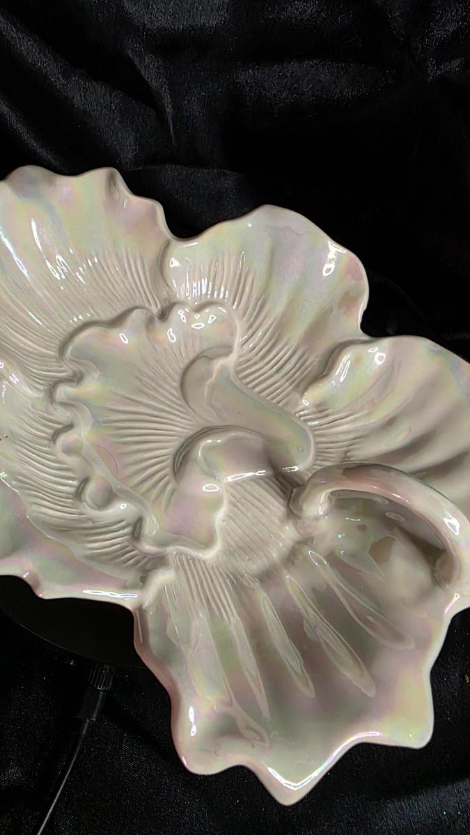 A beautifully sculpted piece of mid-century California pottery, this vintage California Original Style 2210 ceramic leaf dish brings a graceful, organic elegance to any display. Shaped like a flowing leaf with layered ridges and gentle folds, it carries a soft iridescent glaze that shifts delicately between pastel pinks, greens, creams, and pearlescent tones. The finish gives the dish a luminous, almost ethereal quality, catching the light in a way that highlights its sculptural form.