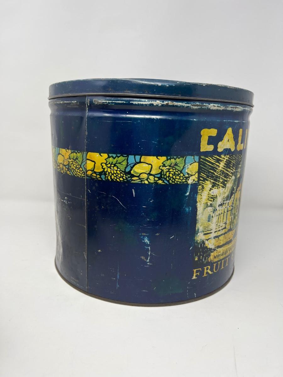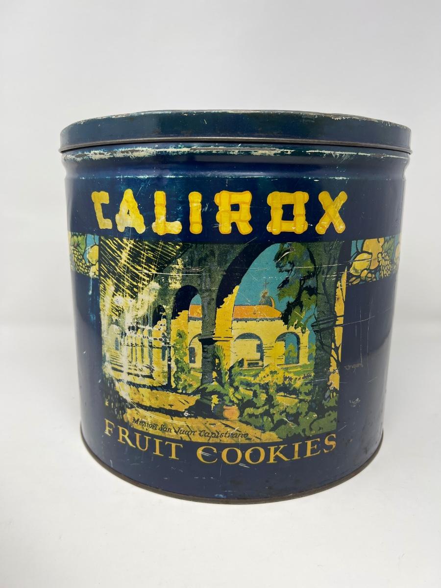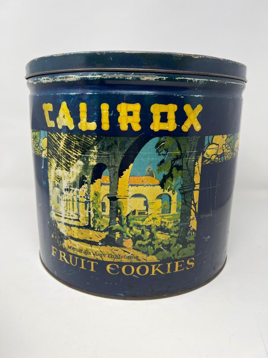 Calirox brand lidded metal tin 9.5” tall and 11” round. Lots of aged character.