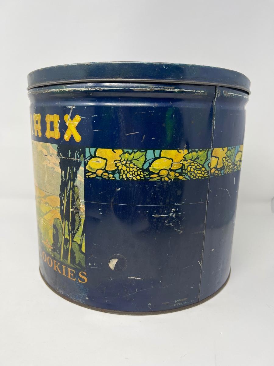 Calirox brand lidded metal tin 9.5” tall and 11” round. Lots of aged character.