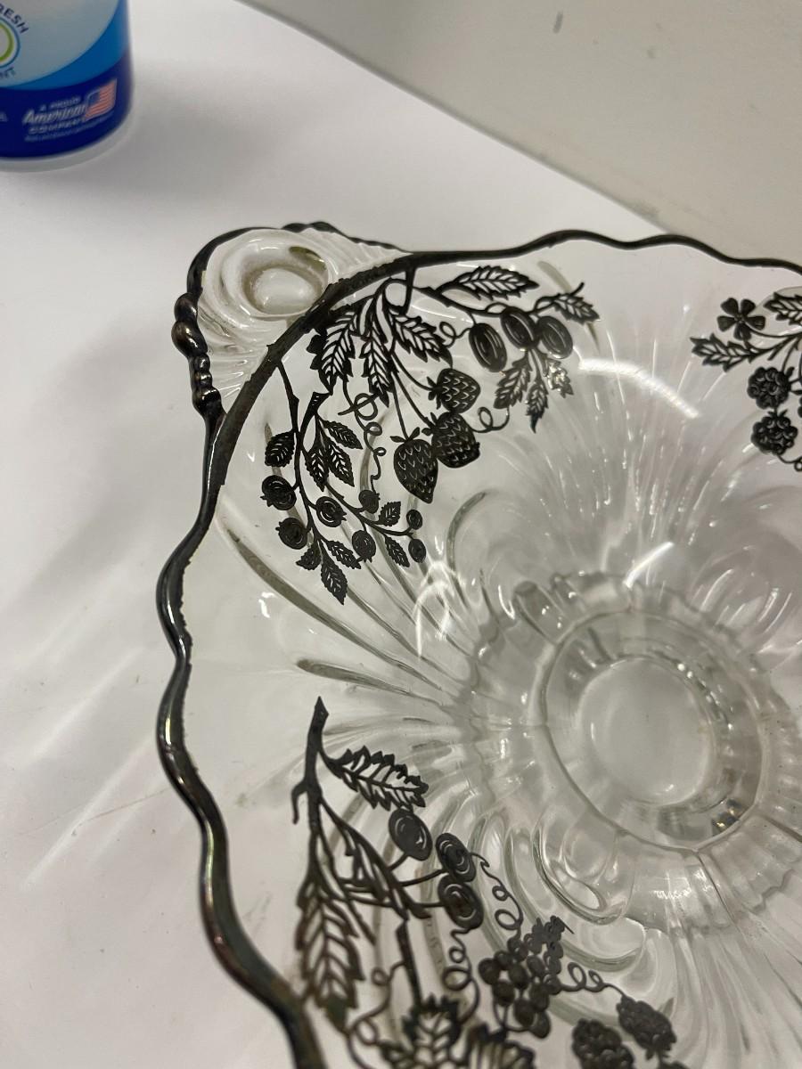 Vintage Cambridge glass "Caprice" berry dish with sterling overlay. Good condition with minor wear to the sterling overlay. No chips or cracks. 7 1/4" wide x 9" long. #1459