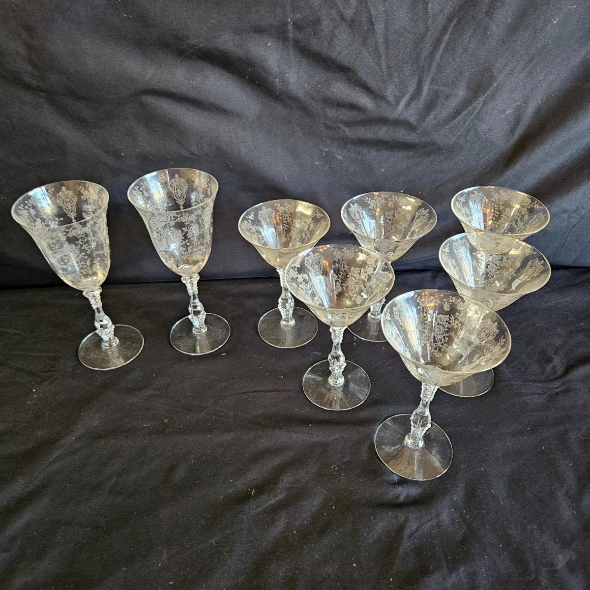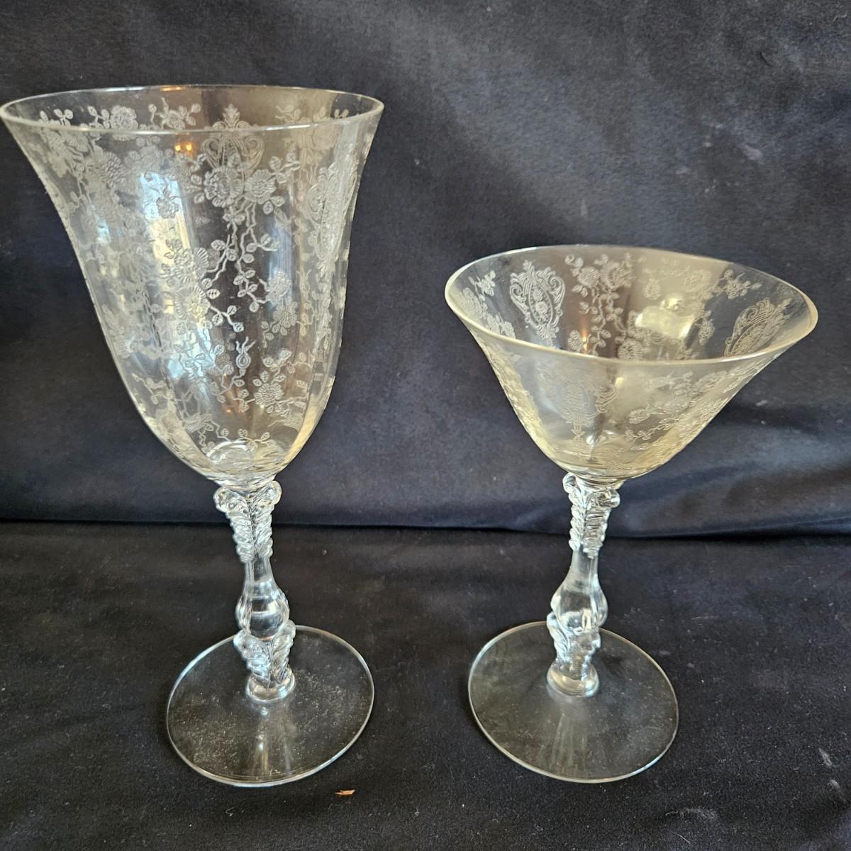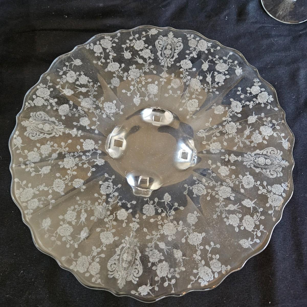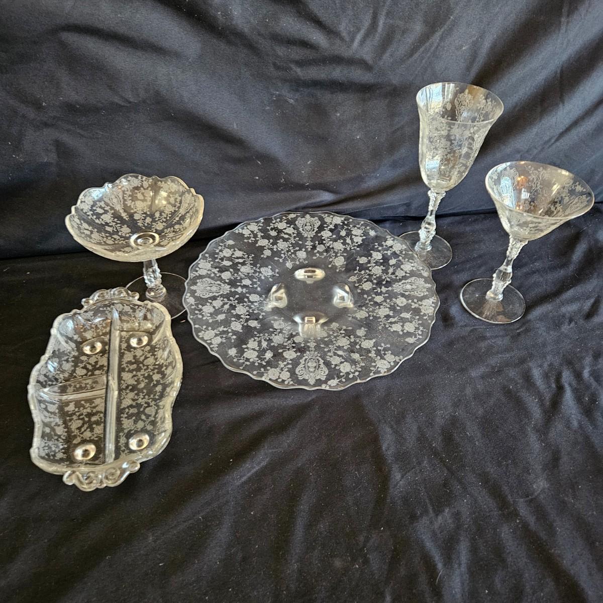 A vintage 19 piece Cambridge glass assortment with a rose point pattern. Includes a cake platter, a candy dish, eight small plates, a stemmed candy dish, two champagne glasses and six wine glasses. Shipping available