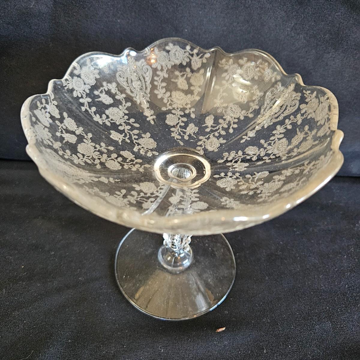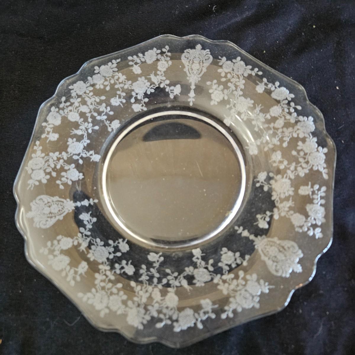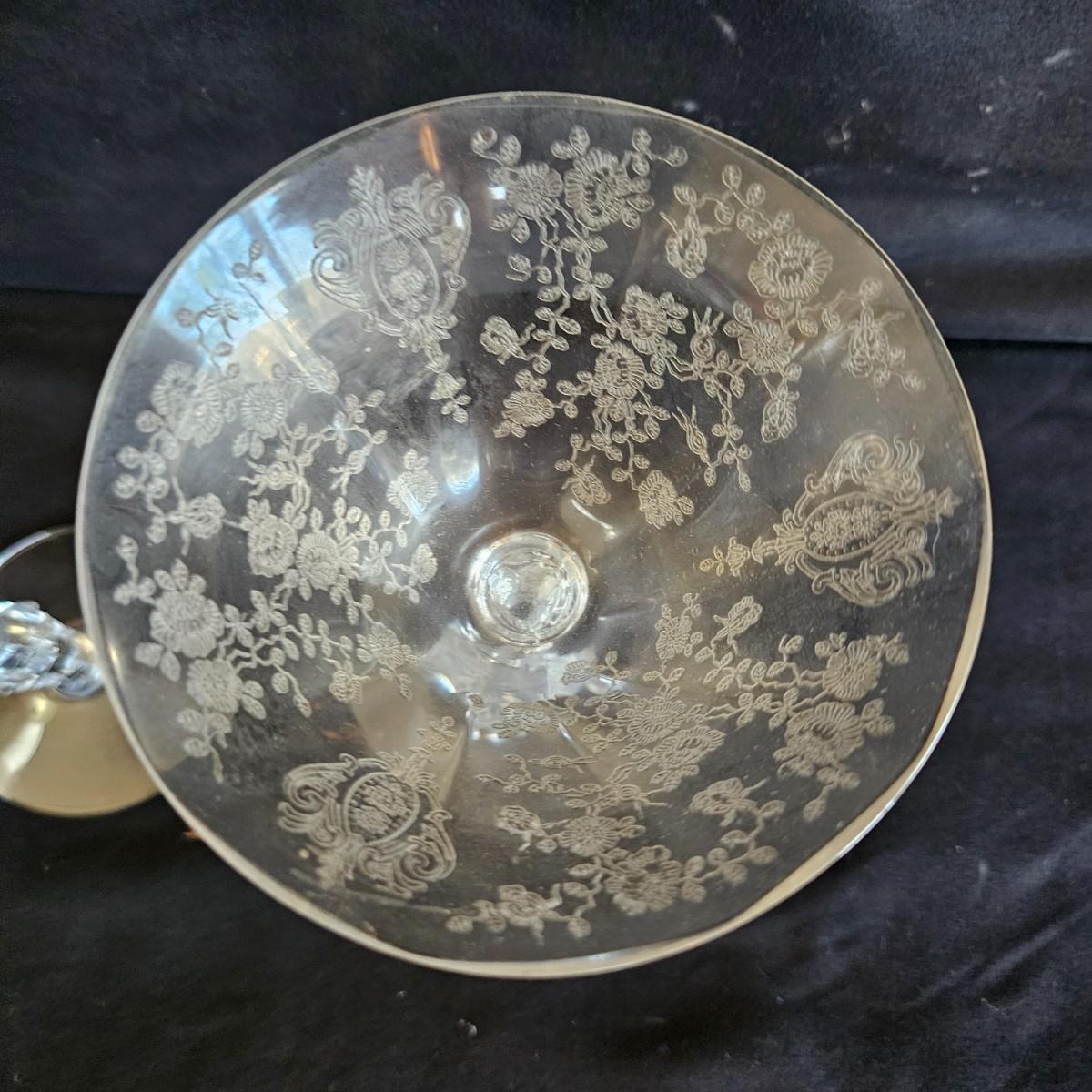 A vintage 19 piece Cambridge glass assortment with a rose point pattern. Includes a cake platter, a candy dish, eight small plates, a stemmed candy dish, two champagne glasses and six wine glasses. Shipping available
