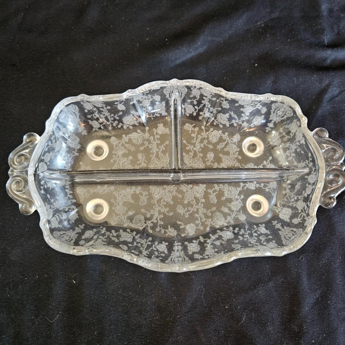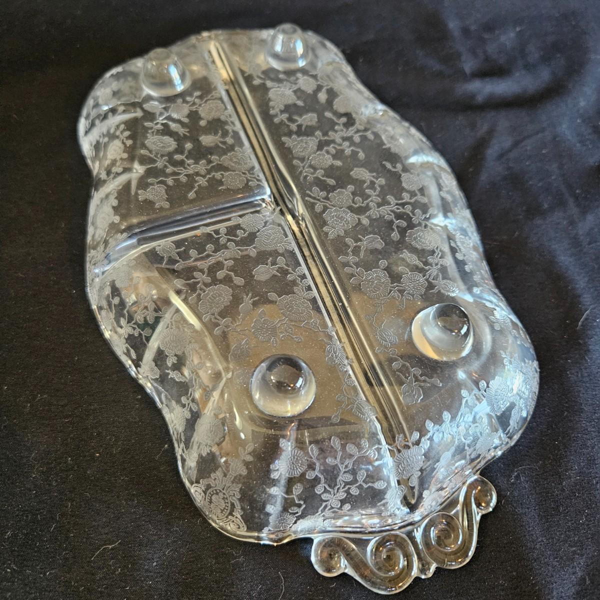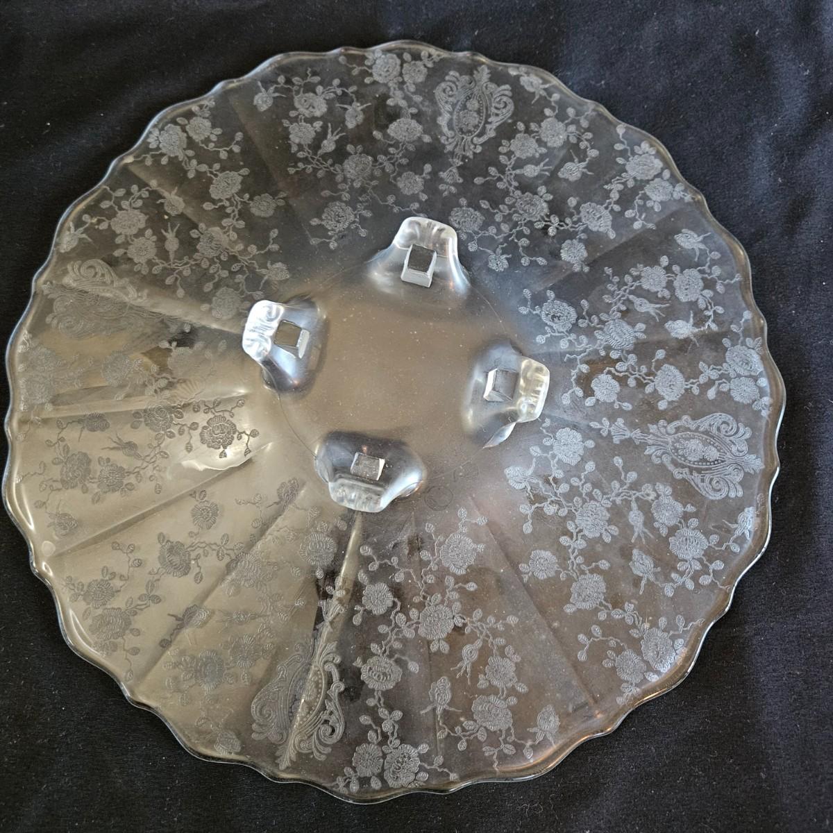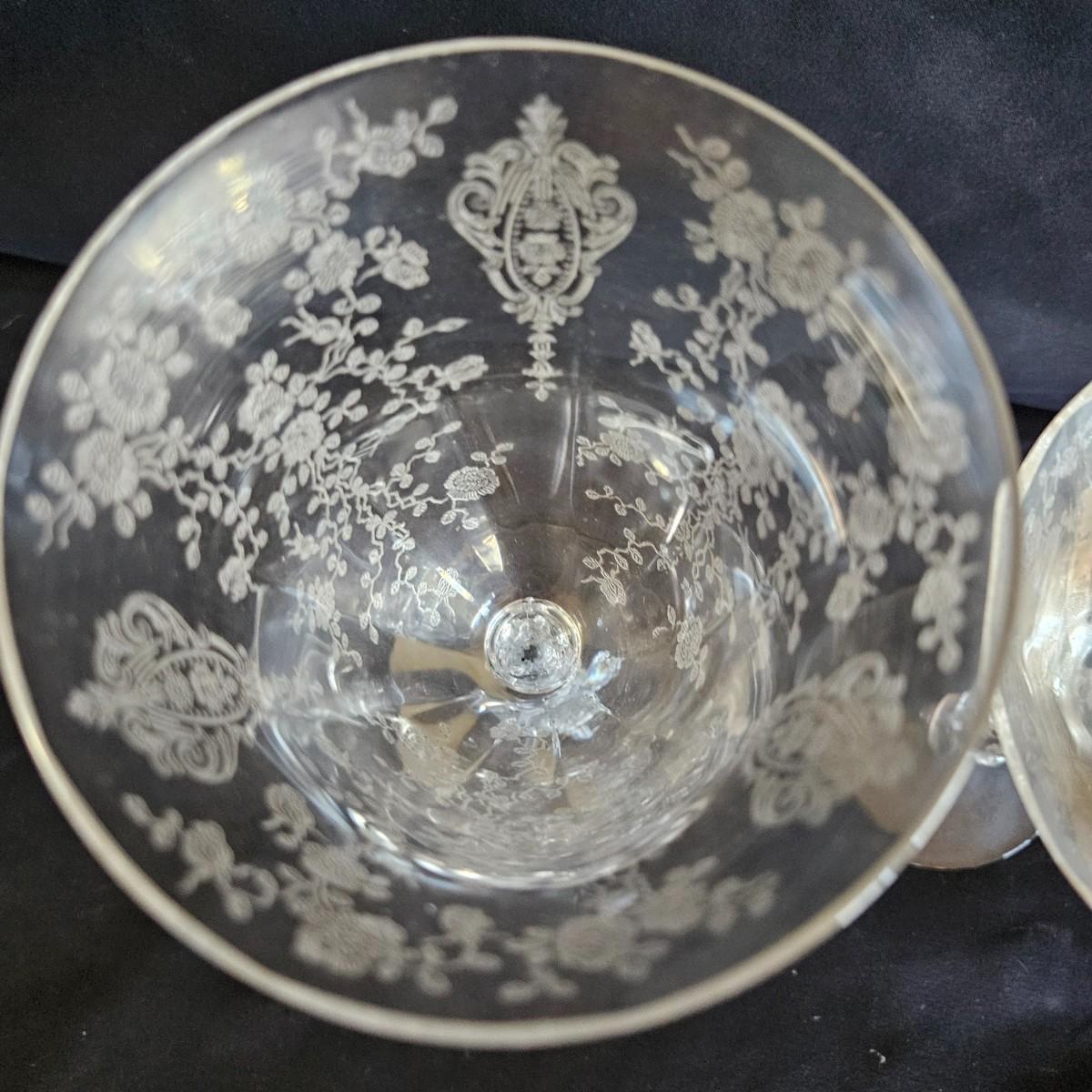 A vintage 19 piece Cambridge glass assortment with a rose point pattern. Includes a cake platter, a candy dish, eight small plates, a stemmed candy dish, two champagne glasses and six wine glasses. Shipping available