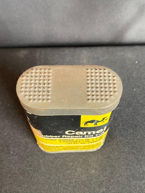 Camel rubber repair kit tin with kit pieces. The rubber is old and stiff, the glue has been used. It measures 3.5" tall, 2" across. 1" deep.