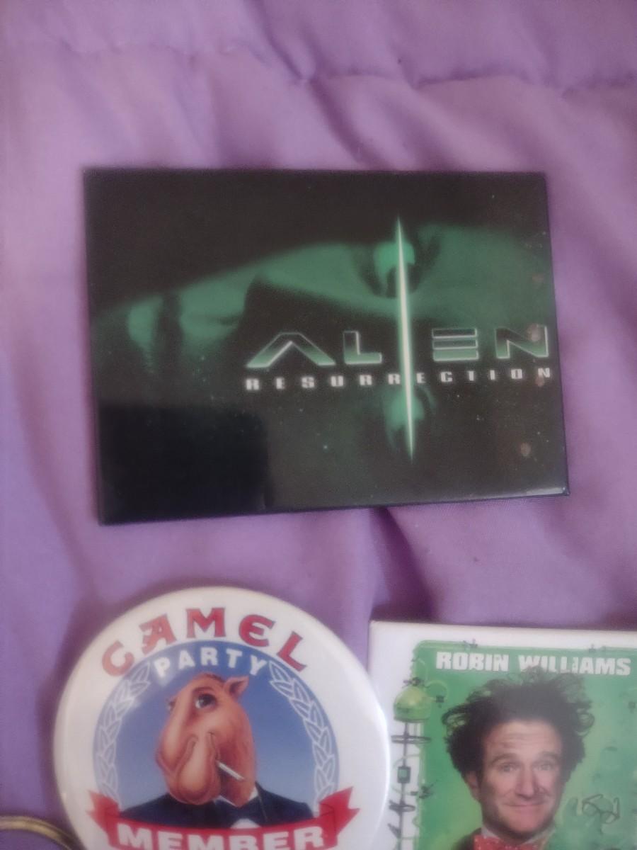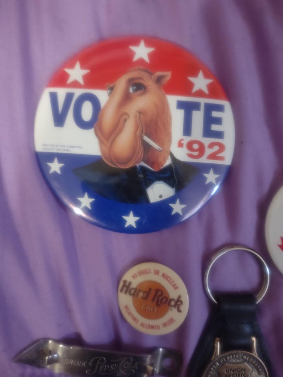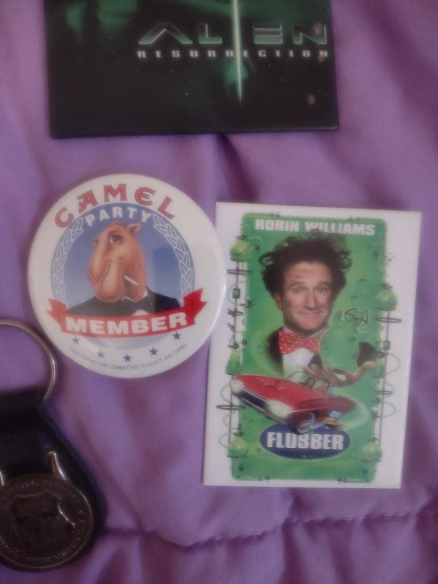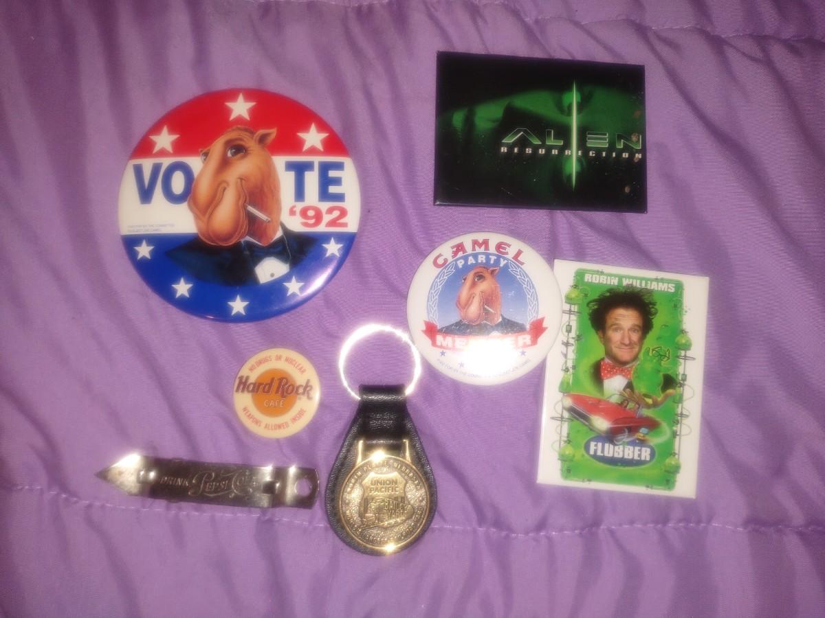 VINTAGE CAMEL PINS, MOVIE MAGNETS, PEPSI BOTTLE OPENER, UNION PACIFIC KEYCHAIN
