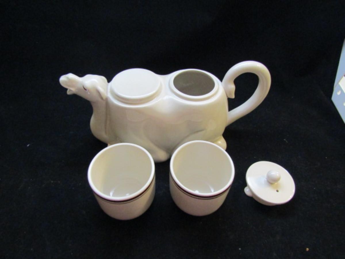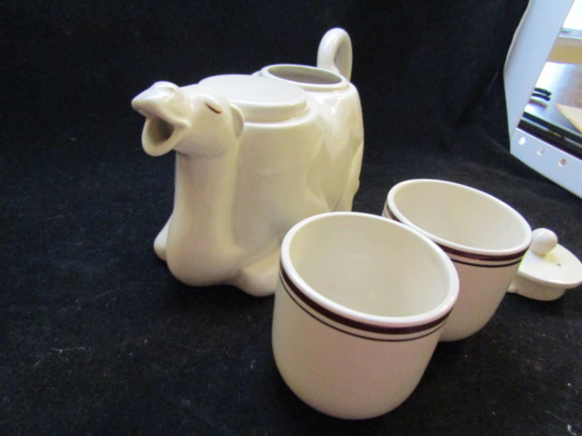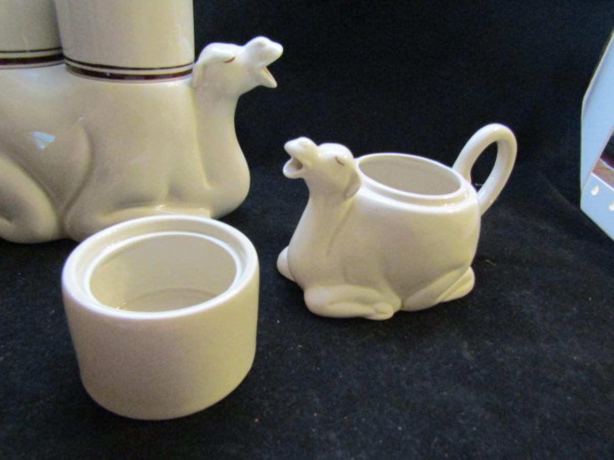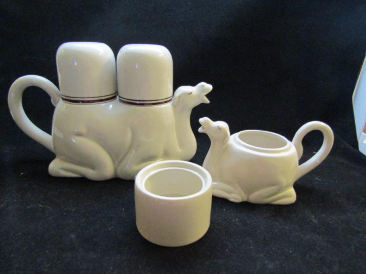 Vintage Camel Tea Set by Fitz and Floyd- Made in Japan (#32). Set includes teapot, 2 cups, creamer (also shaped like a camel) and sugar bowl (no lid).