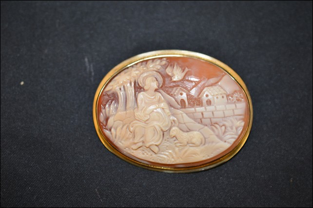 Vintage cameo of saint Francis of Assisi 14K, can also be worn as a pendant, 2" wide