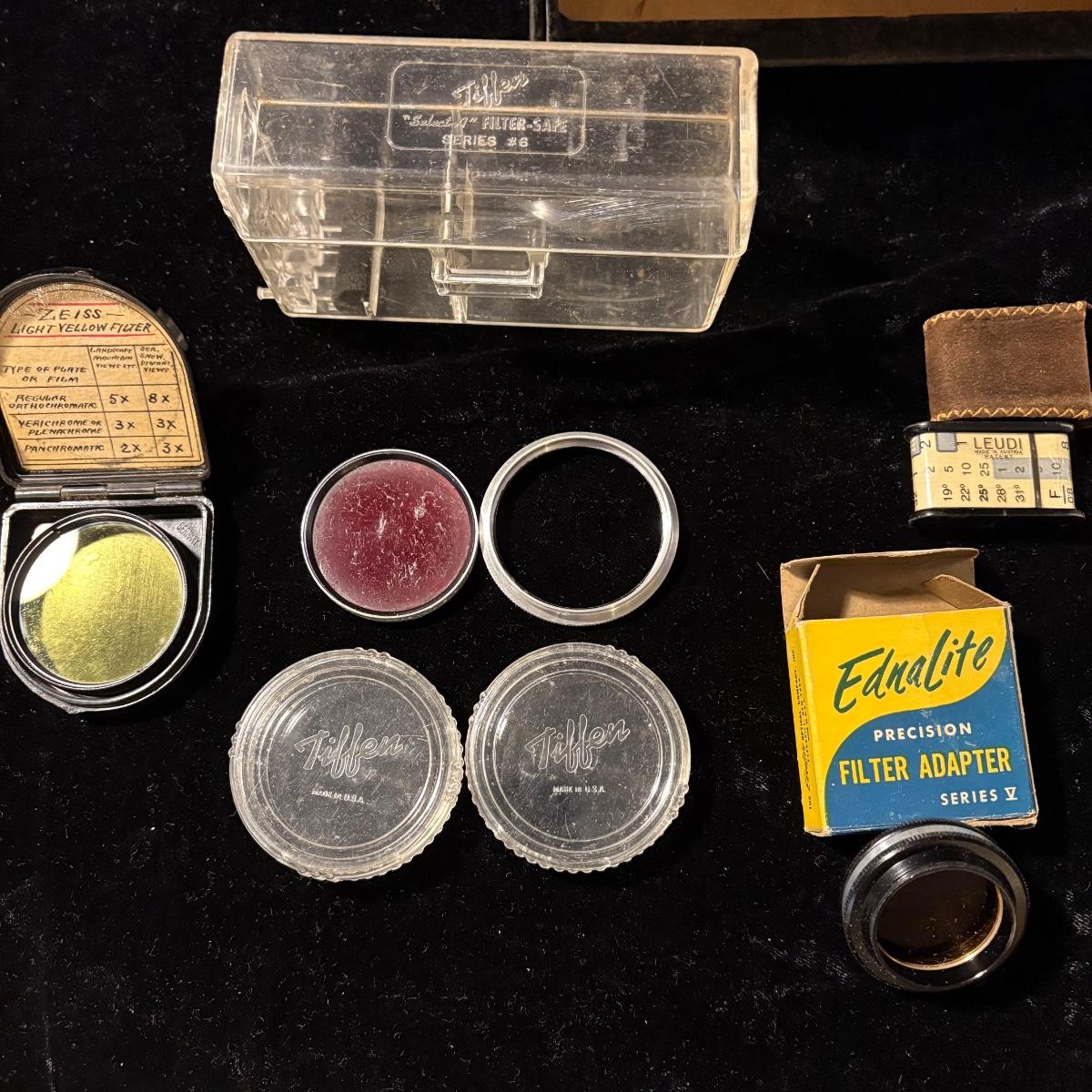 Various Zeiss, Tiffen filters and holders, glass slides of people, landscapes, misc. documents.