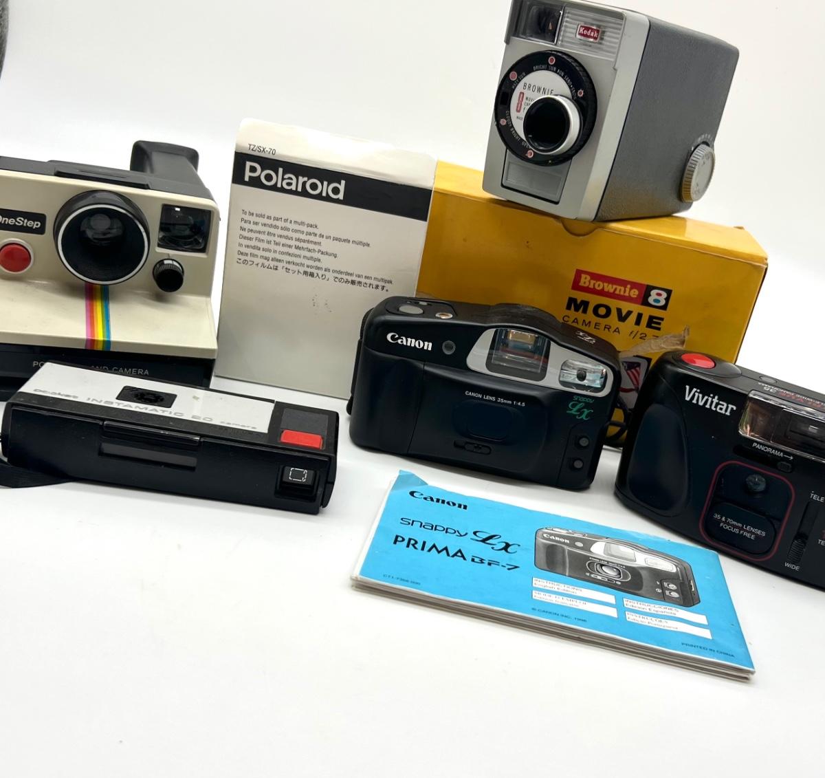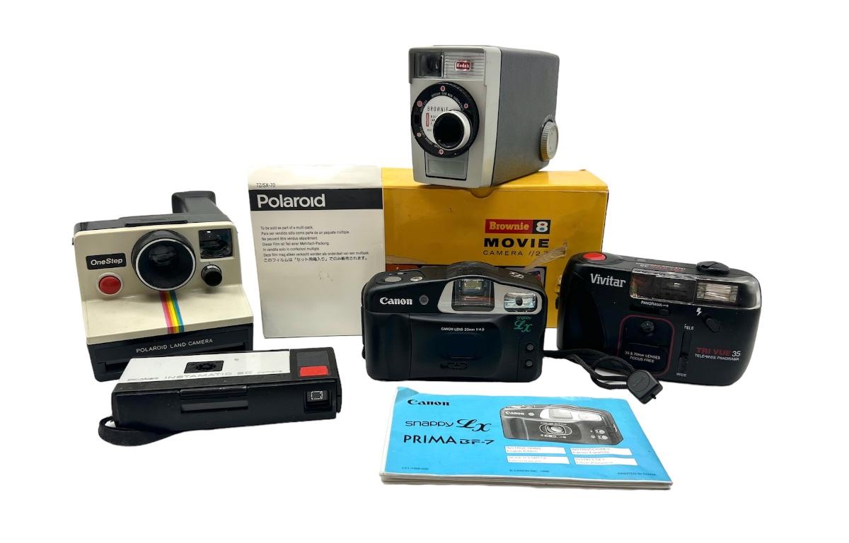 Vintage Camera lot- AS IS, not tested. Includes Brownie 8 Movie camera, Polaroid with what appears to be unopened film, Canon Snappy LX, Vivitar TRI VUE 35, INSTAMATIC.
