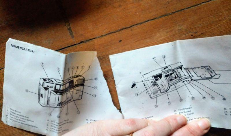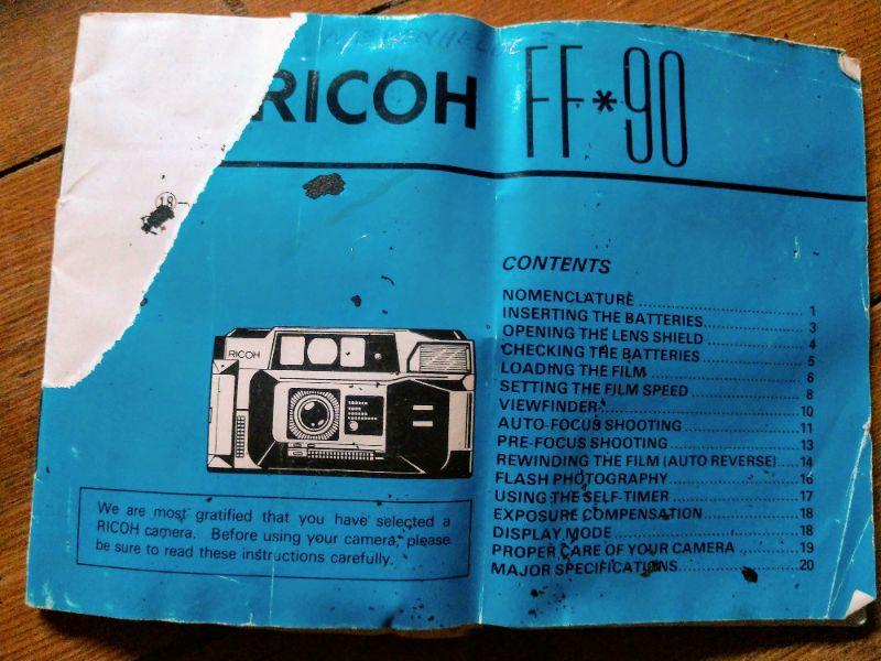 This Ricoh FF90 35 mm camera is untested. It has a somewhat damaged, but readable, manual. And it has its little case.