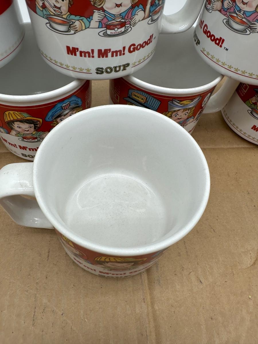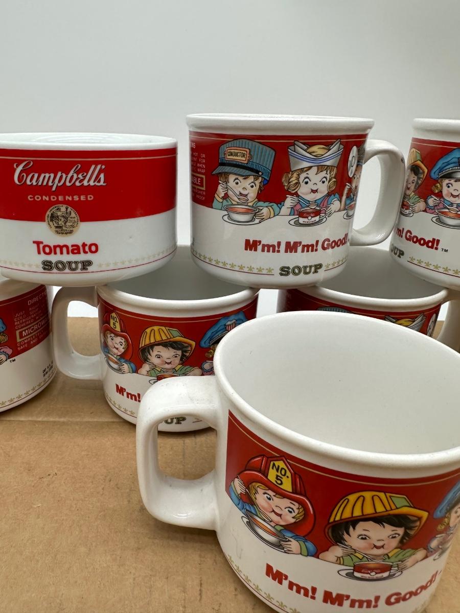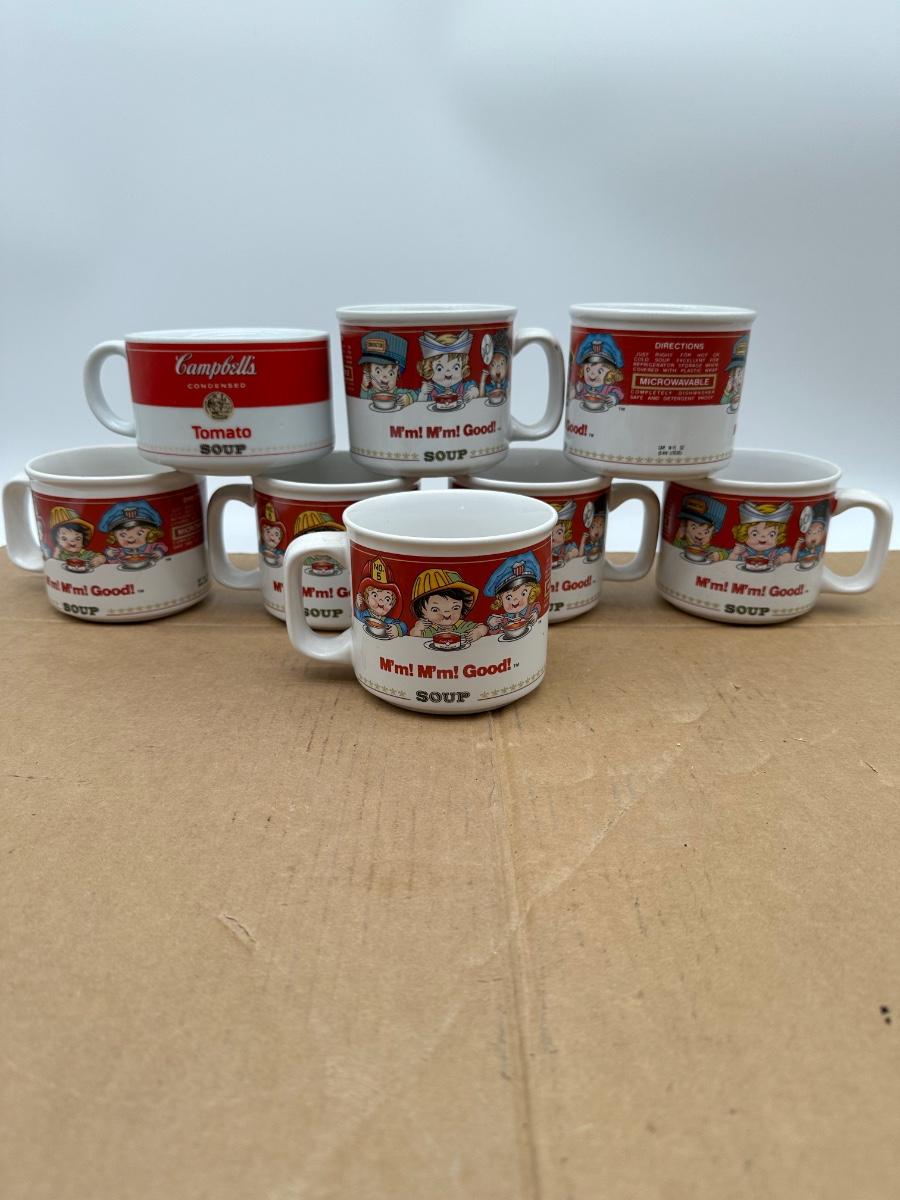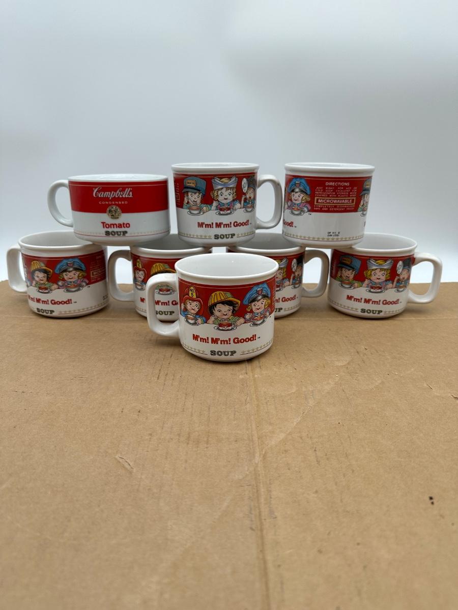 Set of eight (8) vintage Campbell’s Soup mugs, featuring classic “M’m! M’m! Good!” graphics and Campbell’s Condensed Tomato Soup branding with the iconic Campbell Kids illustrations.