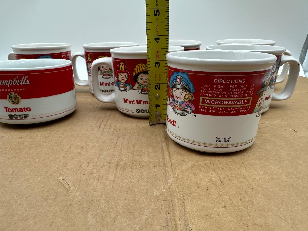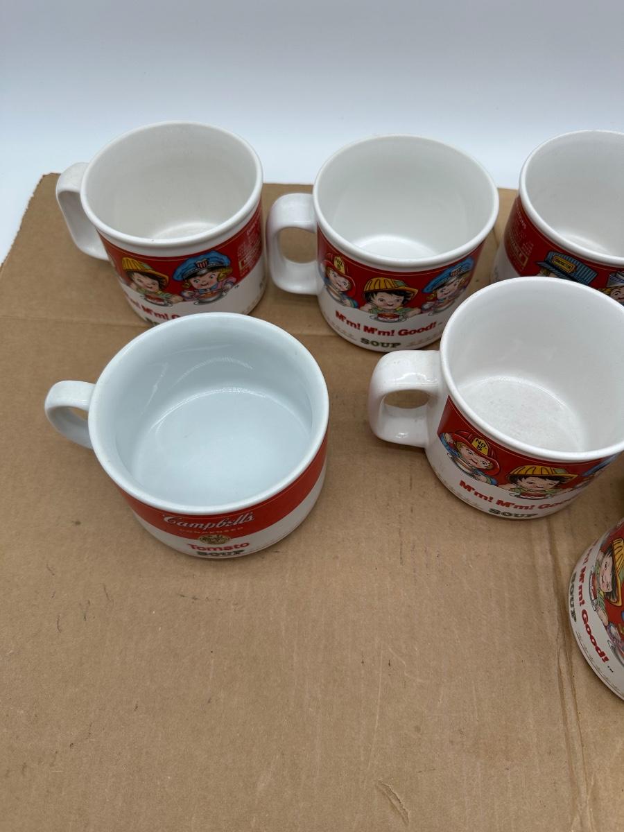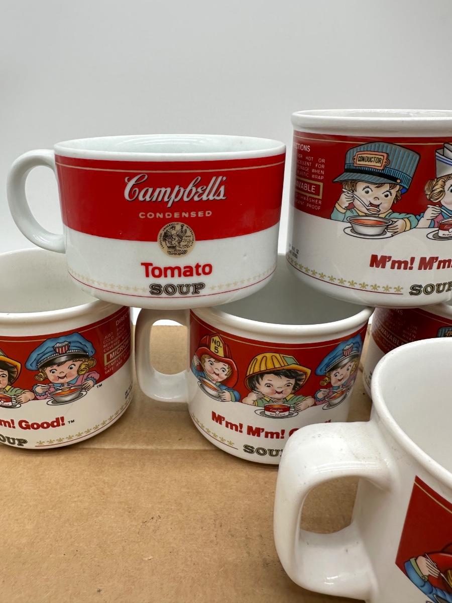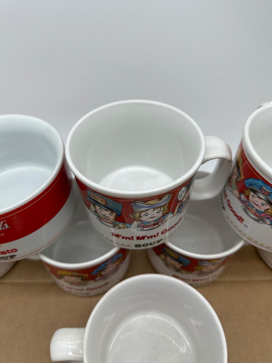 Set of eight (8) vintage Campbell’s Soup mugs, featuring classic “M’m! M’m! Good!” graphics and Campbell’s Condensed Tomato Soup branding with the iconic Campbell Kids illustrations.