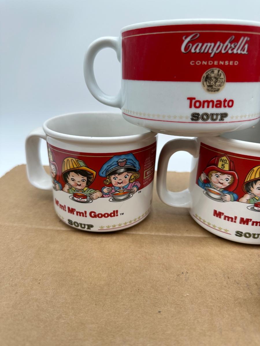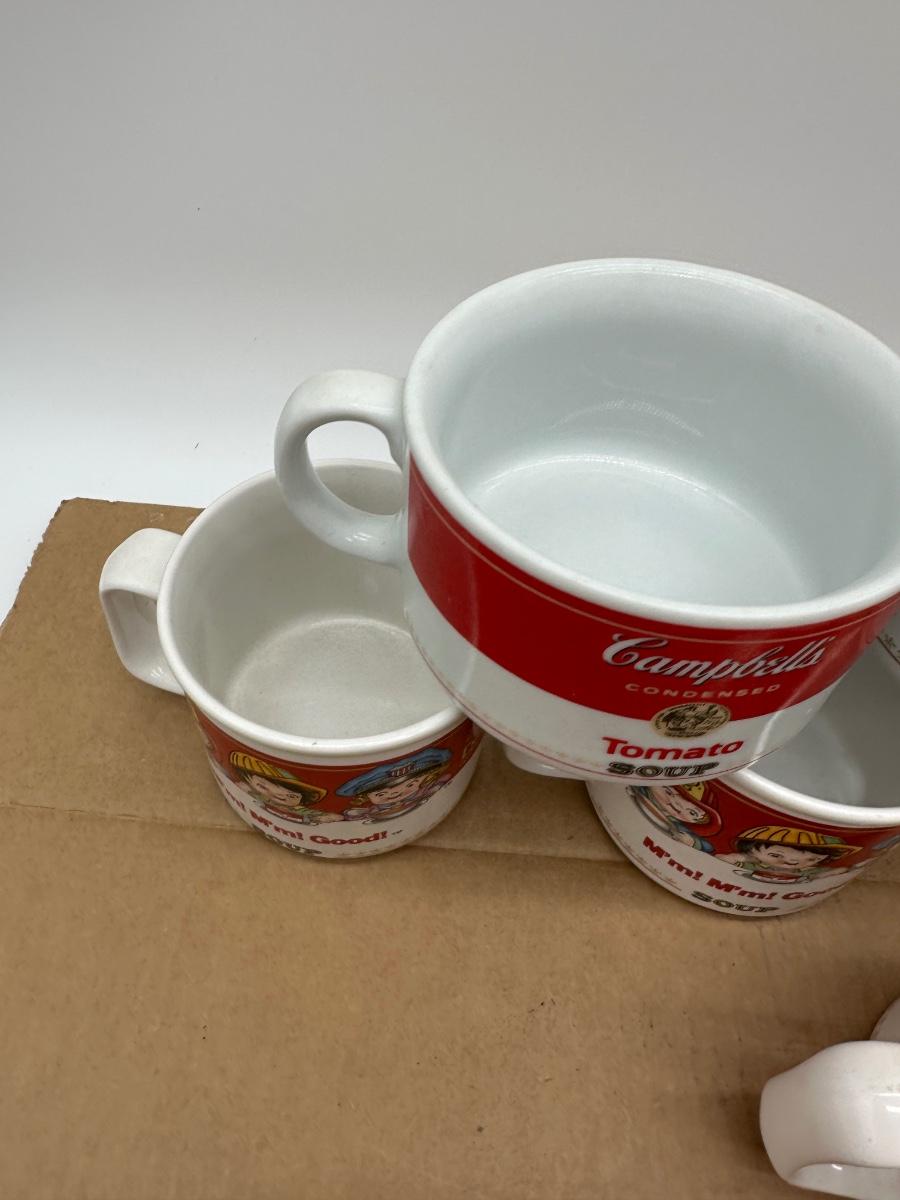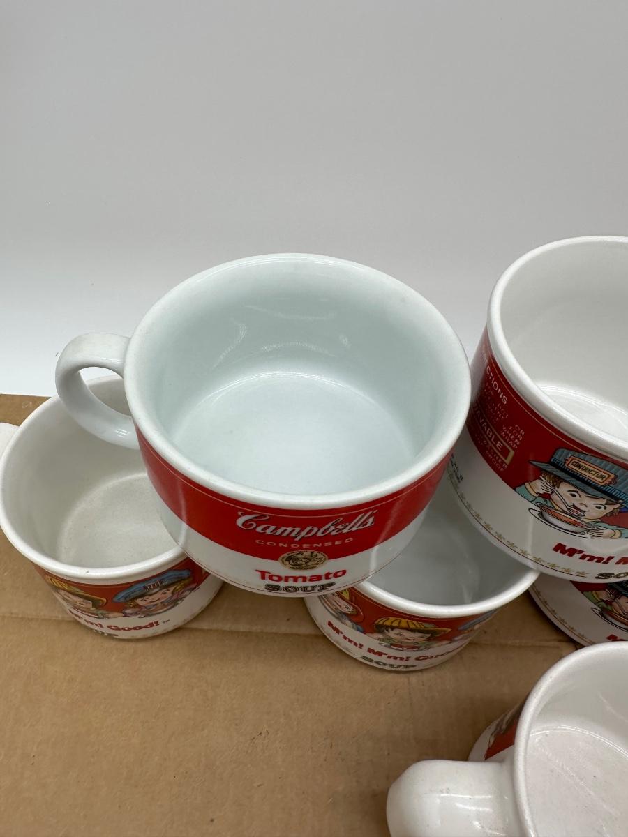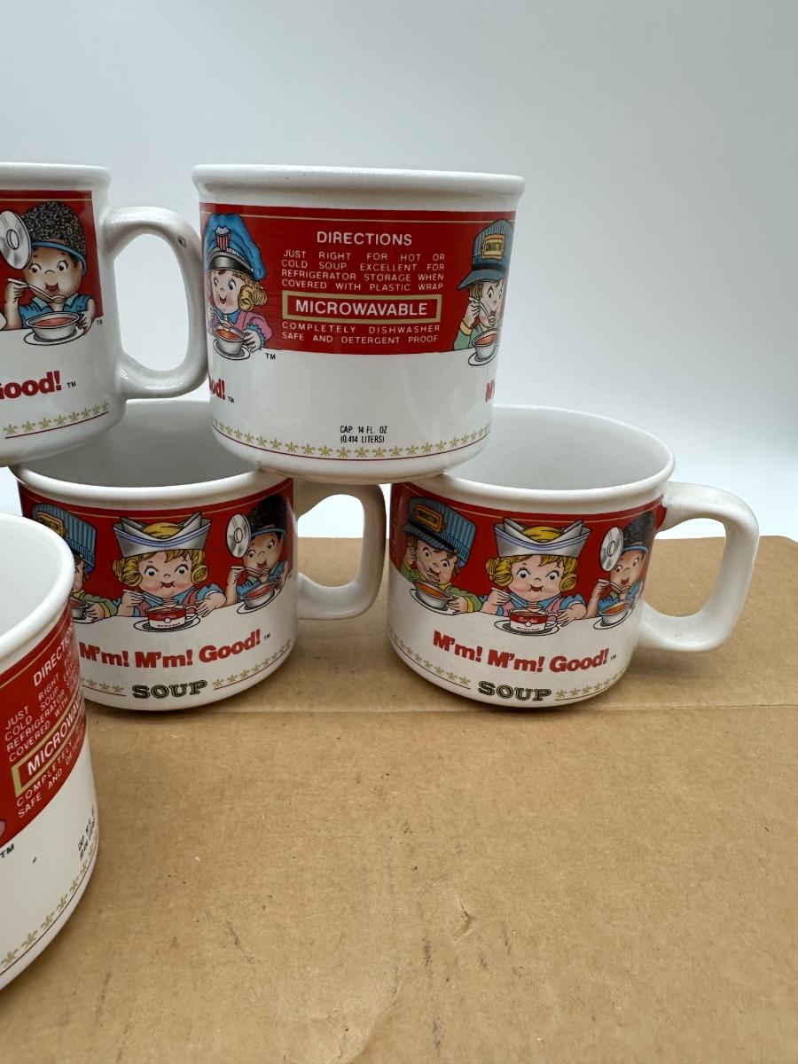 Set of eight (8) vintage Campbell’s Soup mugs, featuring classic “M’m! M’m! Good!” graphics and Campbell’s Condensed Tomato Soup branding with the iconic Campbell Kids illustrations.
