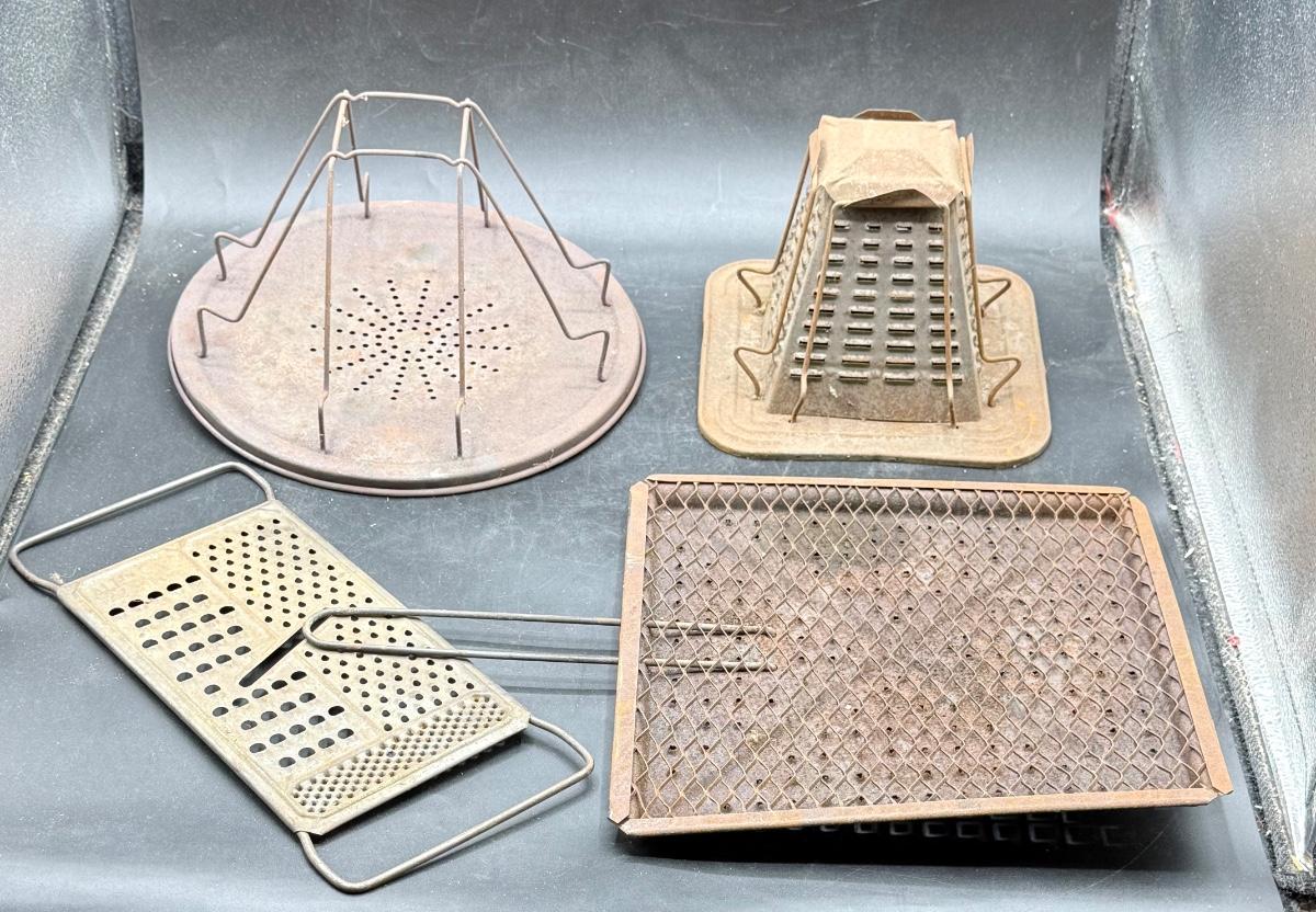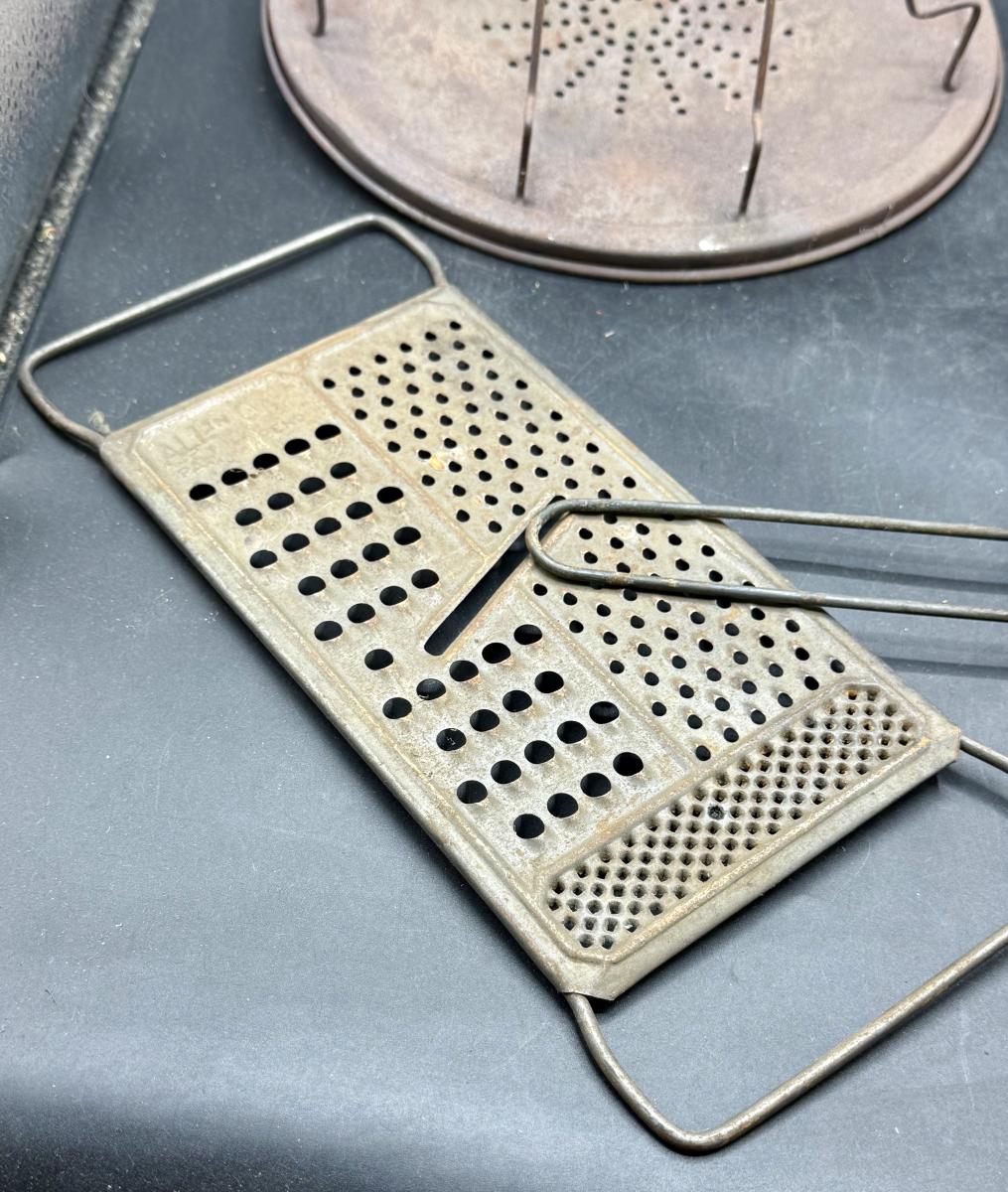 2 bread toasting rack, cheese grater and fffggg. All have surface rust, may only be suitable as display items.
