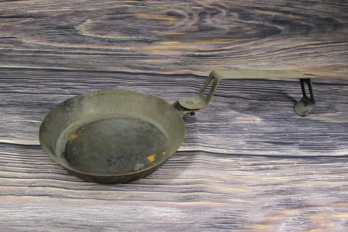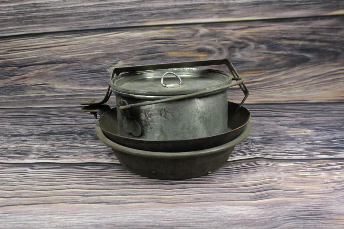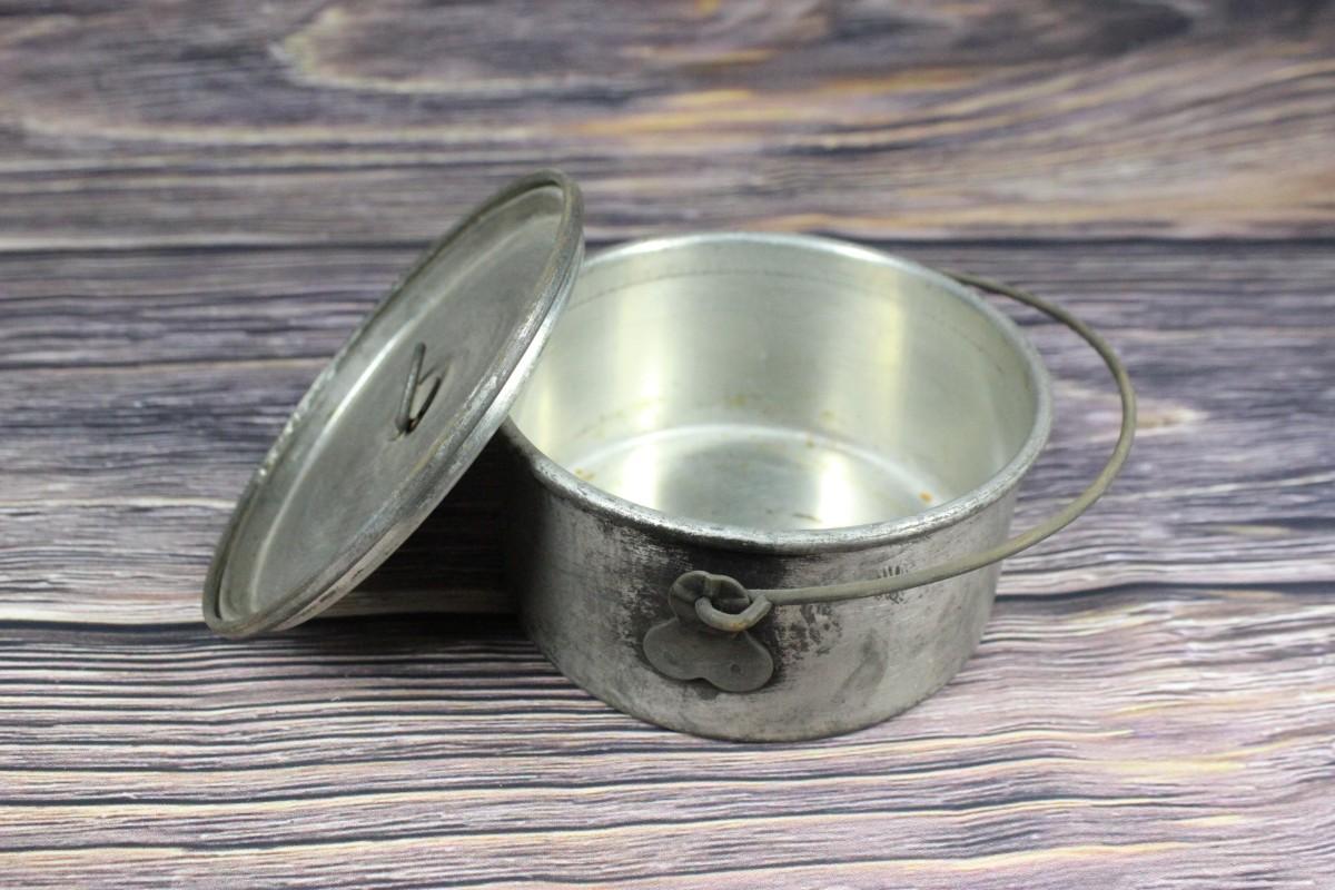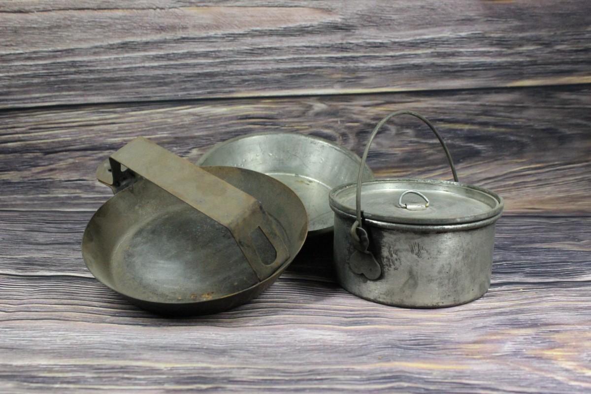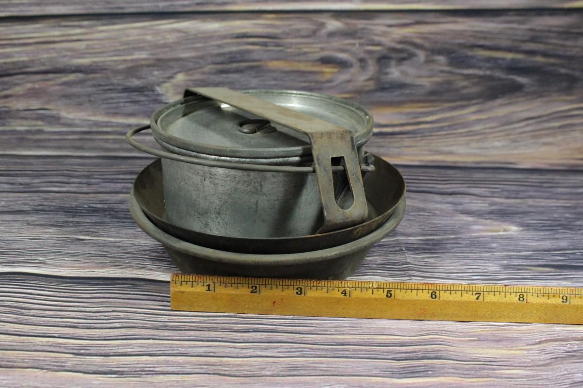 Vintage portable/camping cookware, each piece measures to about 4" - 4.5" in diameter and can be neatly stacked and transported. There is some ware on each of the cookware, but there is no significant dents or deep scratches.