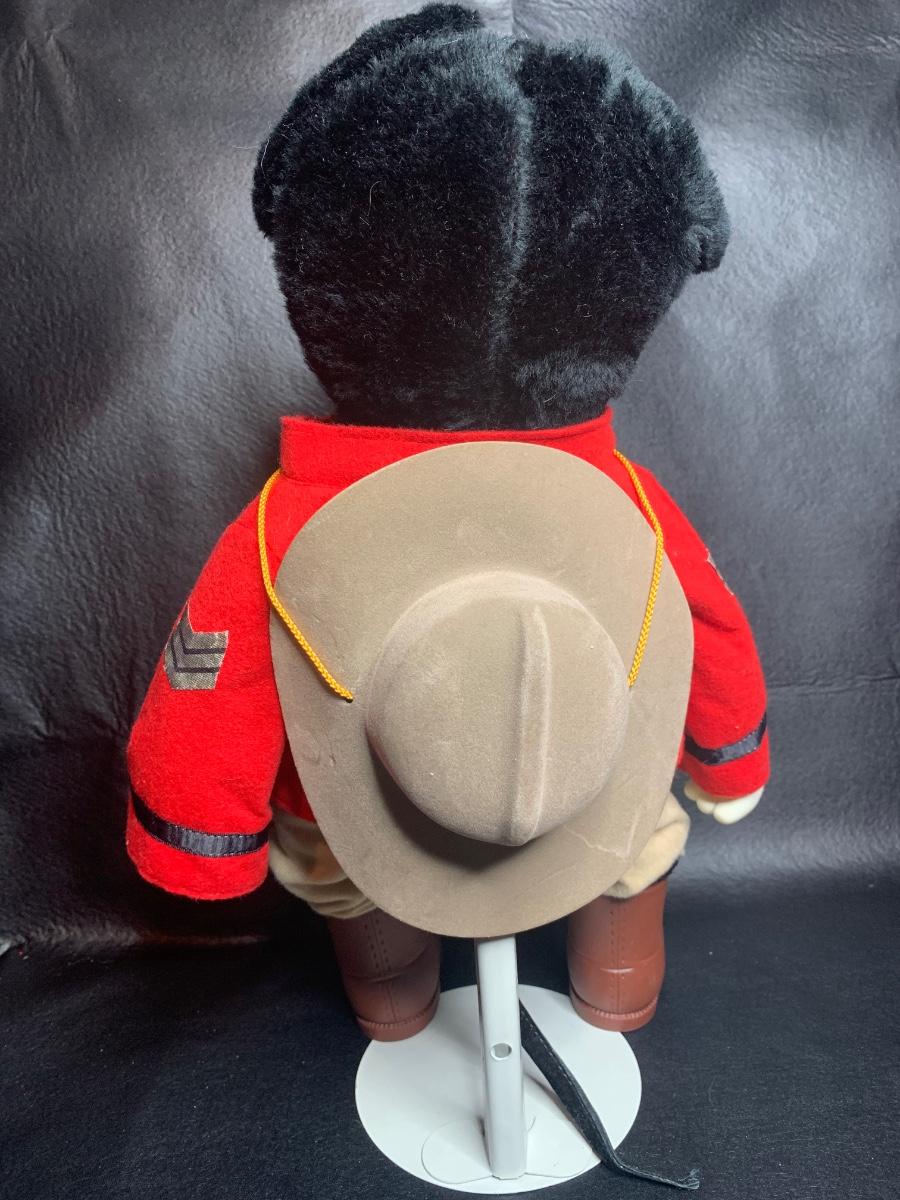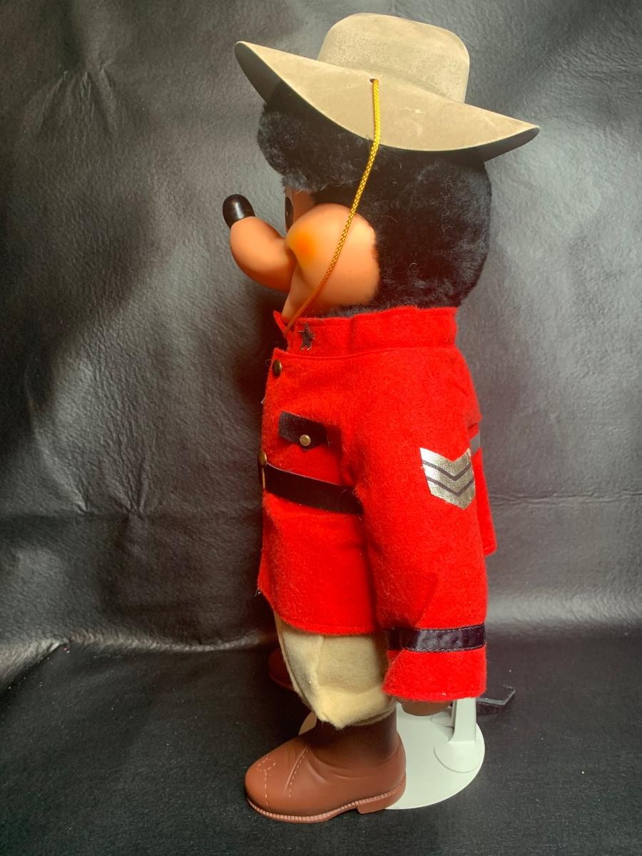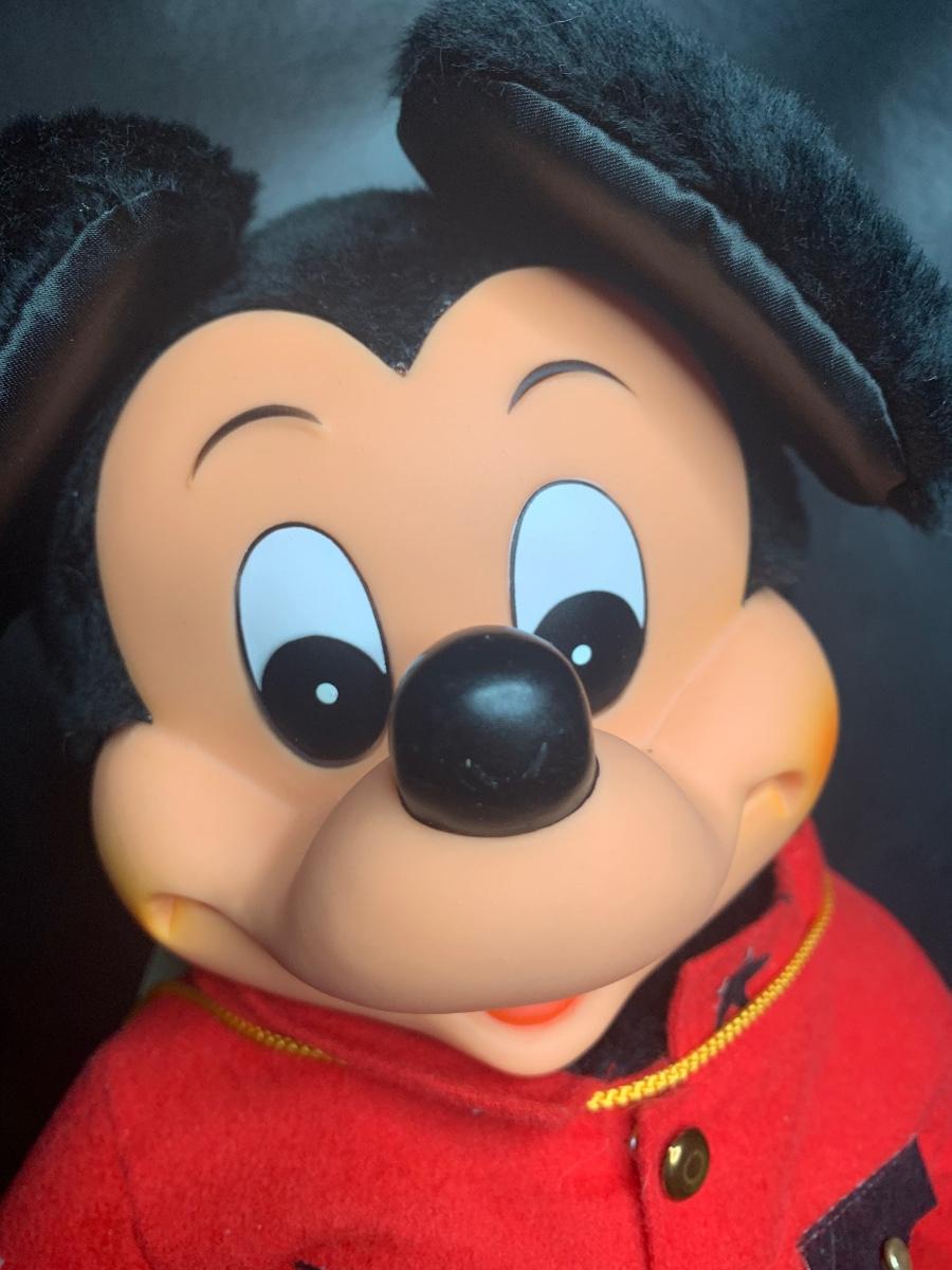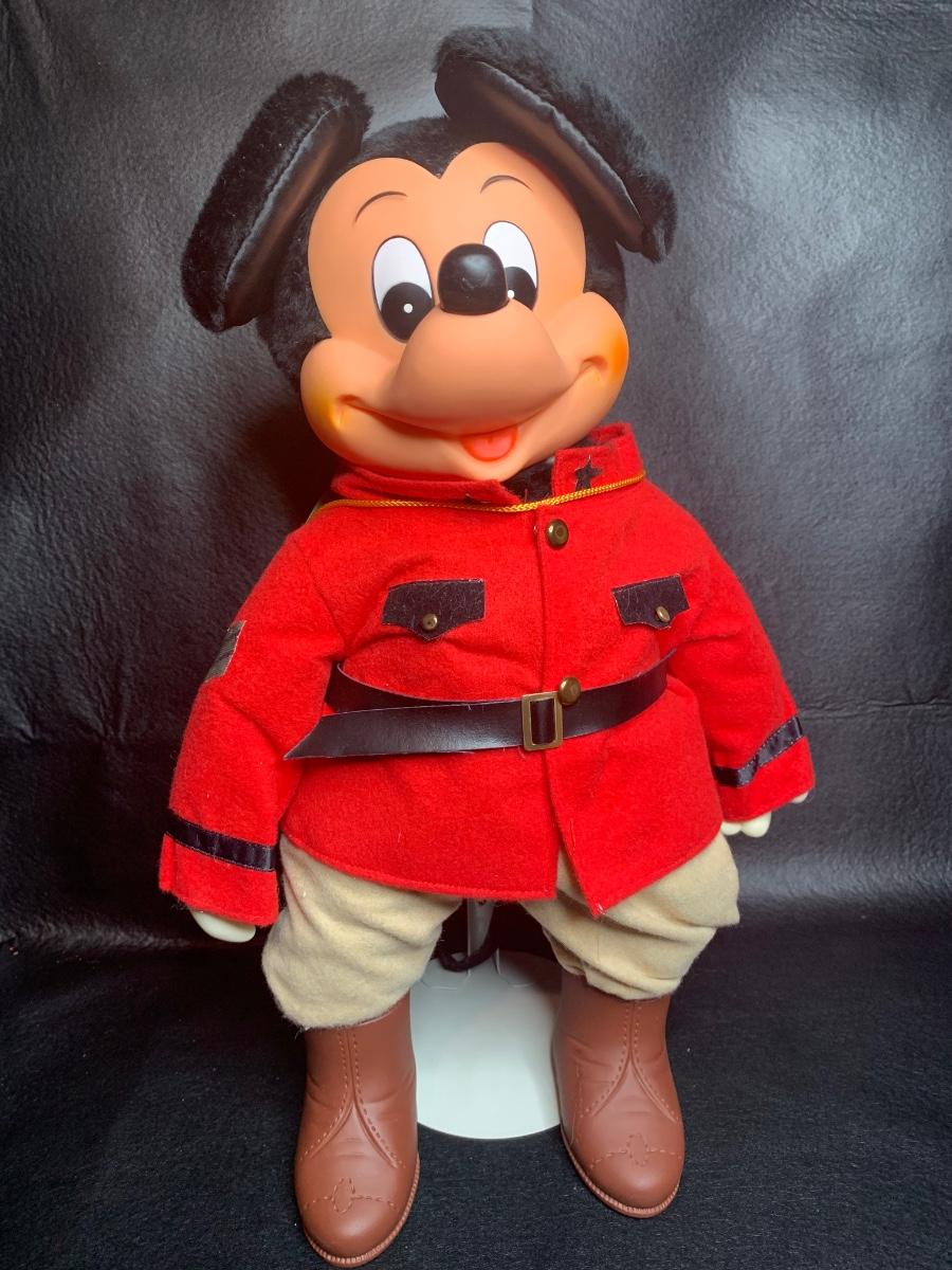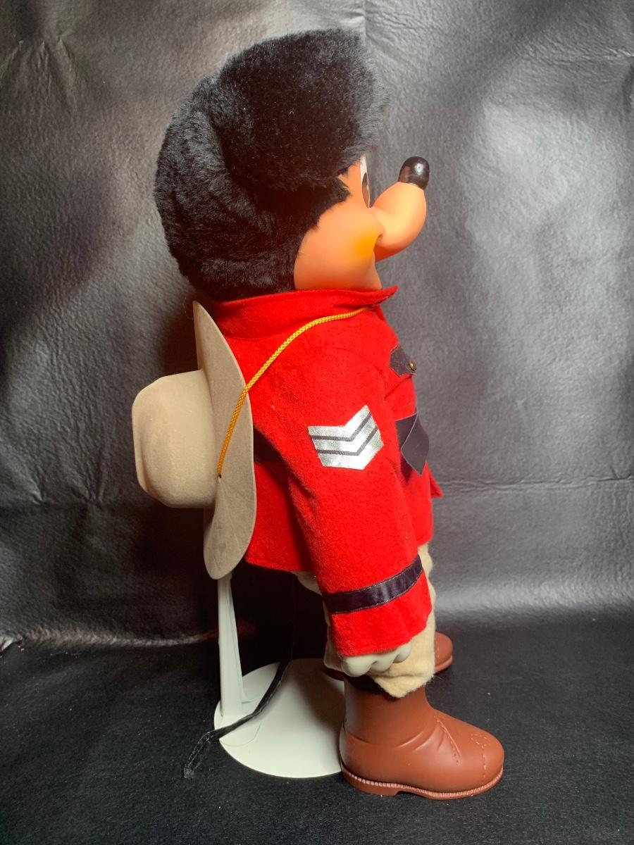 This is Disneyland Walt Disney World Mickey Mouse Plush Doll, early 1980’s Royal Canadian Mountie. Adorable Mickey Mouse Plush with vinyl Hard Face, Hands and boots. The cutie is wearing a Royal Canadian Mountie outfit. Dressed in a red uniform with black belt and pockets. He has some sort of rank on his arms. His hat is plastic with some sort of felt on the top. He will also come with the stand. And to finish he has cute little brown boots.