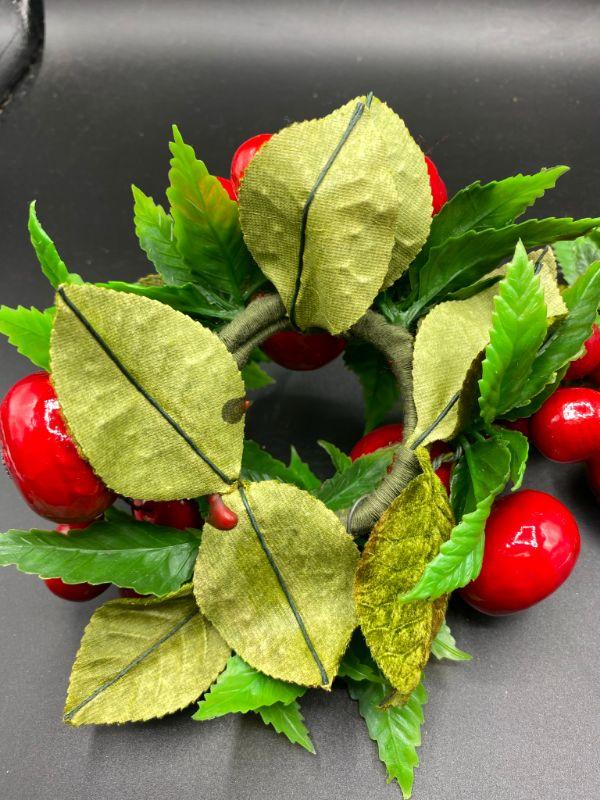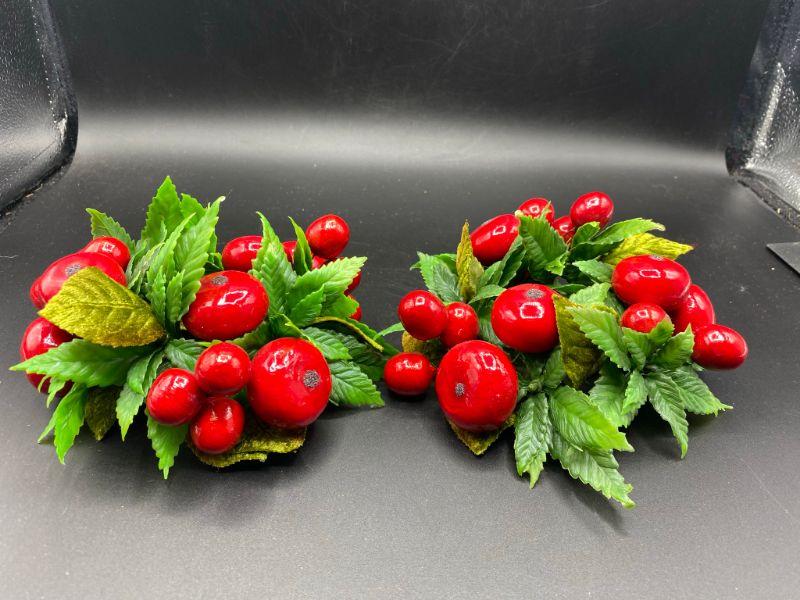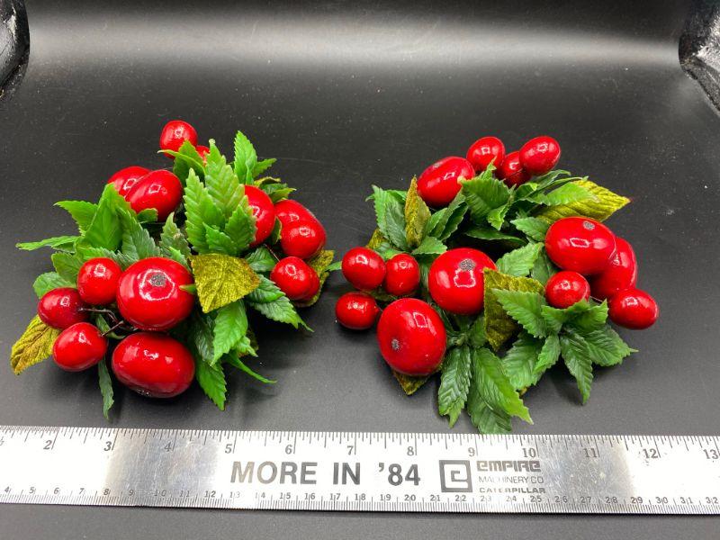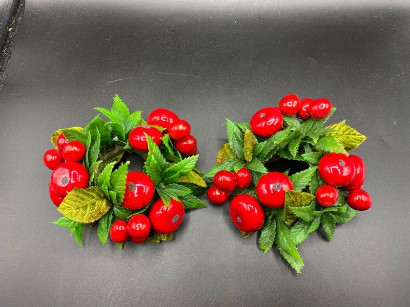 Pair of vintage candle wreathes. Glossy red berries amongst greenery. Looks like 2" candles would fit.