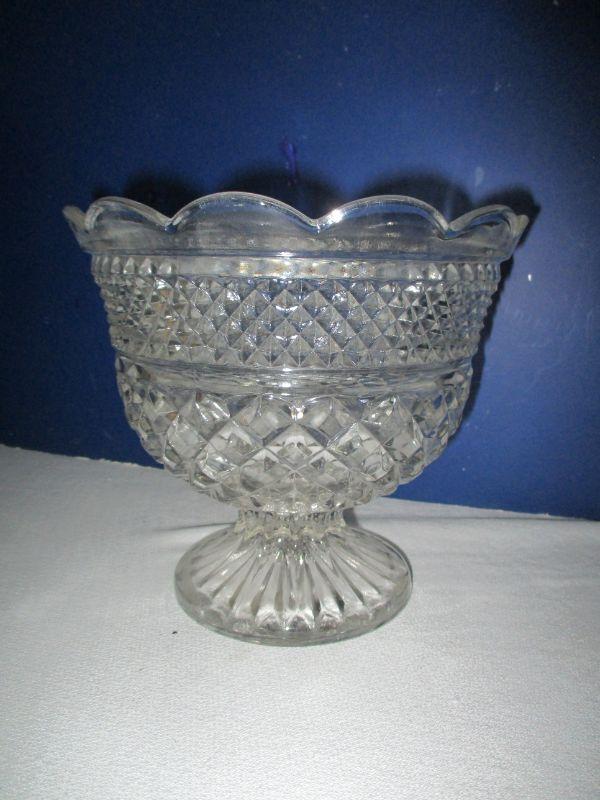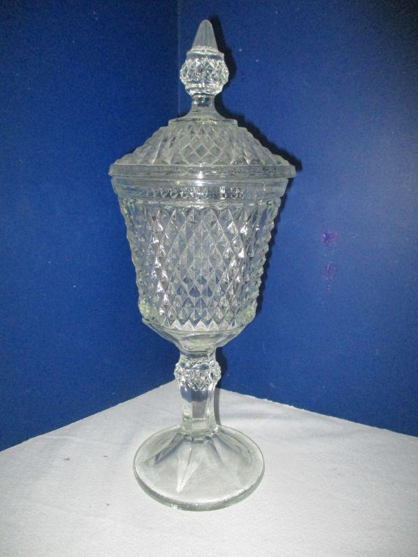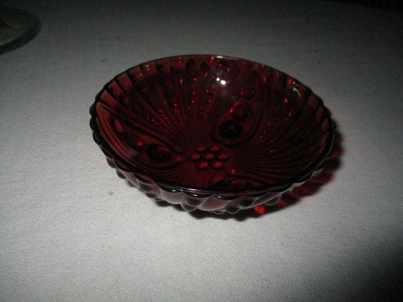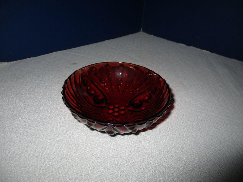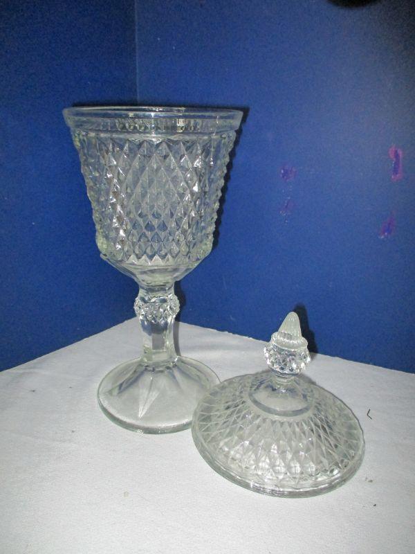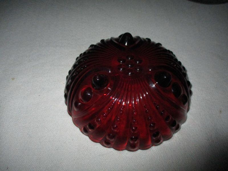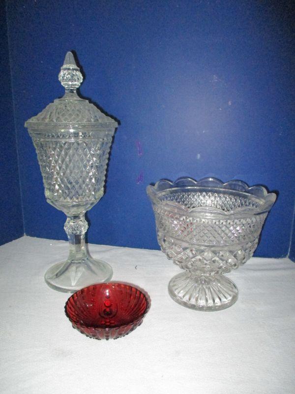 SMALL RED DISH, CUT GLASS CANDY BOWL AND CUT GLASS CANDY DISH WITH LID MEASURES TALL