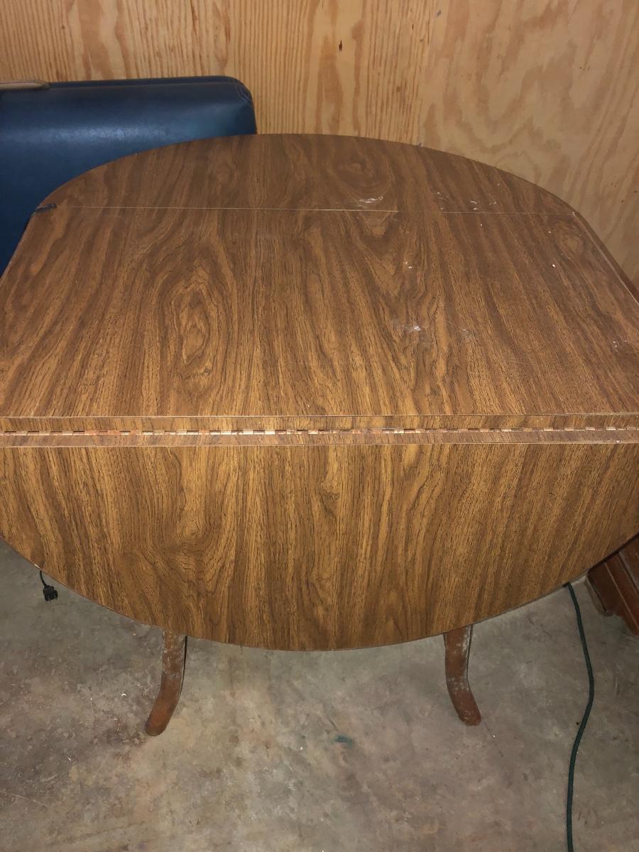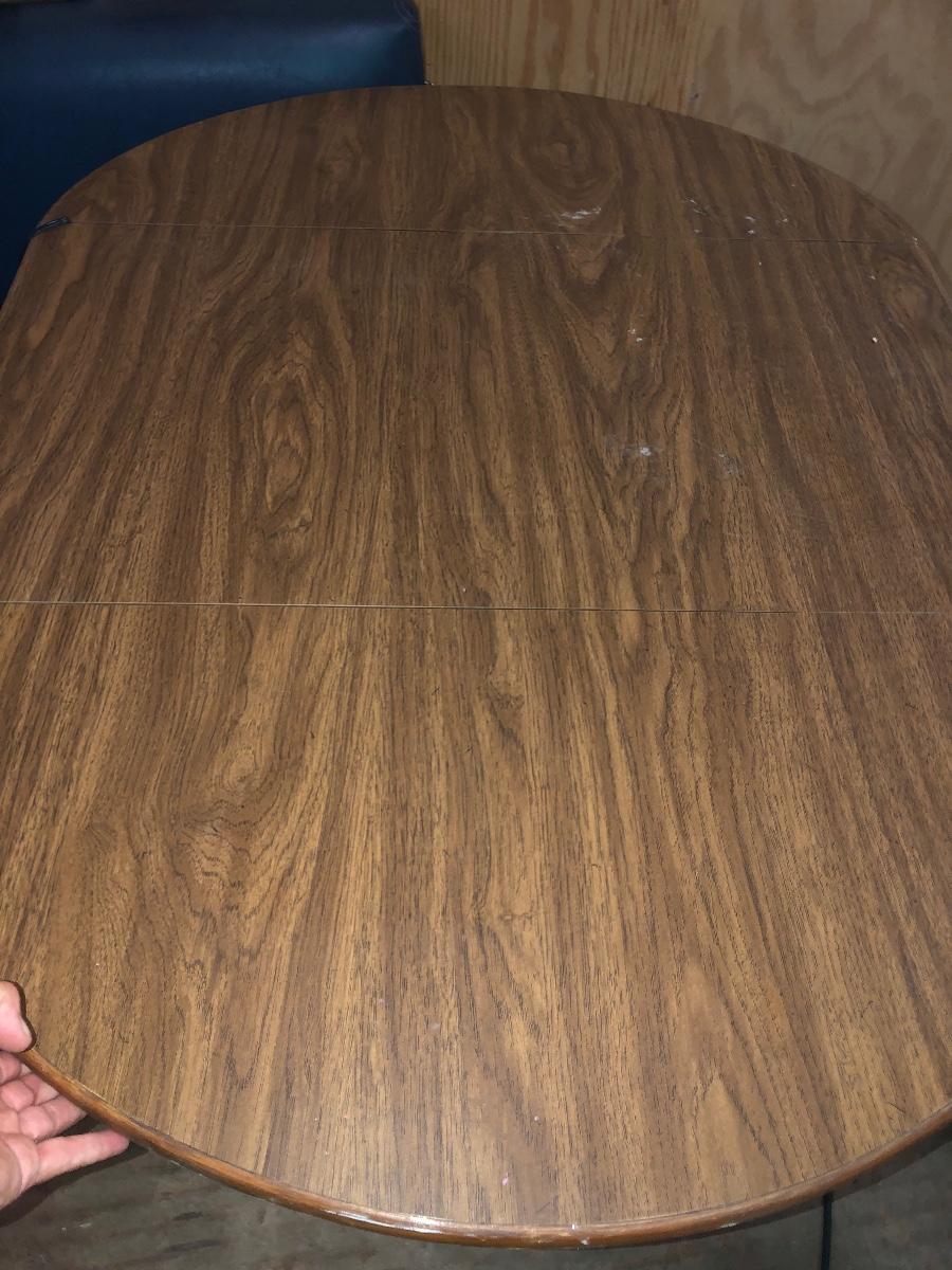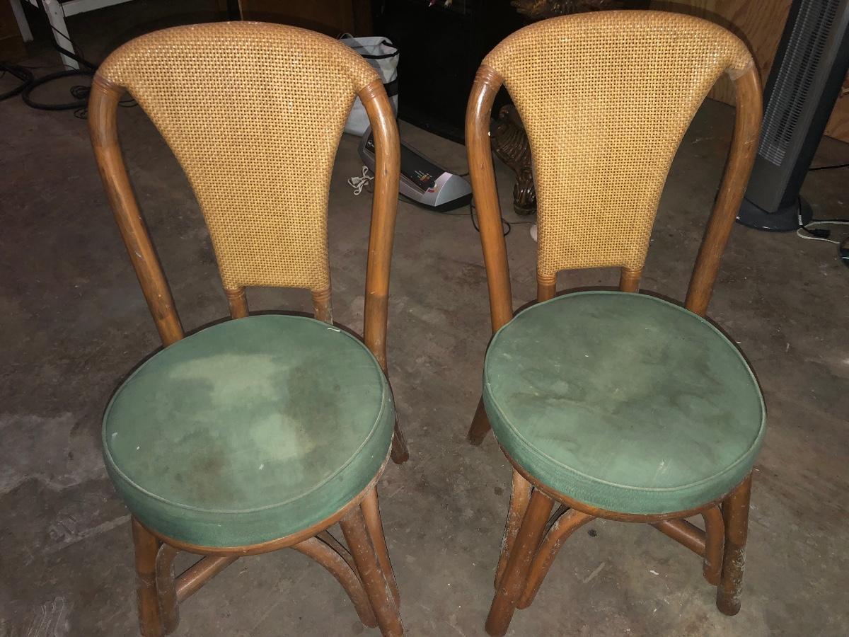This is a great piece. Bottom of table is bamboo and all intact. Chairs need upholstery redone. Classic piece.