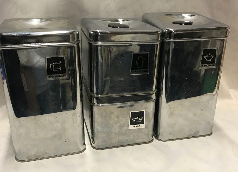 4 Piece retro canister set. All items SOLD AS IS, AS SHOWN and subject to reserve bid. Unsold items will be relisted. Pick-Up only on Wednesday May 29th between 5-7 PM. Please read Shipping Terms