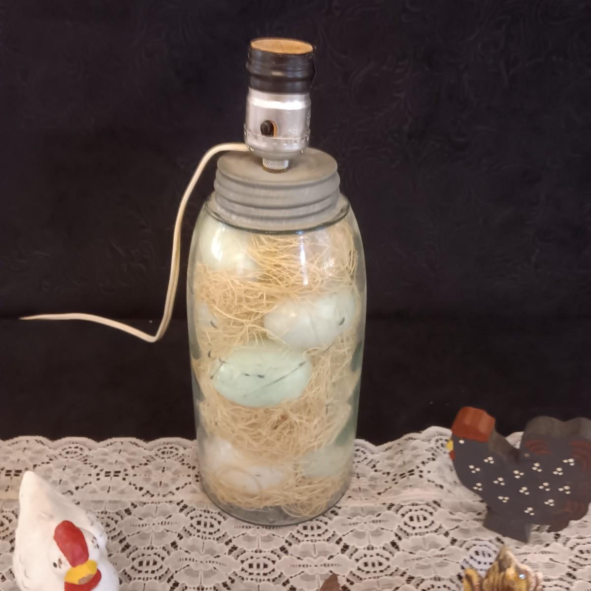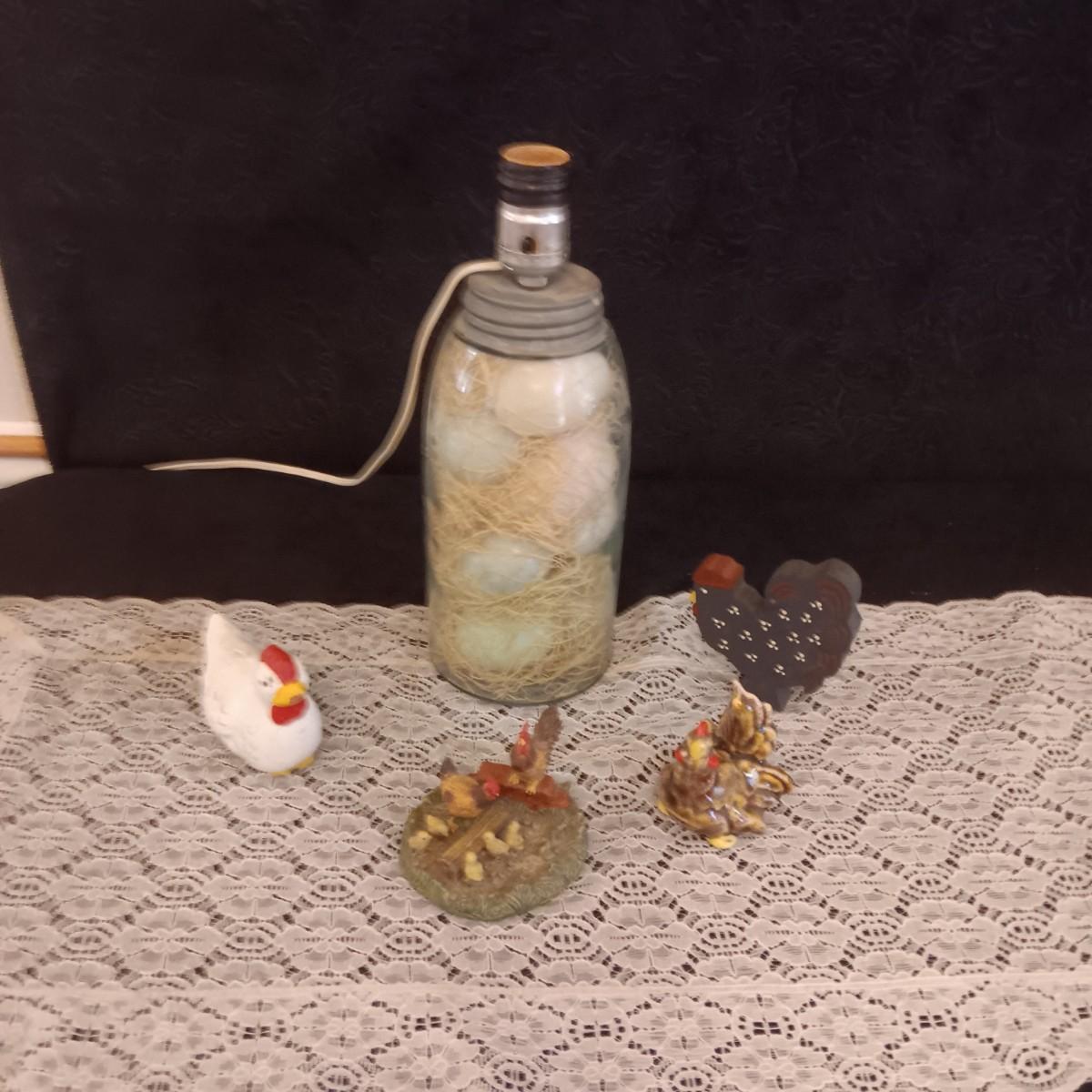 VINTAGE CANNING JAR LAMP BASE AND DECORATIVE ROOSTERS