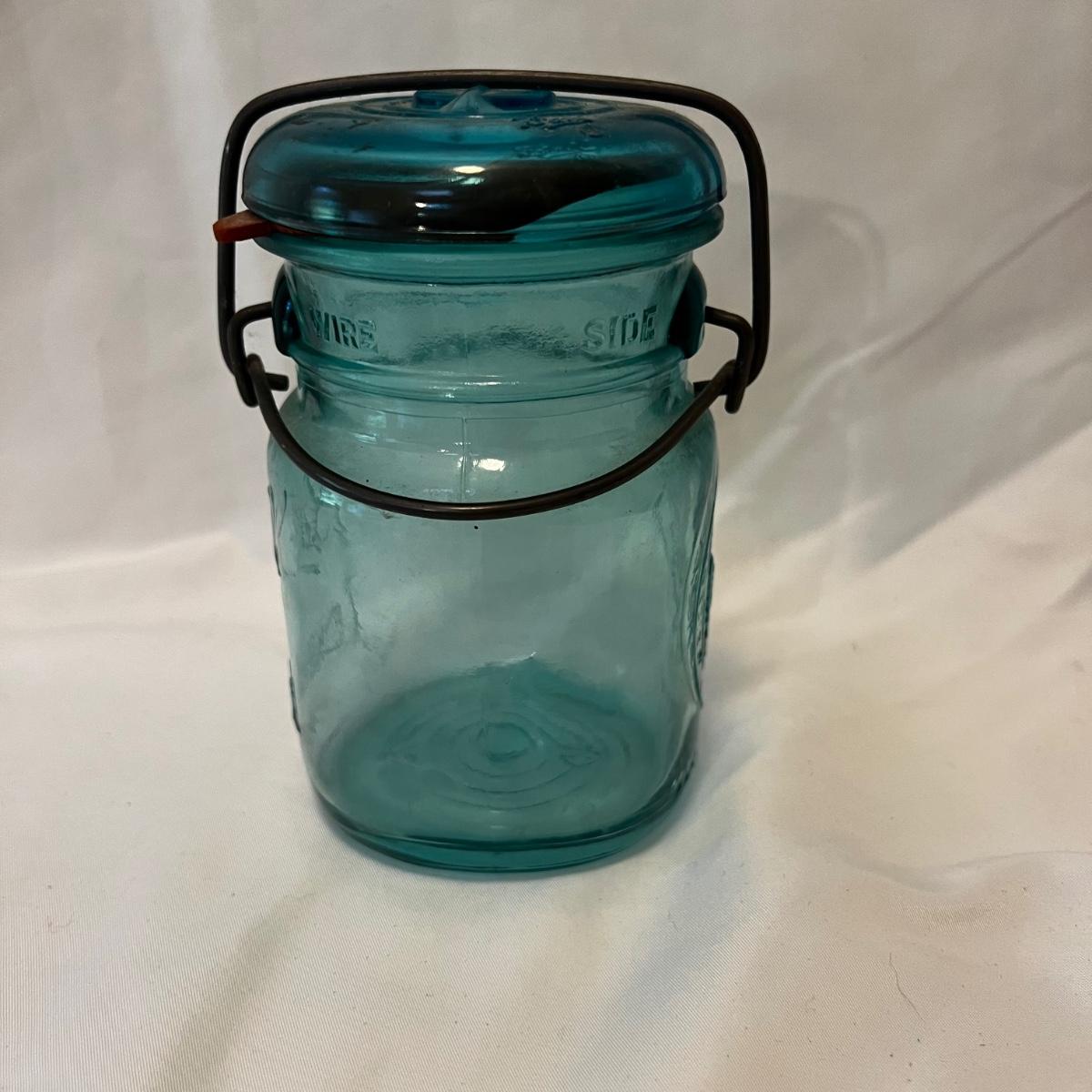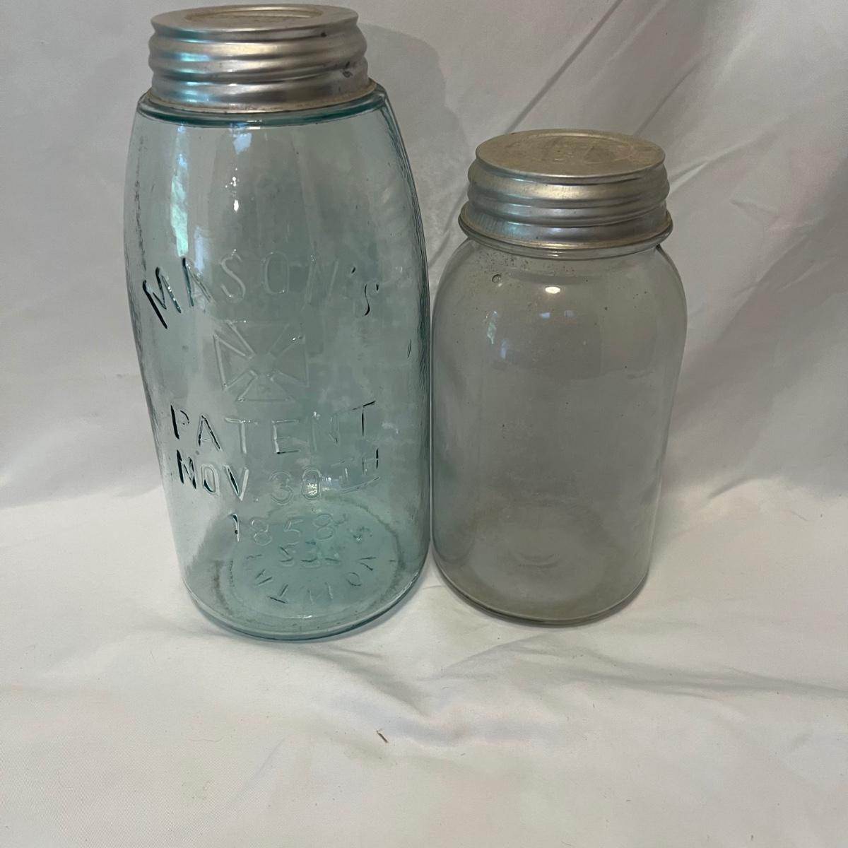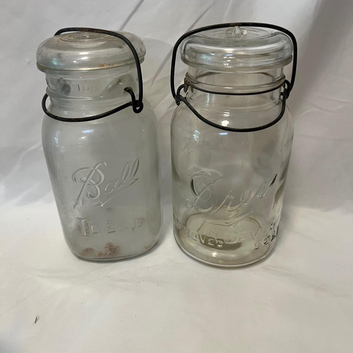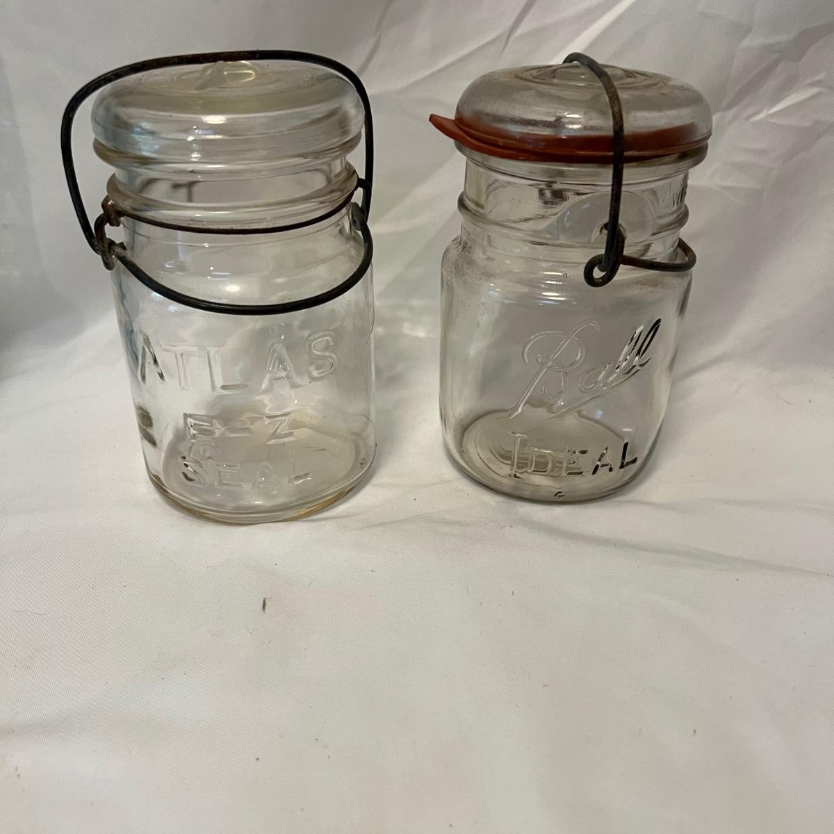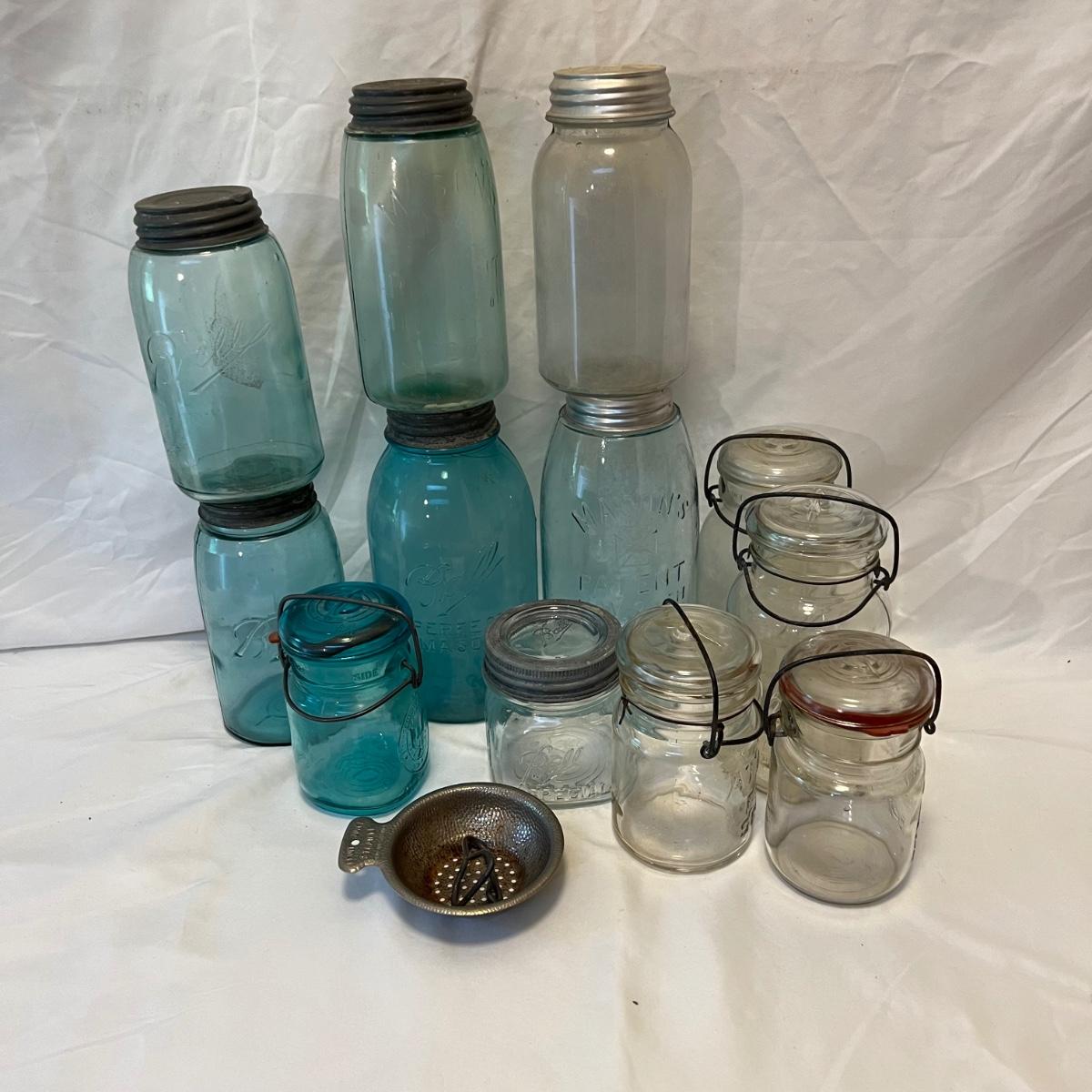 Twelve vintage canning jars. Four appear to have zinc lids and five have clamp close lids. Also included is a metal fruit strainer.