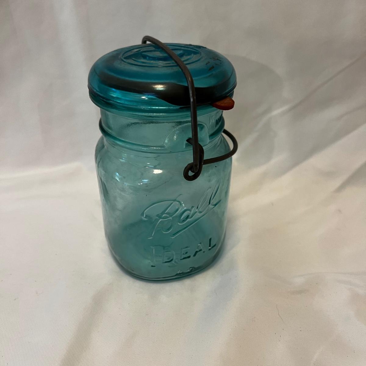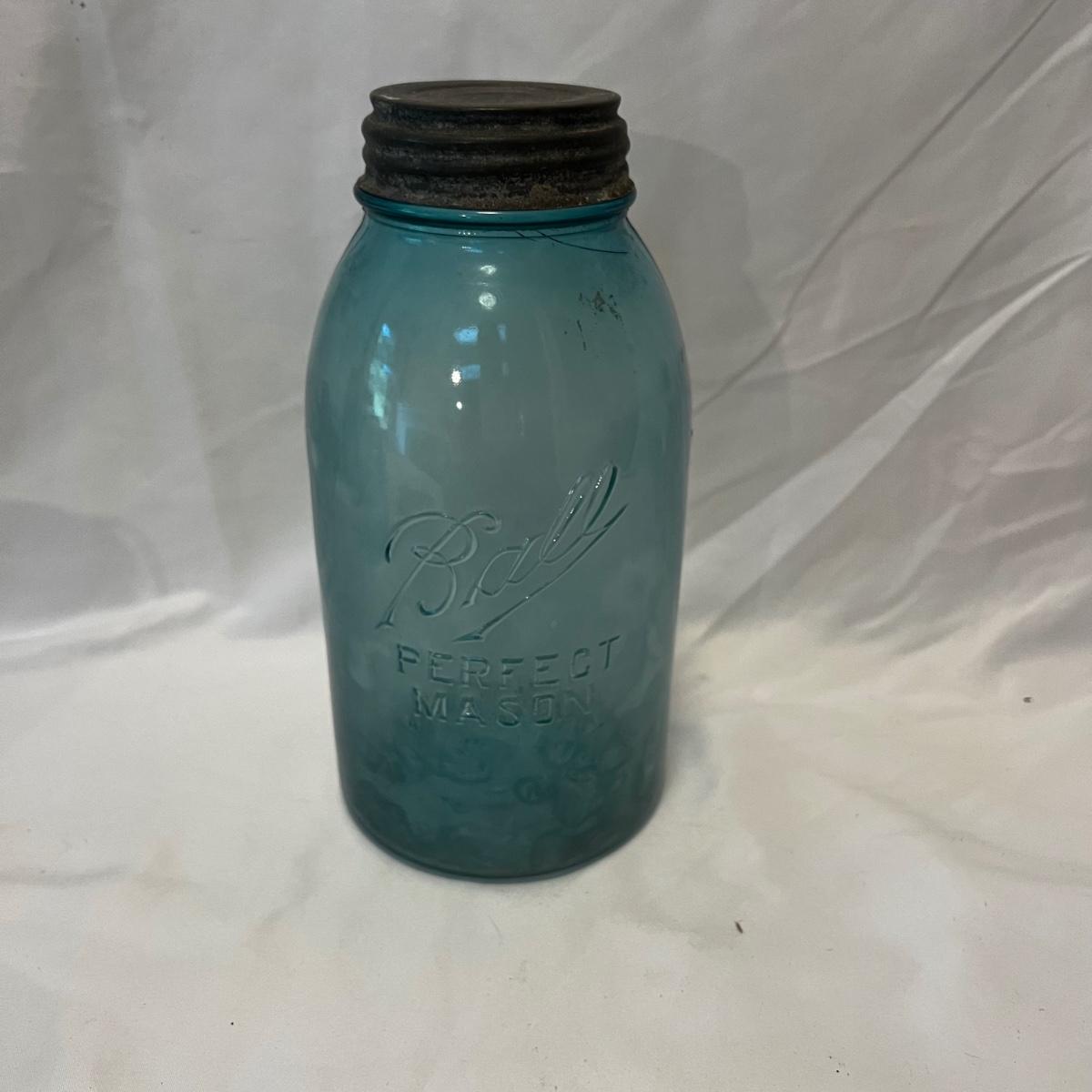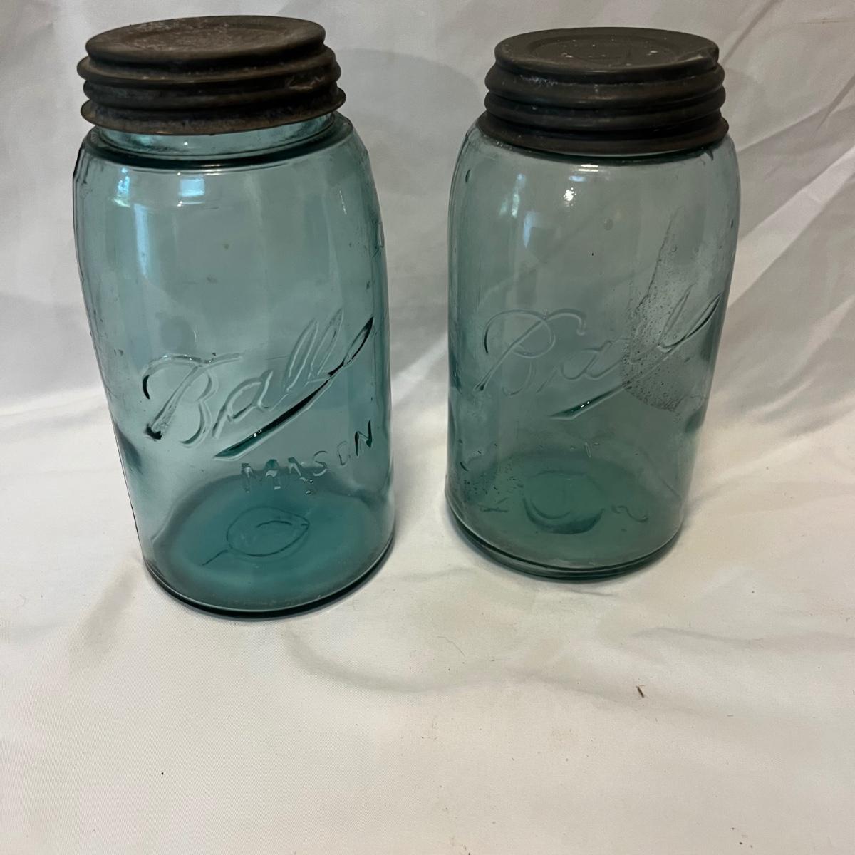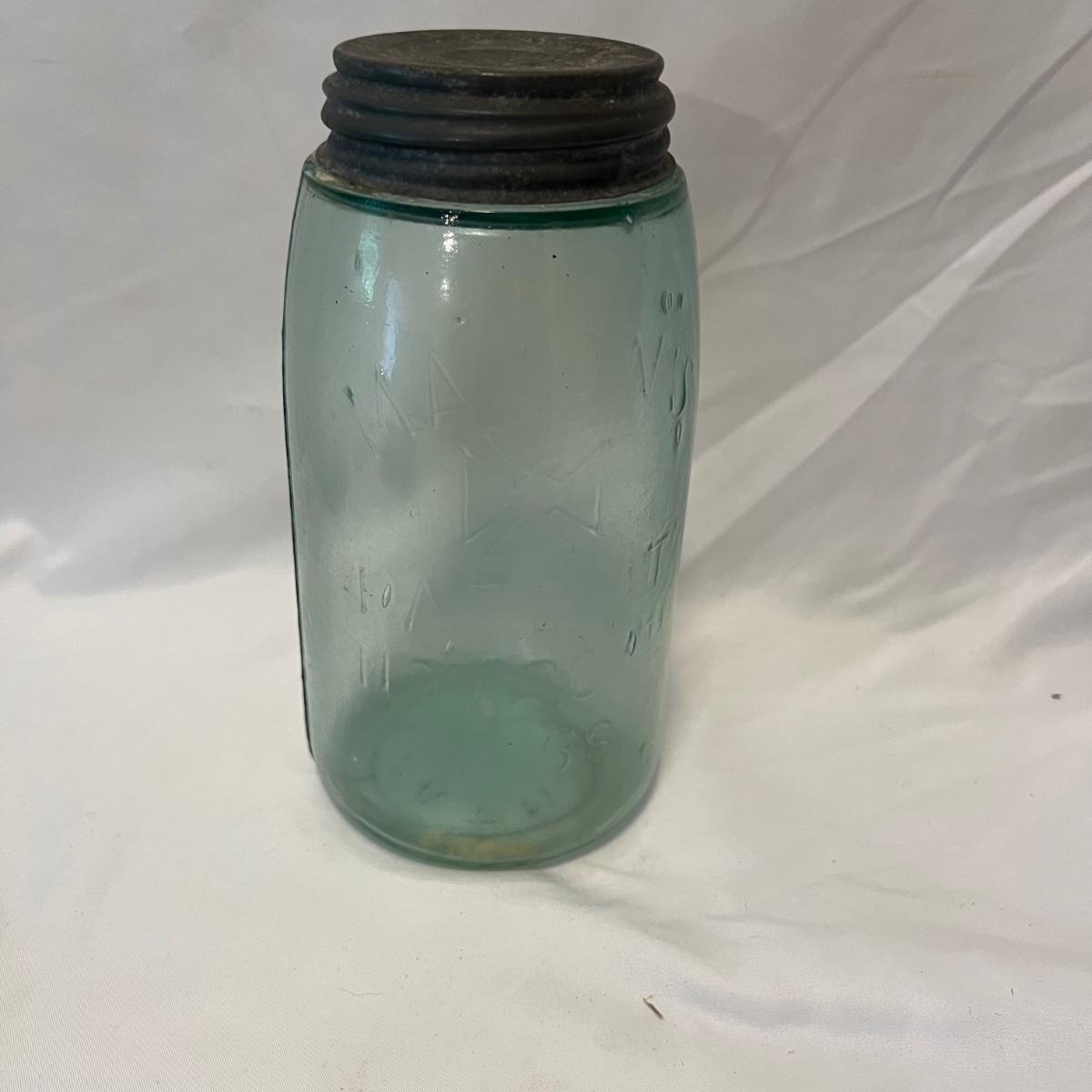Twelve vintage canning jars. Four appear to have zinc lids and five have clamp close lids. Also included is a metal fruit strainer.