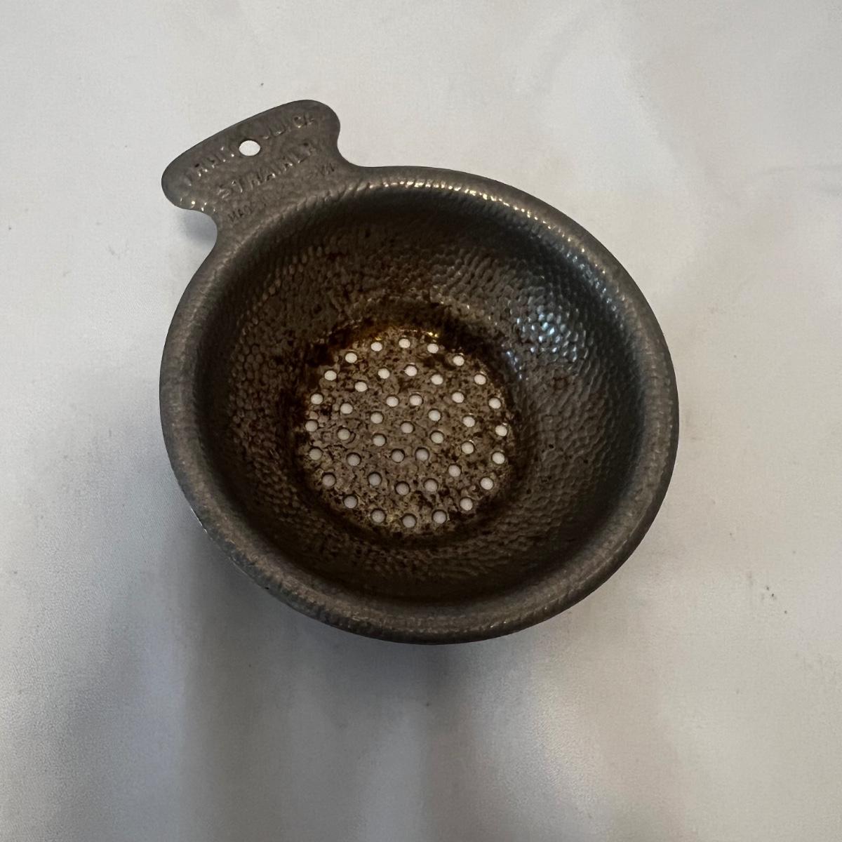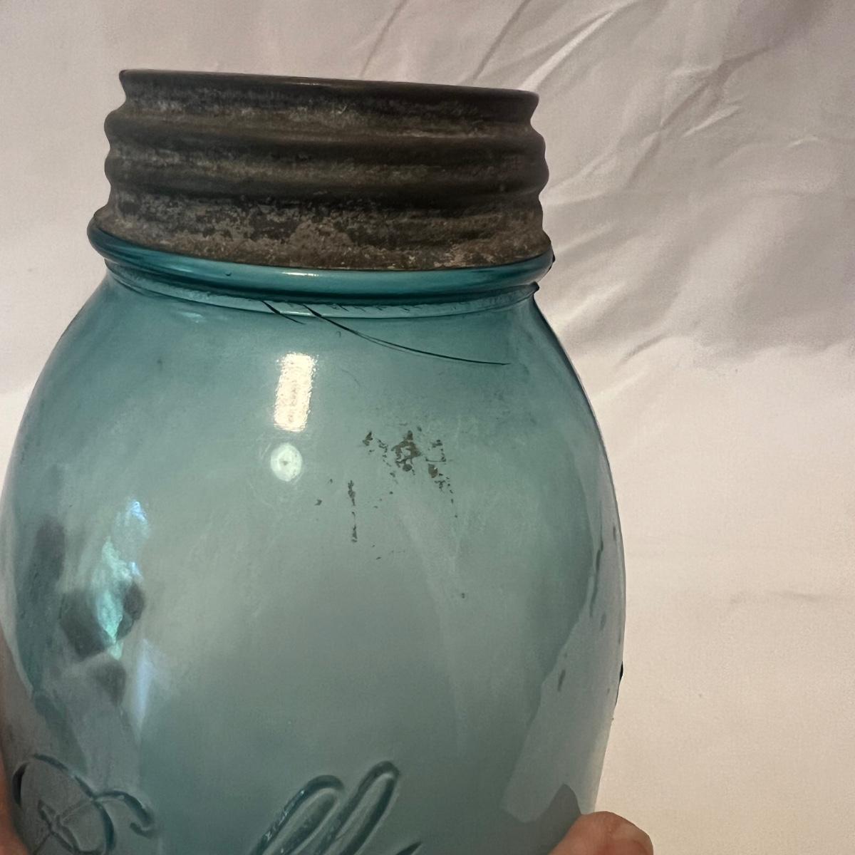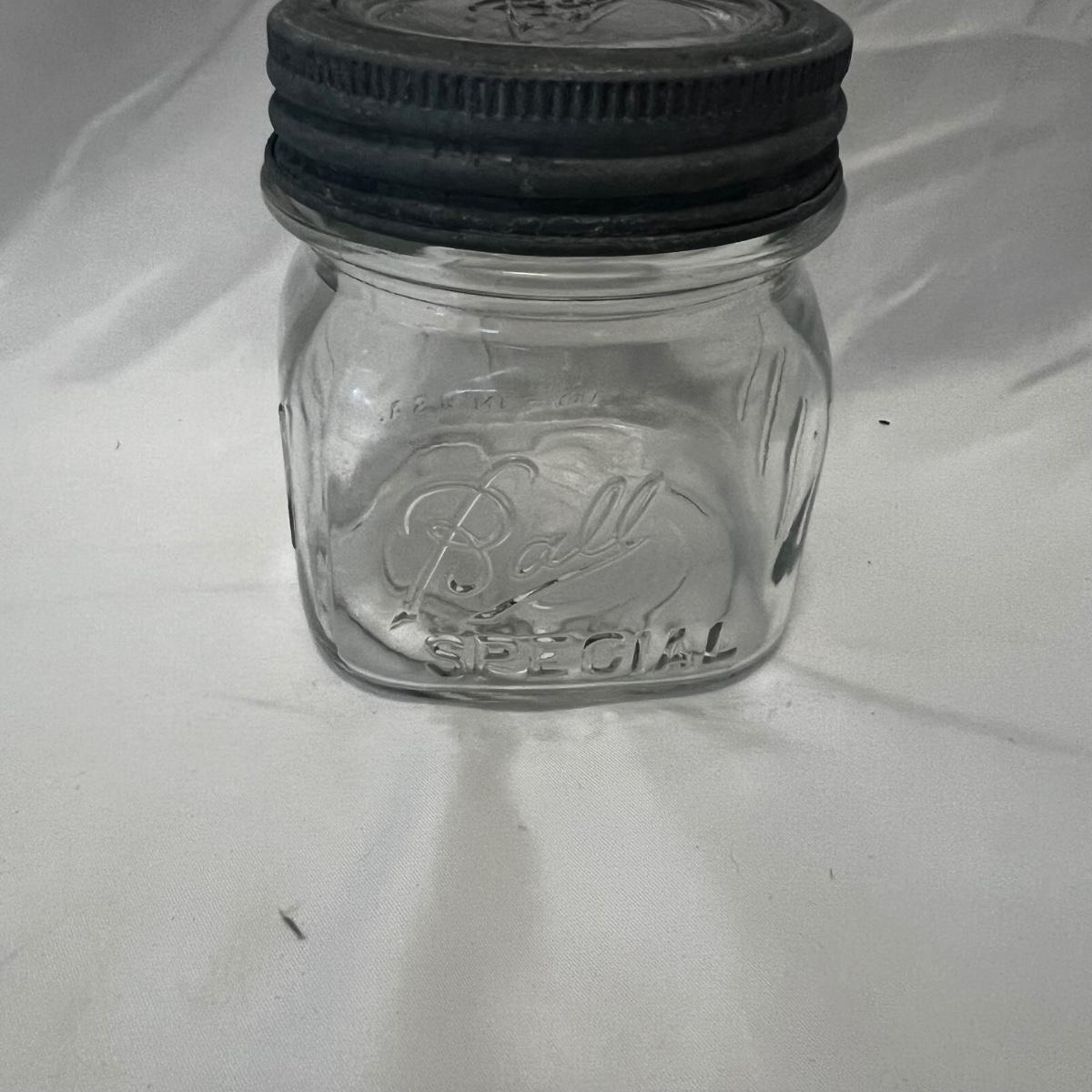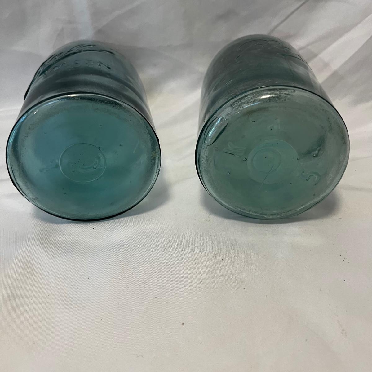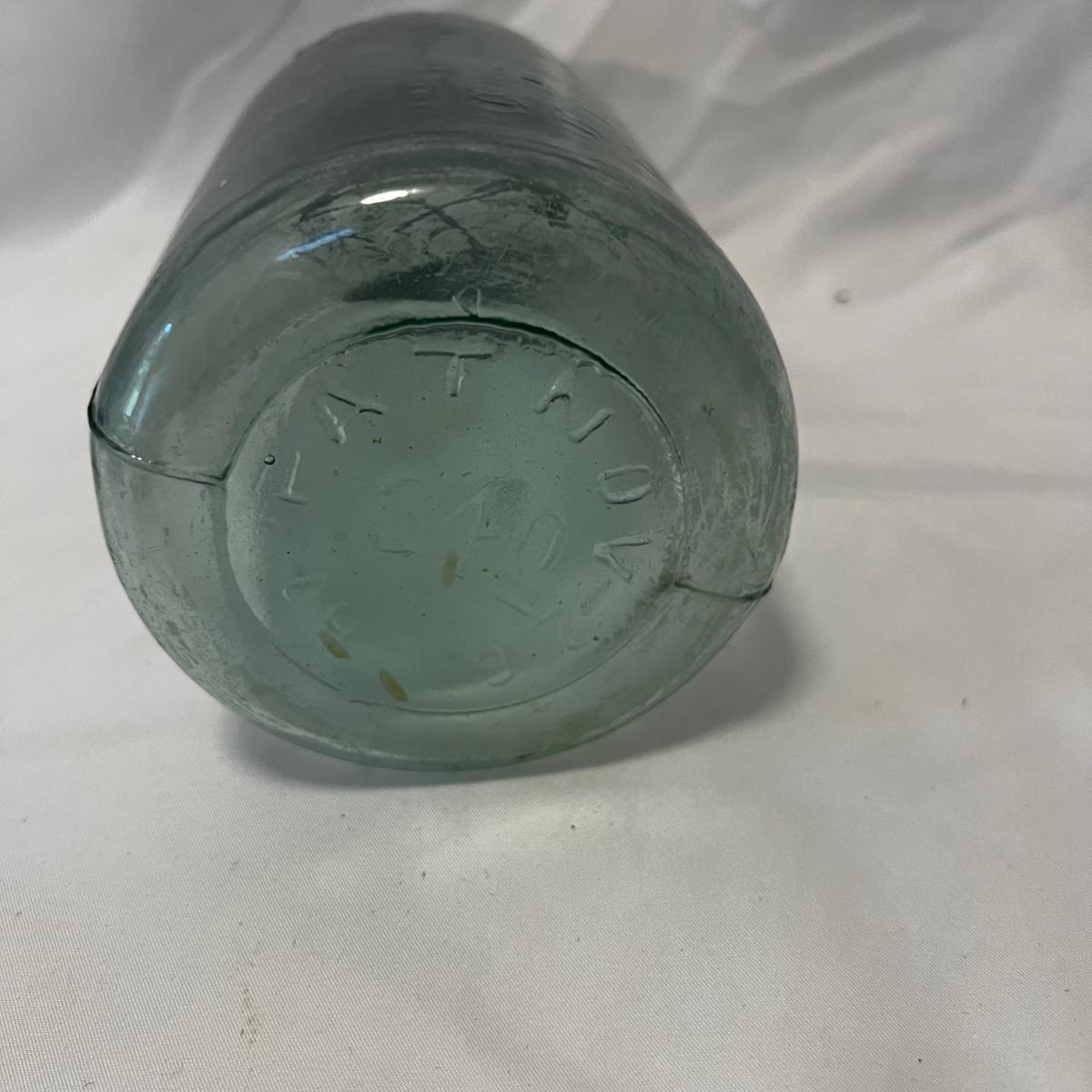 Twelve vintage canning jars. Four appear to have zinc lids and five have clamp close lids. Also included is a metal fruit strainer.
