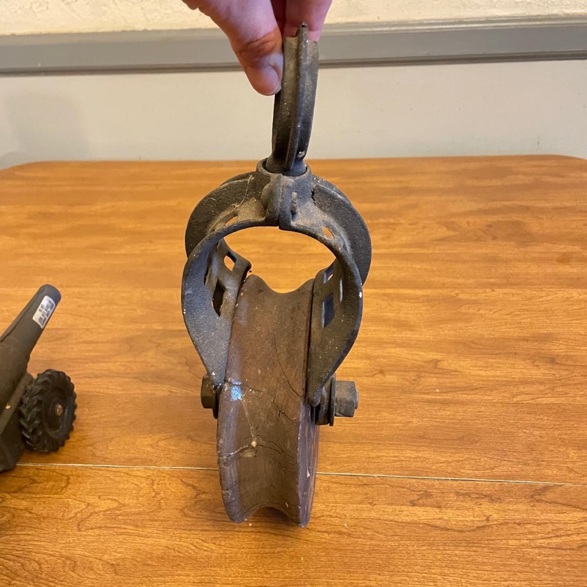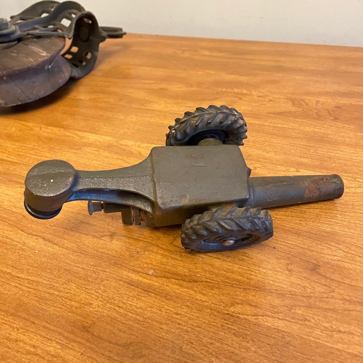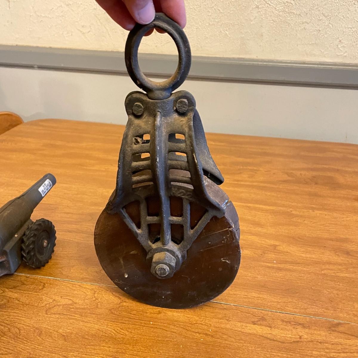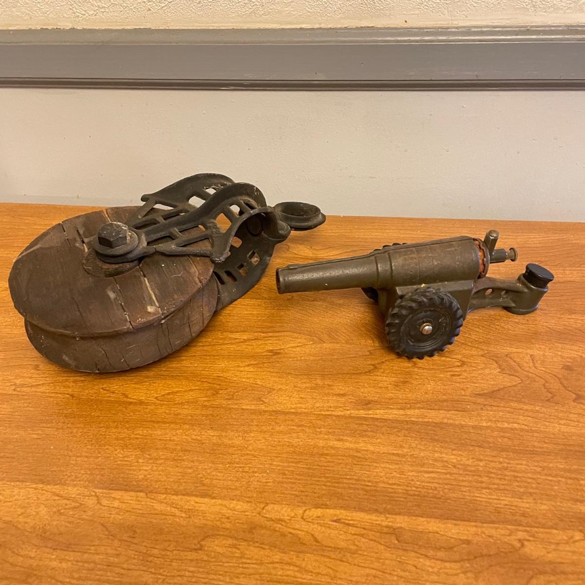Two vintage pieces. A 9” x 3” cast iron cannon with hard rubber wheels and a wooden wheel and cast iron pulley (marked 22) that is 12” long. See images. An antique iron was added to this lot that measures 4” x 6” x 5”. Shipping available.