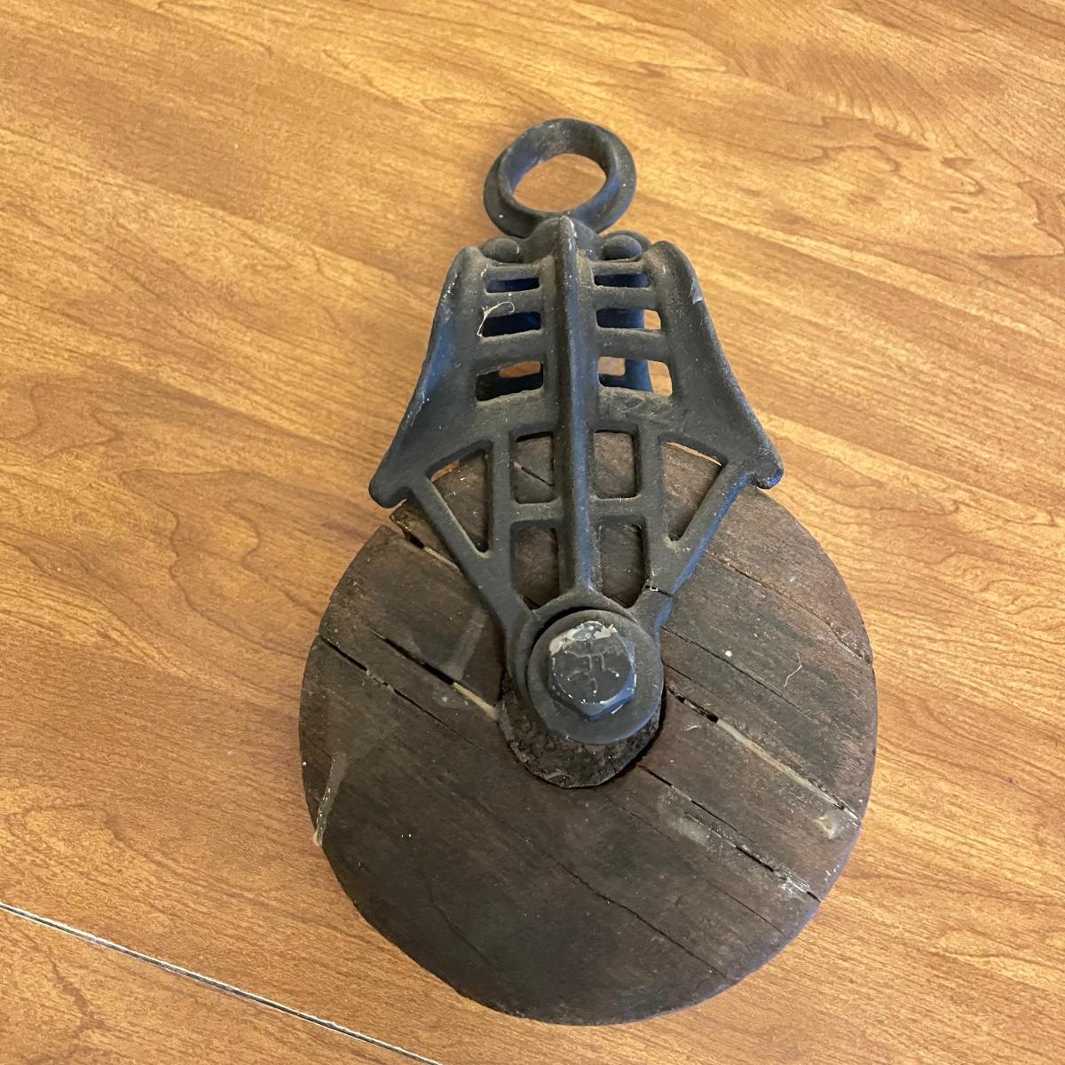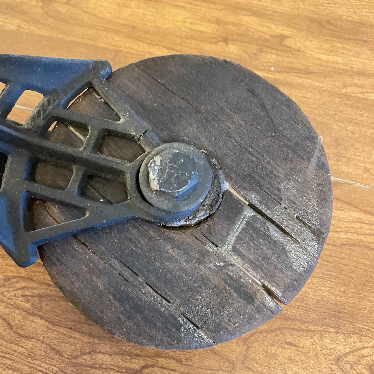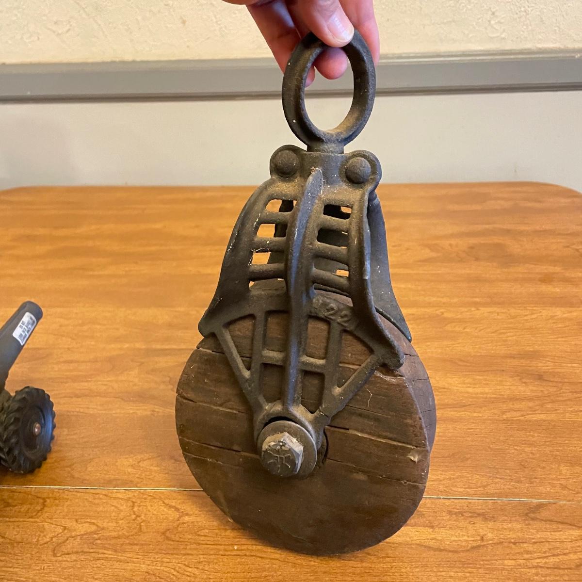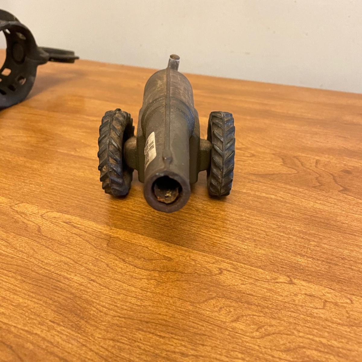 Two vintage pieces. A 9” x 3” cast iron cannon with hard rubber wheels and a wooden wheel and cast iron pulley (marked 22) that is 12” long. See images. An antique iron was added to this lot that measures 4” x 6” x 5”. Shipping available.