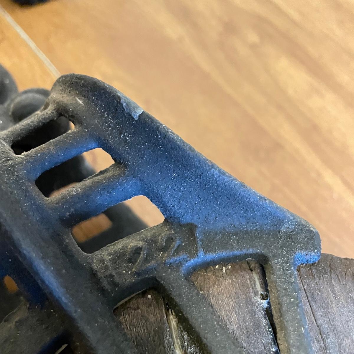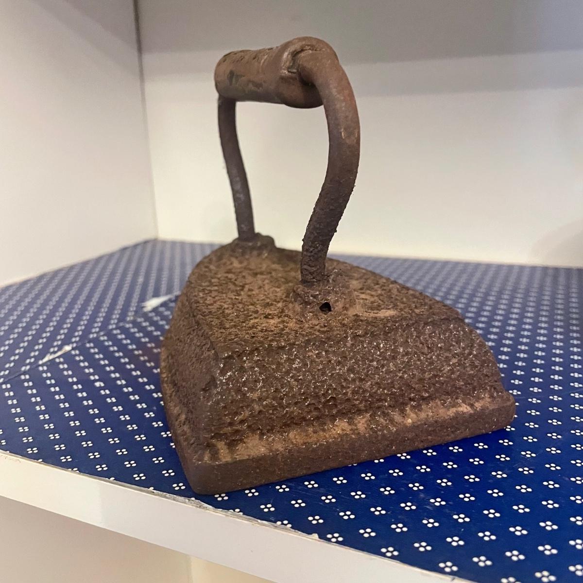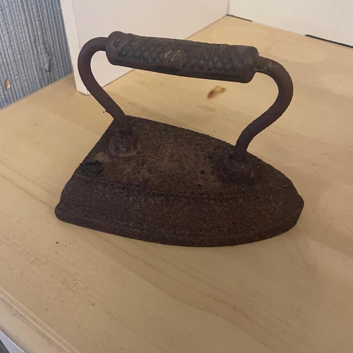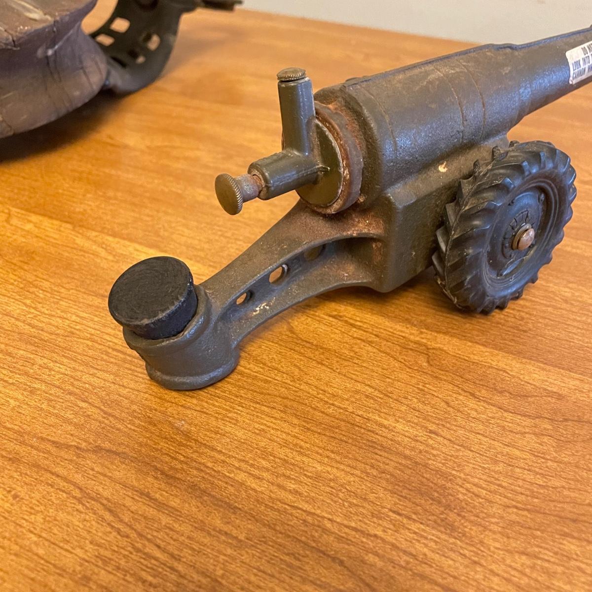 Two vintage pieces. A 9” x 3” cast iron cannon with hard rubber wheels and a wooden wheel and cast iron pulley (marked 22) that is 12” long. See images. An antique iron was added to this lot that measures 4” x 6” x 5”. Shipping available.