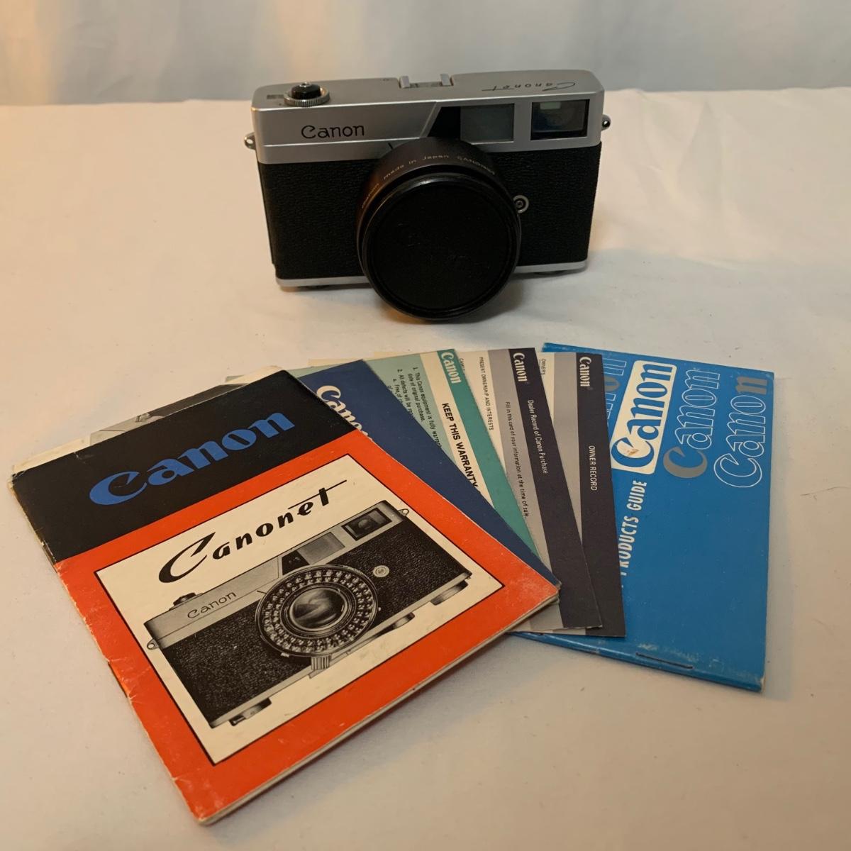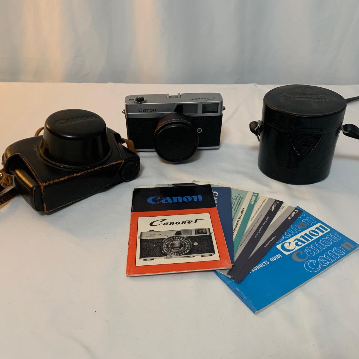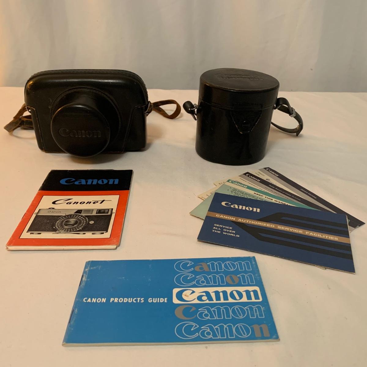 Canon Canonet Camera, made in Japan with Canon SE 45mm lens. Camera comes with case, extra lens case, and original owners manual. The camera has small crack in viewfinder, but this will not appear in developed photographs. Please note, lot does not include additional lens. What an iconic piece! Shipping available.