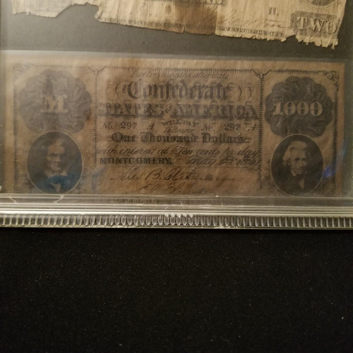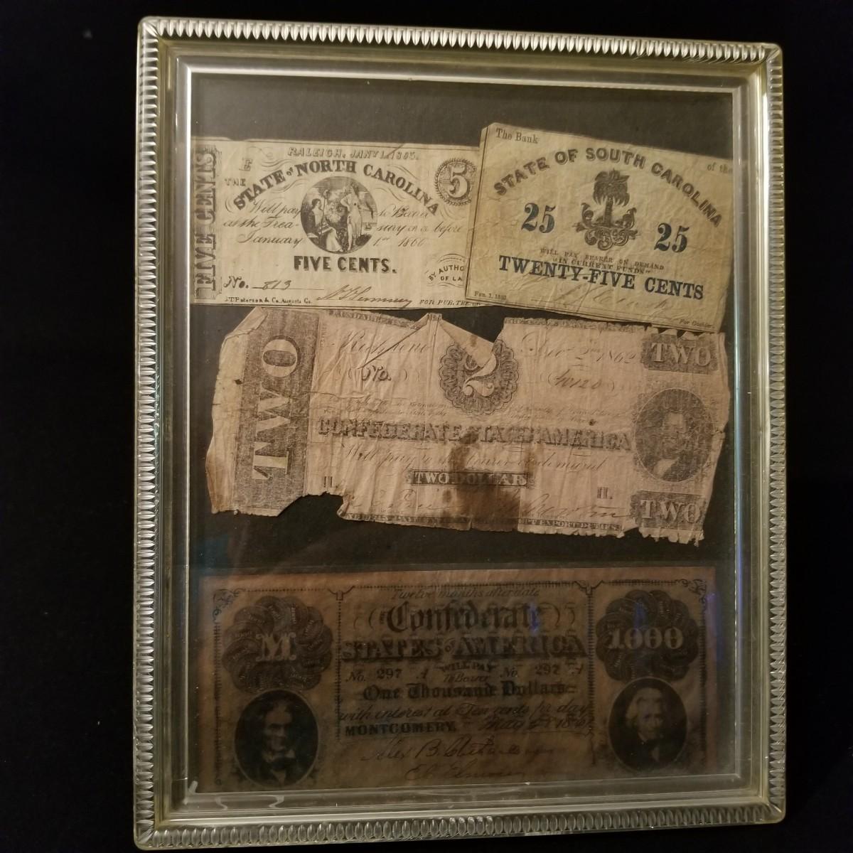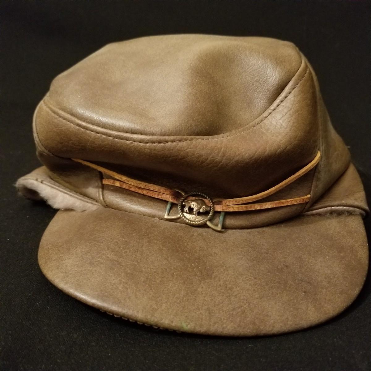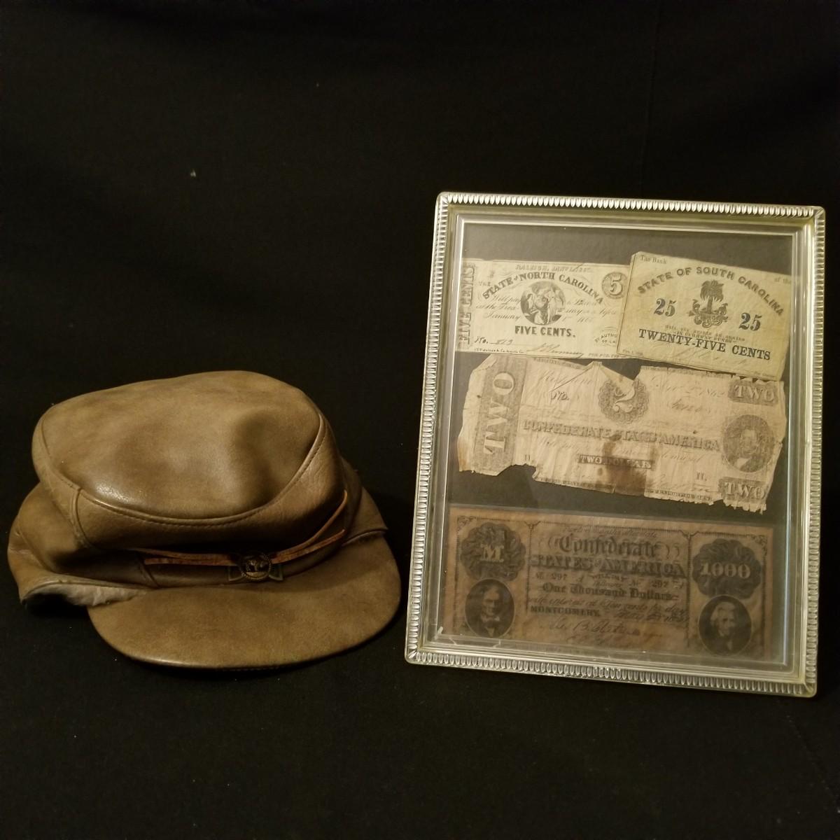 A vintage leather cap with fold down ear flaps. Buffalo emblem on leather cord at front. Inside brim is corduroy. Approximately size 7 ?. Also four pieces of vintage paper money in plastic frame, 9" x11". One North Carolina 5 cent note, one South Carolina 25 cent note. A $2 bill marked Confederate States of America, and a $1000 bill marked the same. No guarantee of authenticity, these items are well worn and some are tattered. See photos for details. Shipping available. No returns.