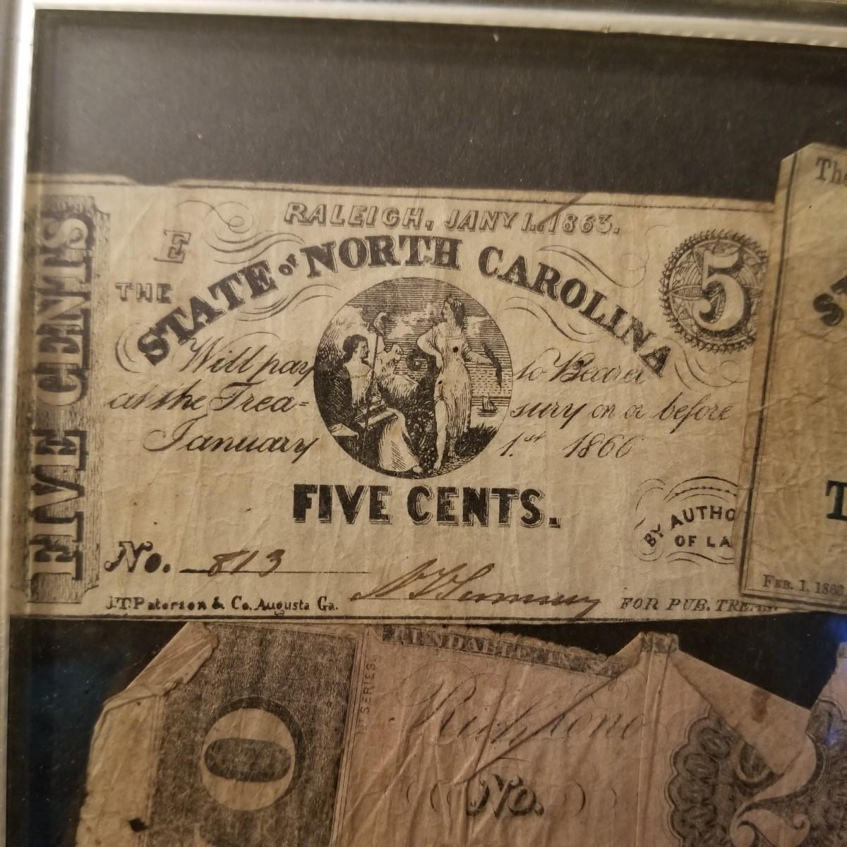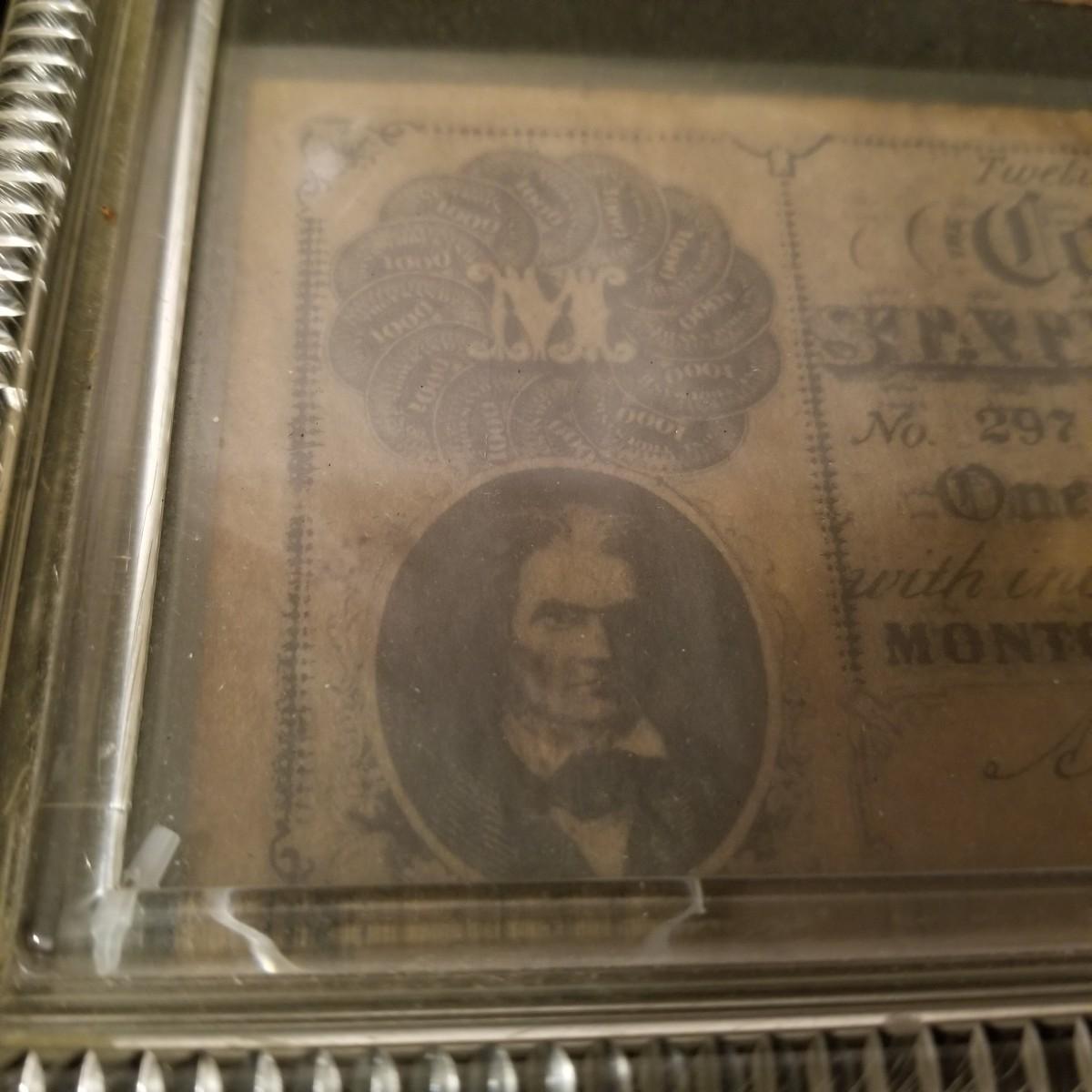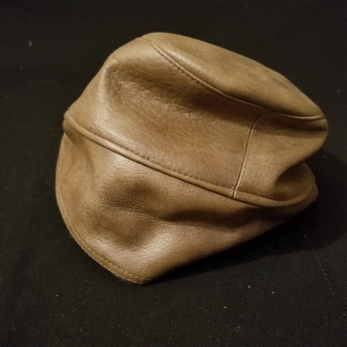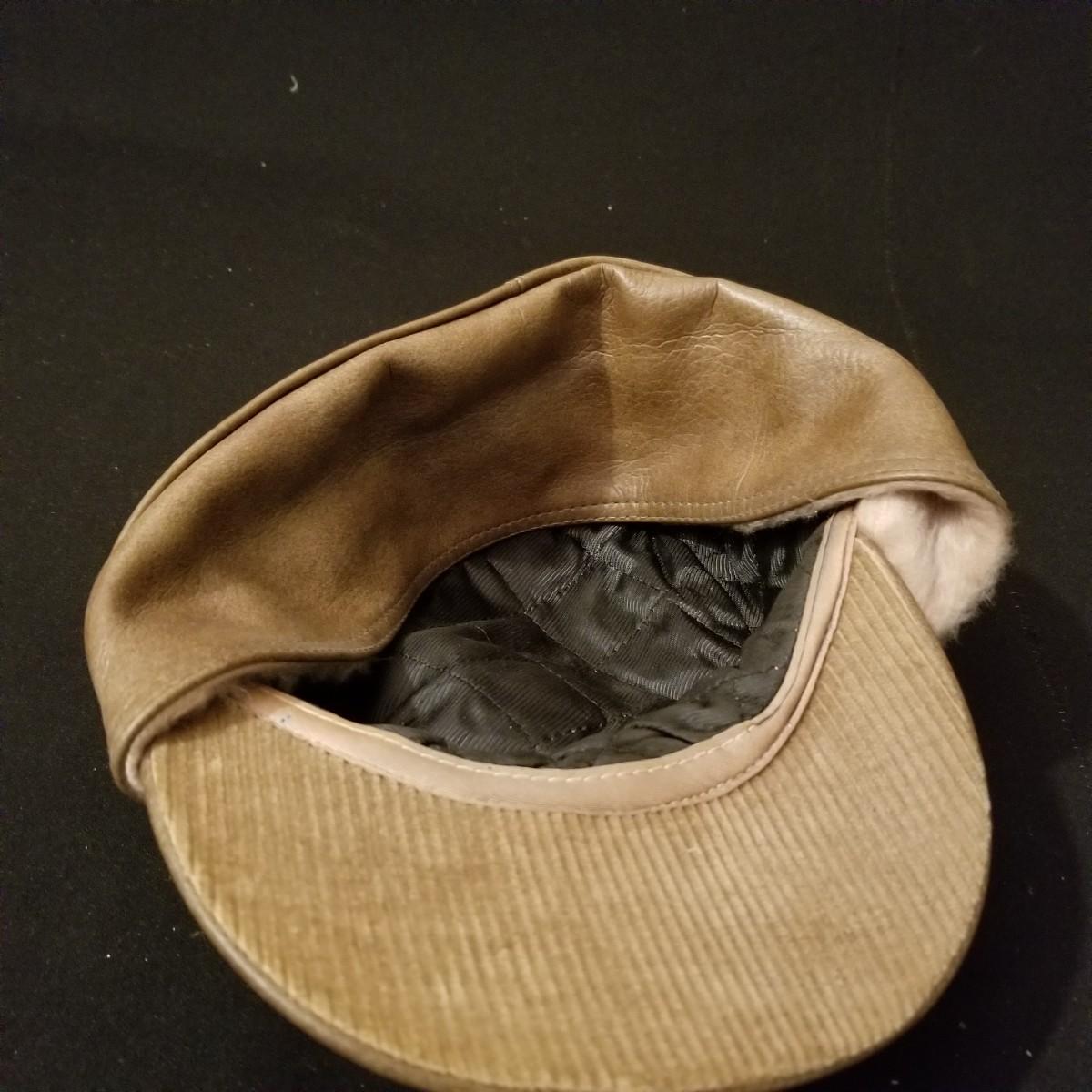 A vintage leather cap with fold down ear flaps. Buffalo emblem on leather cord at front. Inside brim is corduroy. Approximately size 7 ?. Also four pieces of vintage paper money in plastic frame, 9" x11". One North Carolina 5 cent note, one South Carolina 25 cent note. A $2 bill marked Confederate States of America, and a $1000 bill marked the same. No guarantee of authenticity, these items are well worn and some are tattered. See photos for details. Shipping available. No returns.
