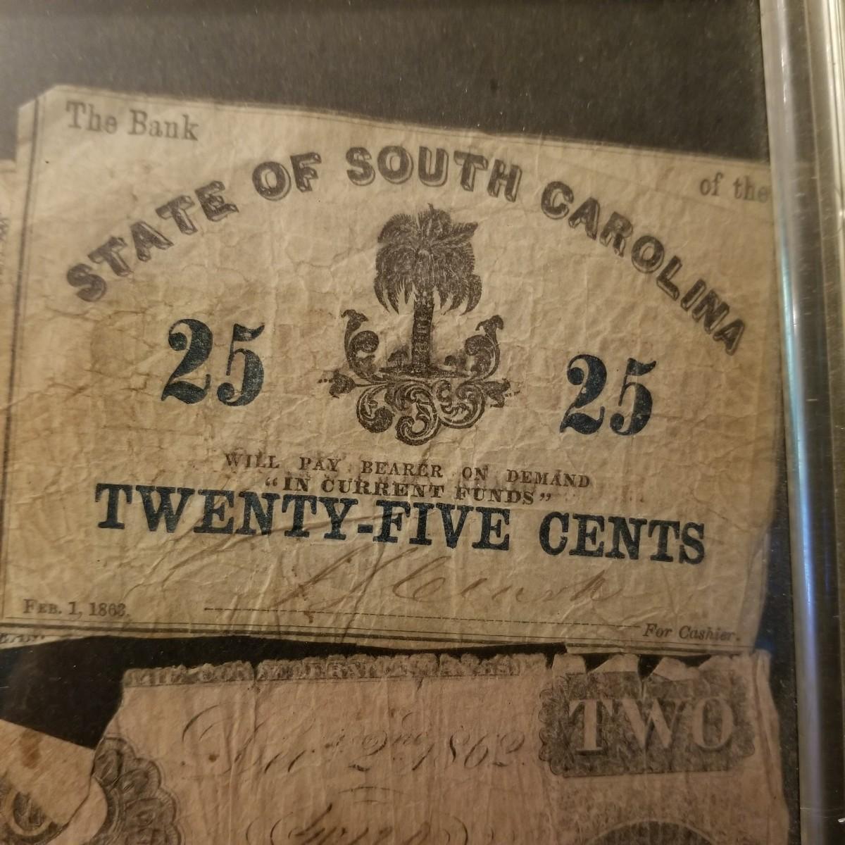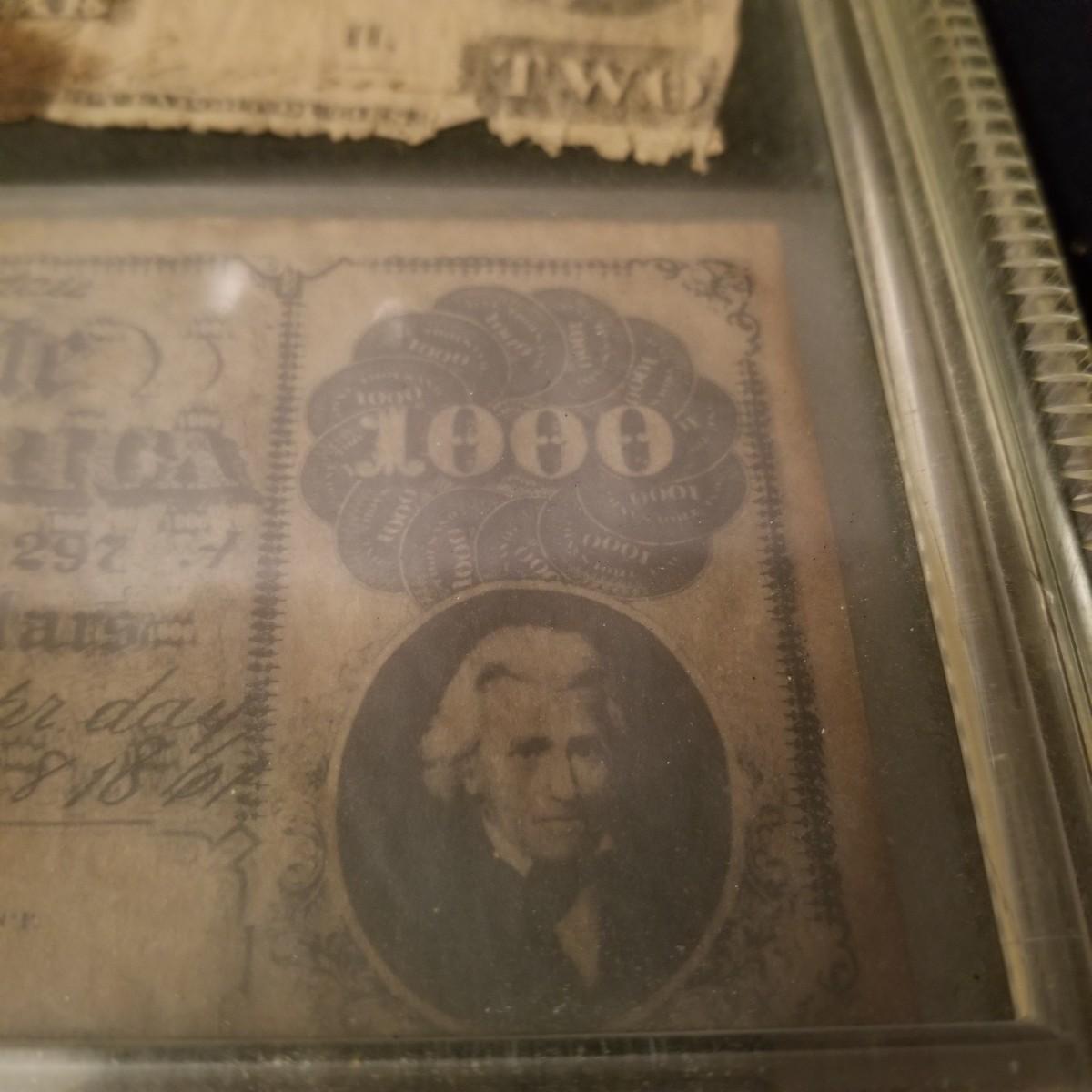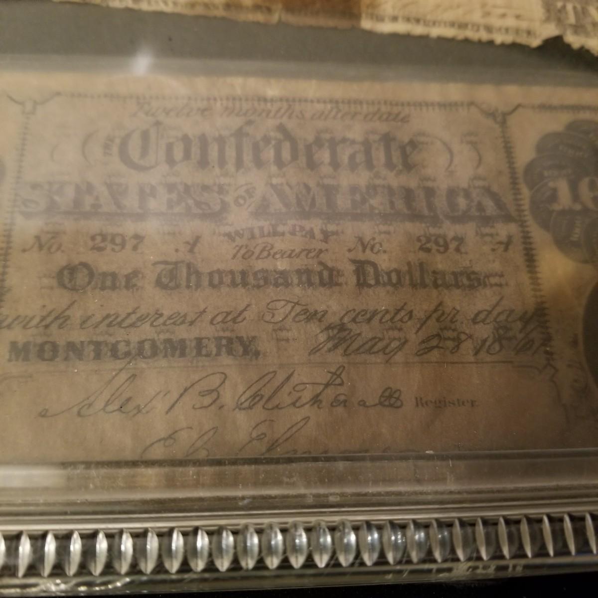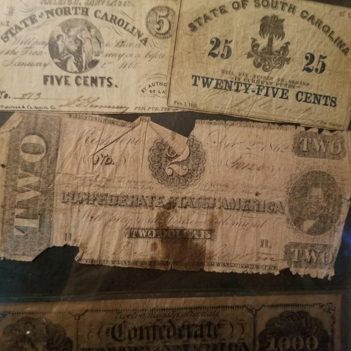 A vintage leather cap with fold down ear flaps. Buffalo emblem on leather cord at front. Inside brim is corduroy. Approximately size 7 ?. Also four pieces of vintage paper money in plastic frame, 9" x11". One North Carolina 5 cent note, one South Carolina 25 cent note. A $2 bill marked Confederate States of America, and a $1000 bill marked the same. No guarantee of authenticity, these items are well worn and some are tattered. See photos for details. Shipping available. No returns.