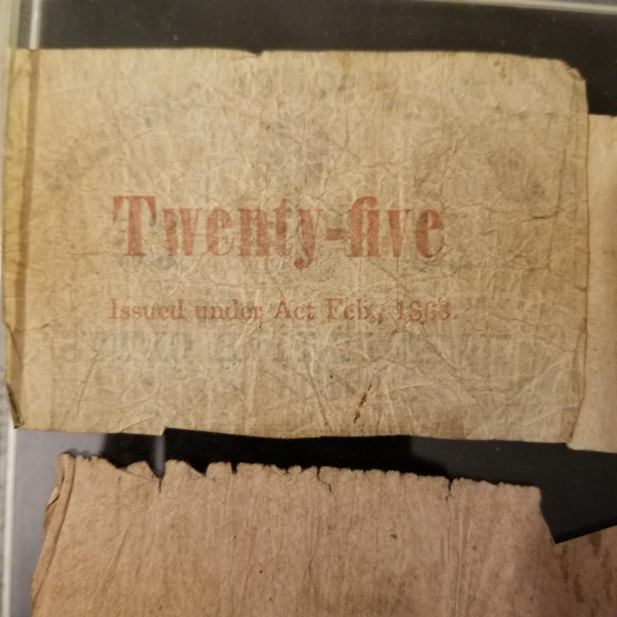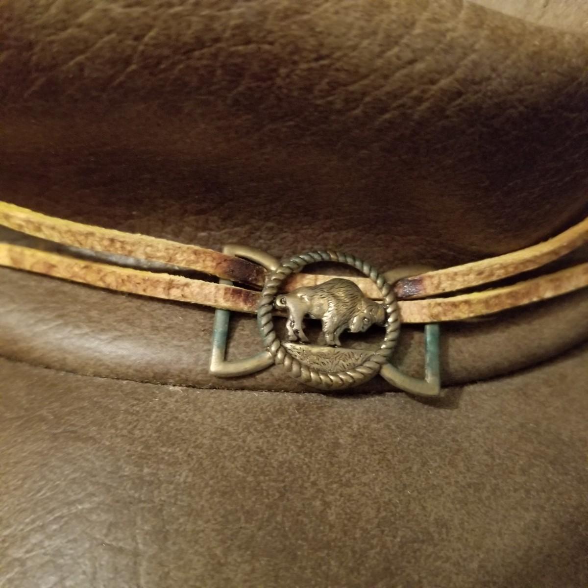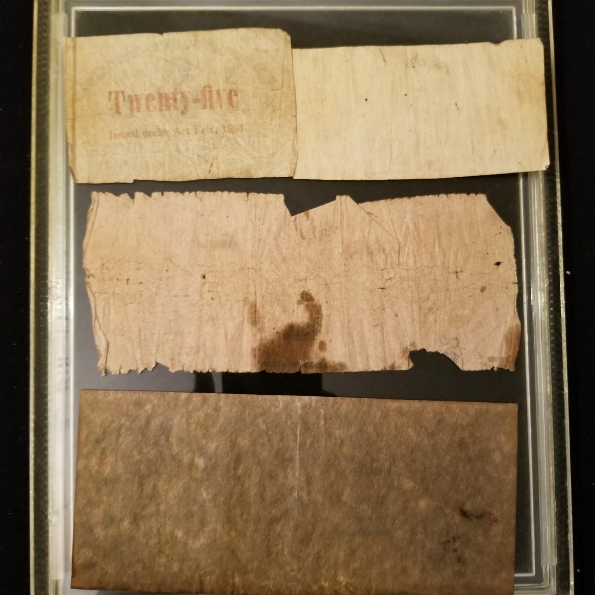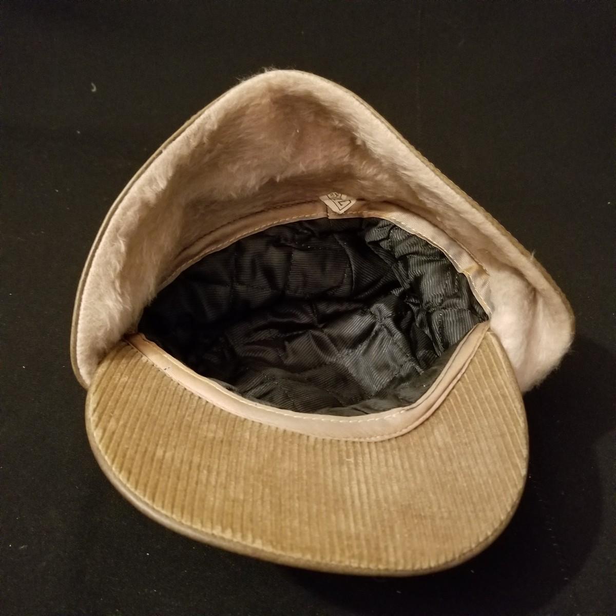 A vintage leather cap with fold down ear flaps. Buffalo emblem on leather cord at front. Inside brim is corduroy. Approximately size 7 ?. Also four pieces of vintage paper money in plastic frame, 9" x11". One North Carolina 5 cent note, one South Carolina 25 cent note. A $2 bill marked Confederate States of America, and a $1000 bill marked the same. No guarantee of authenticity, these items are well worn and some are tattered. See photos for details. Shipping available. No returns.